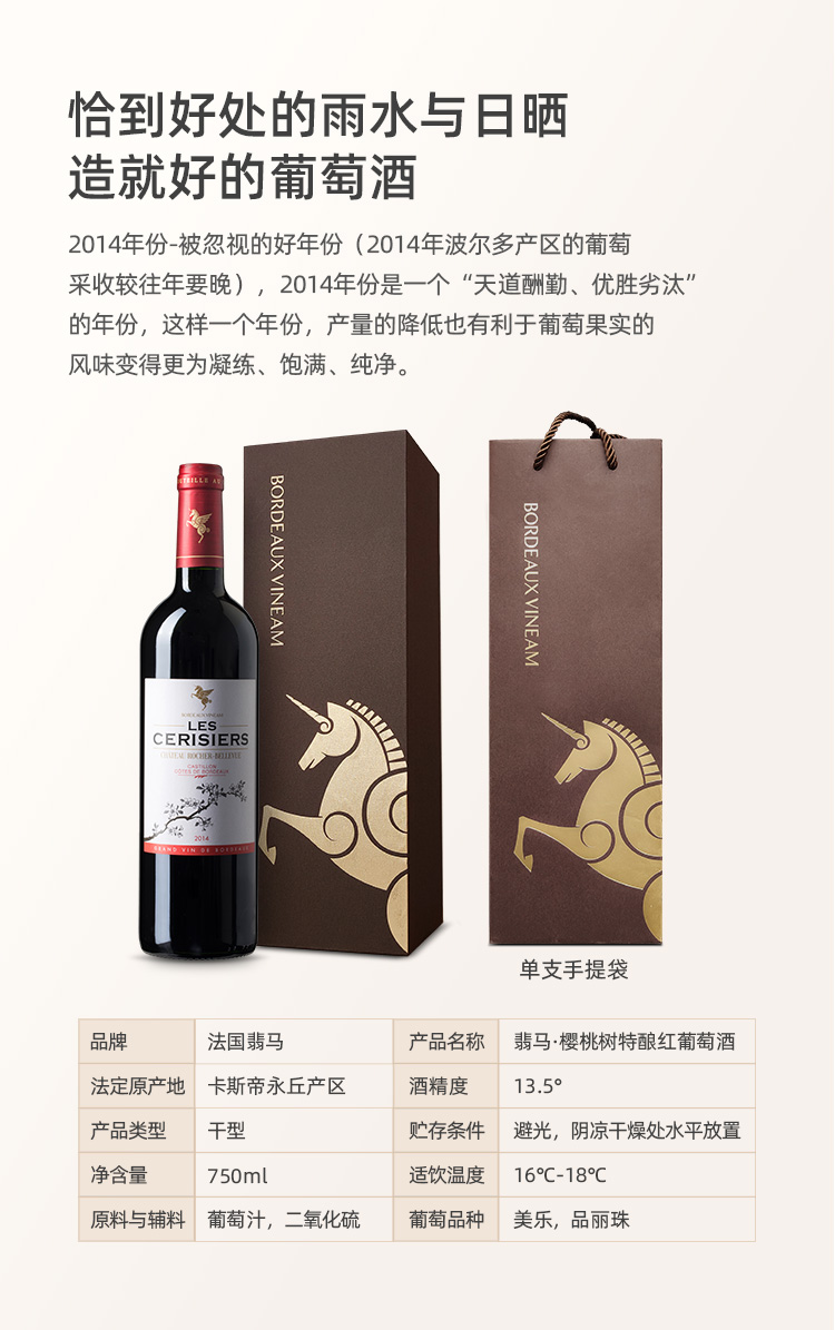 翡马 波尔多进口葡萄酒 樱桃树特酿干红礼盒 13.5度 750ml