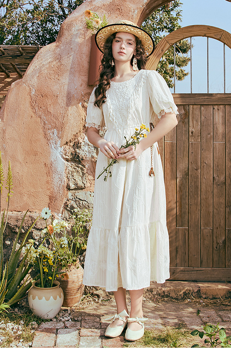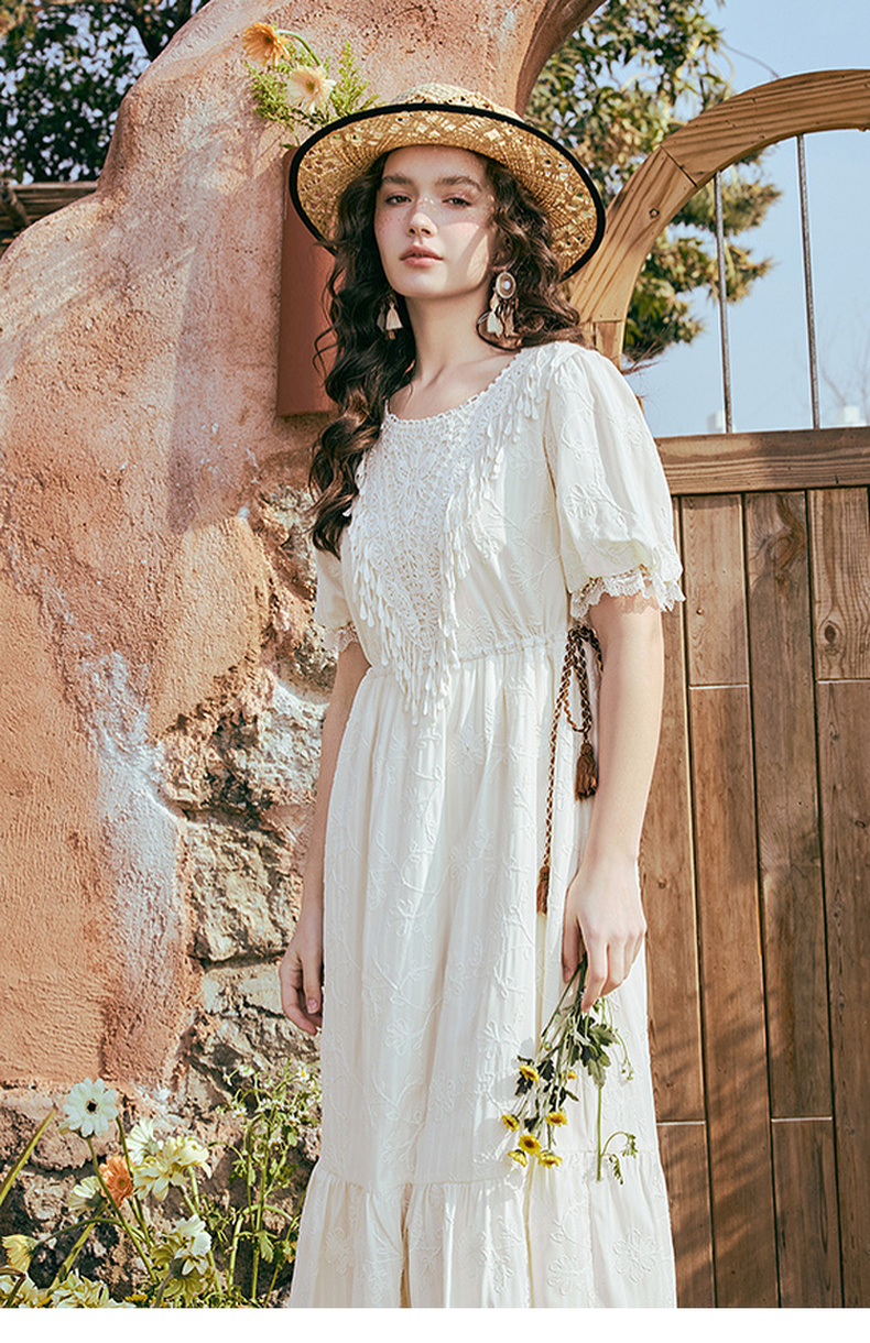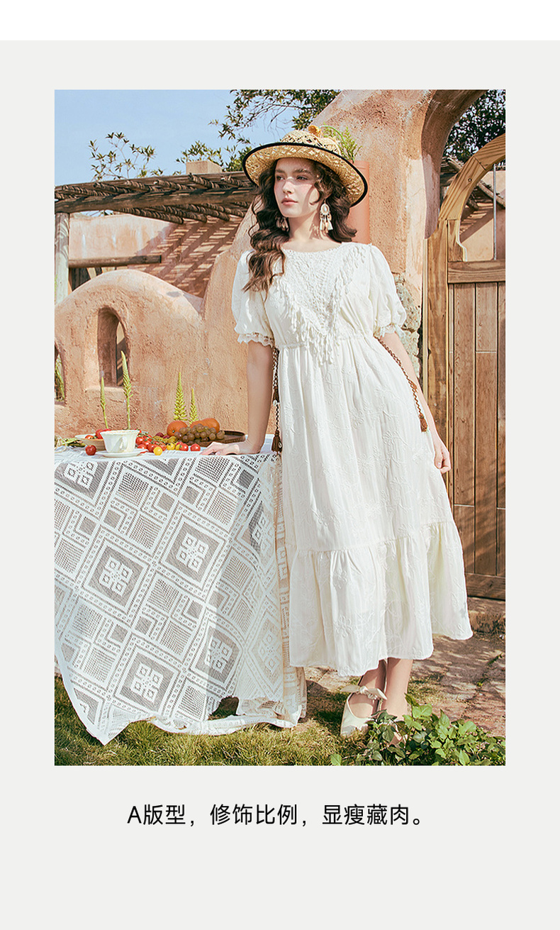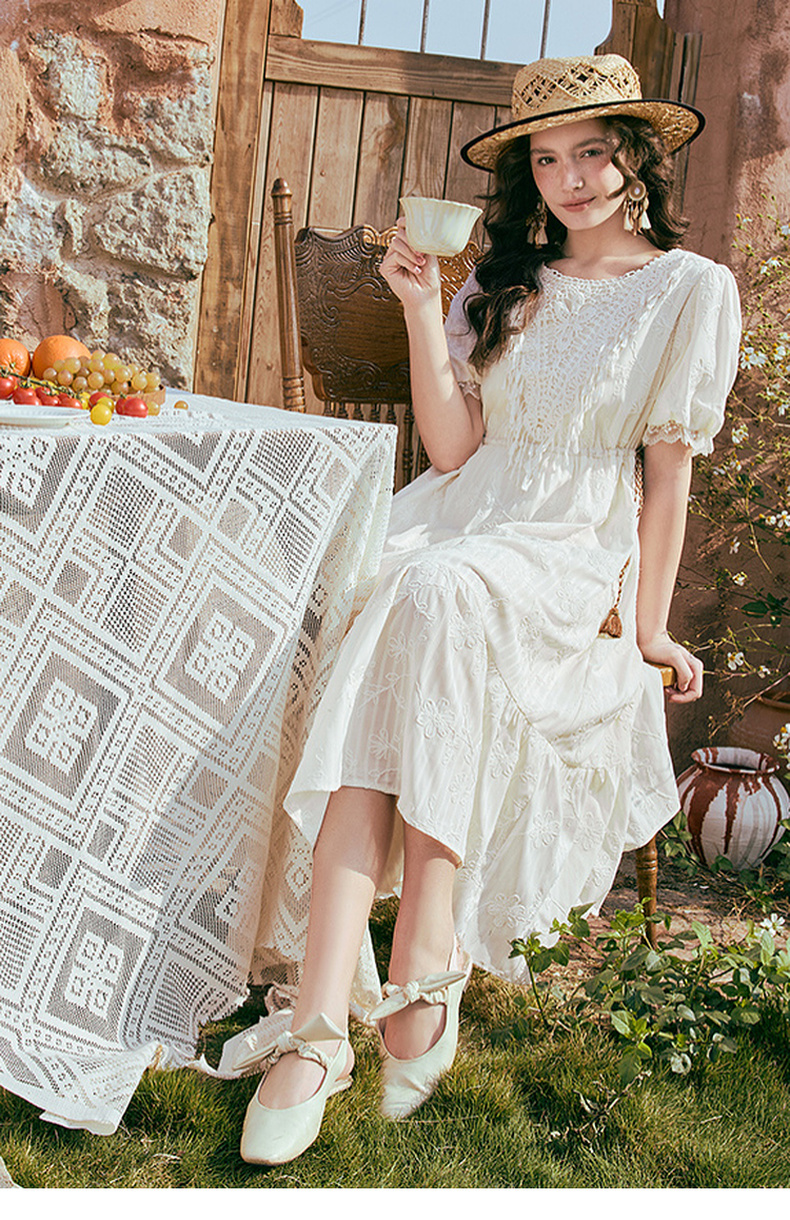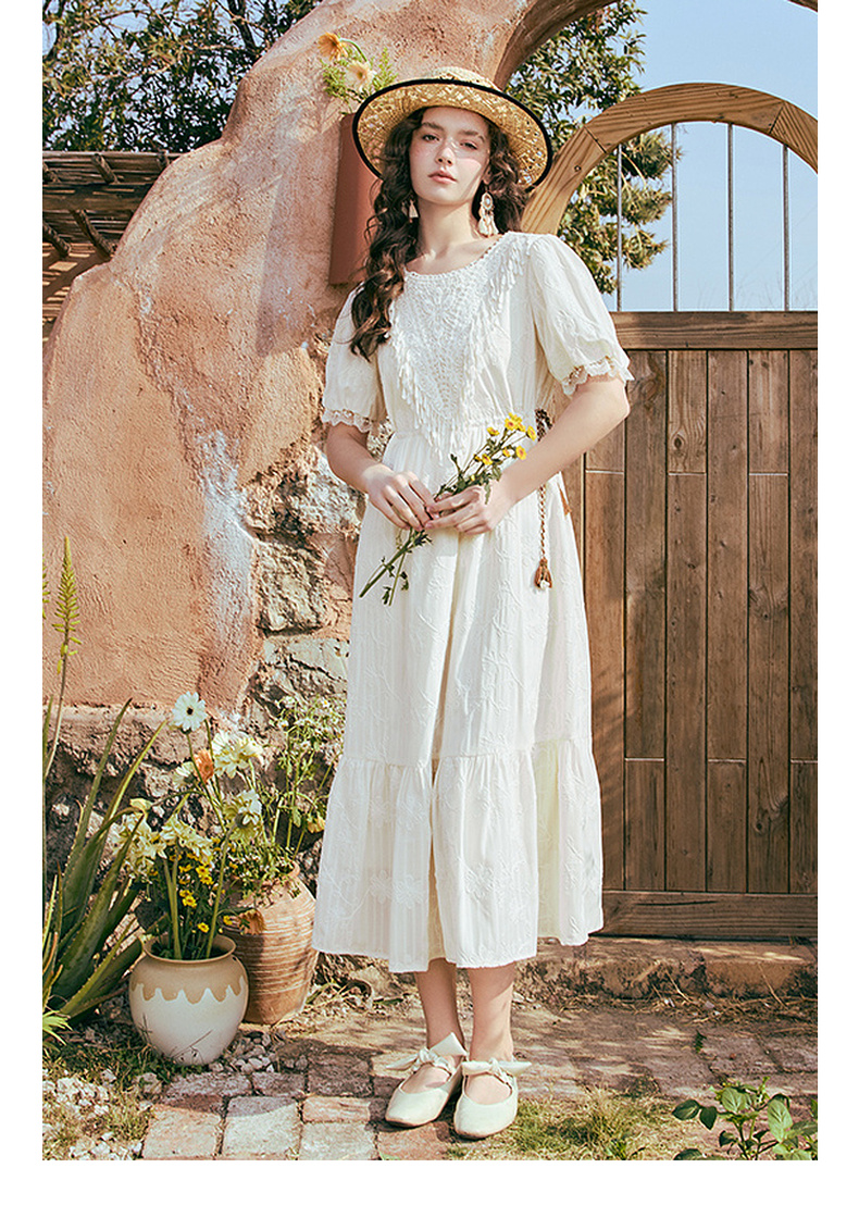两三事 藤雪漫歌 2025夏季新款复古绣花蕾丝泡泡袖绑带连衣裙