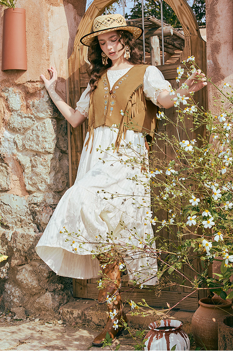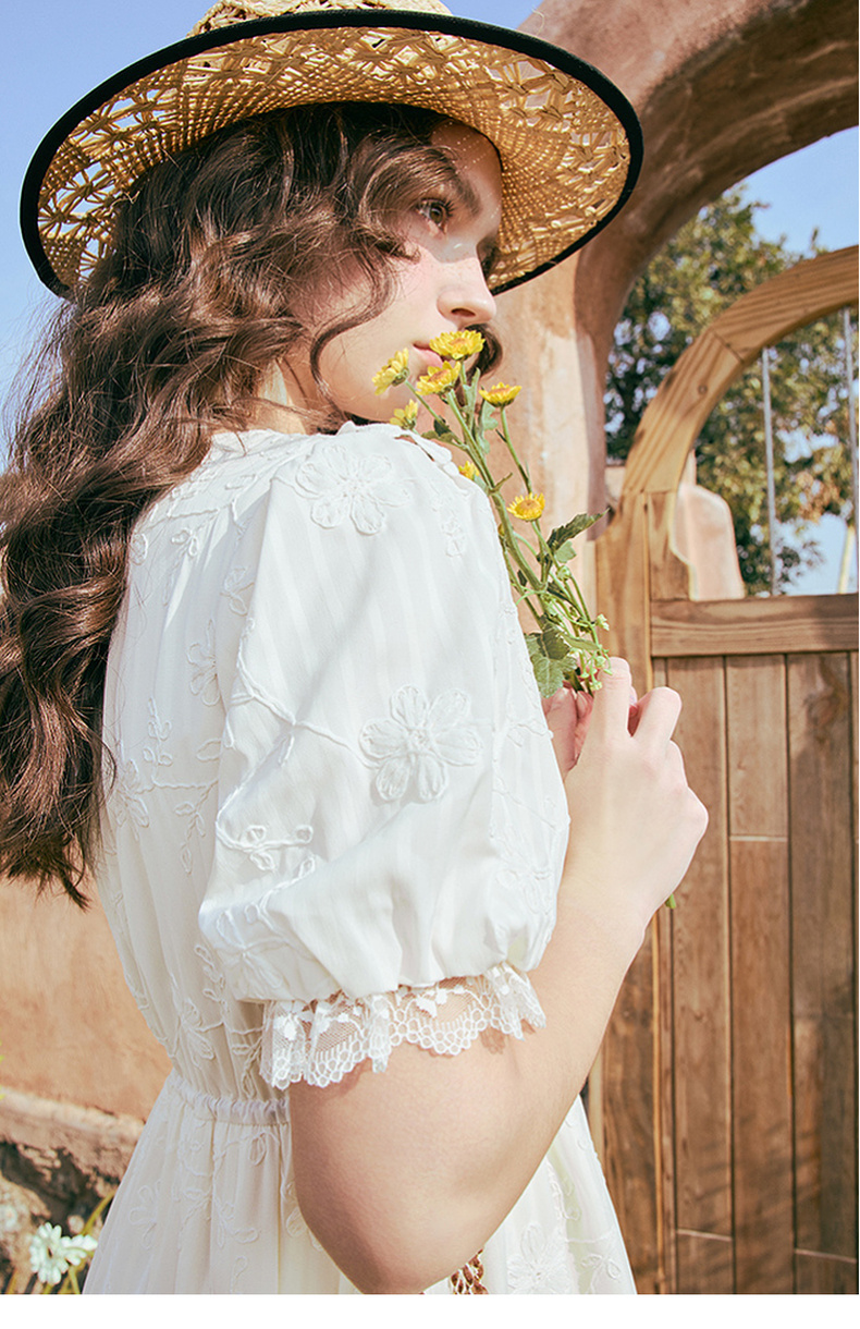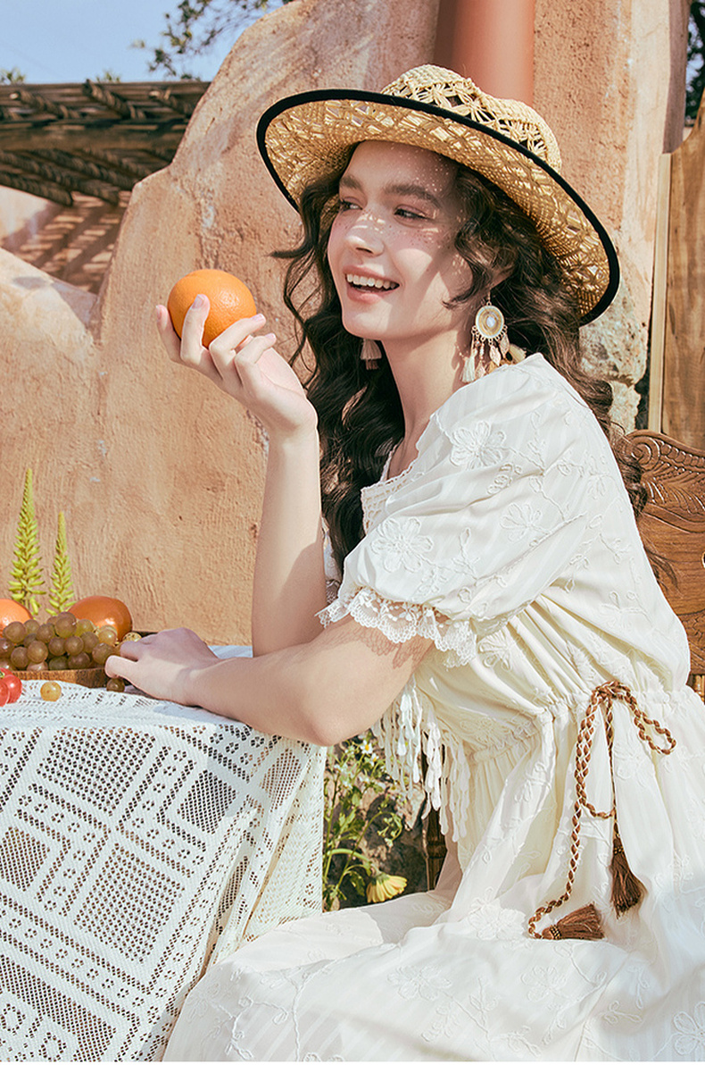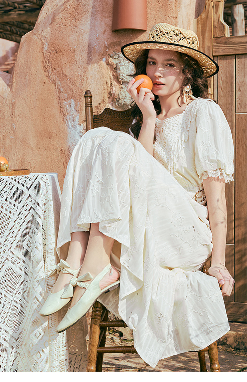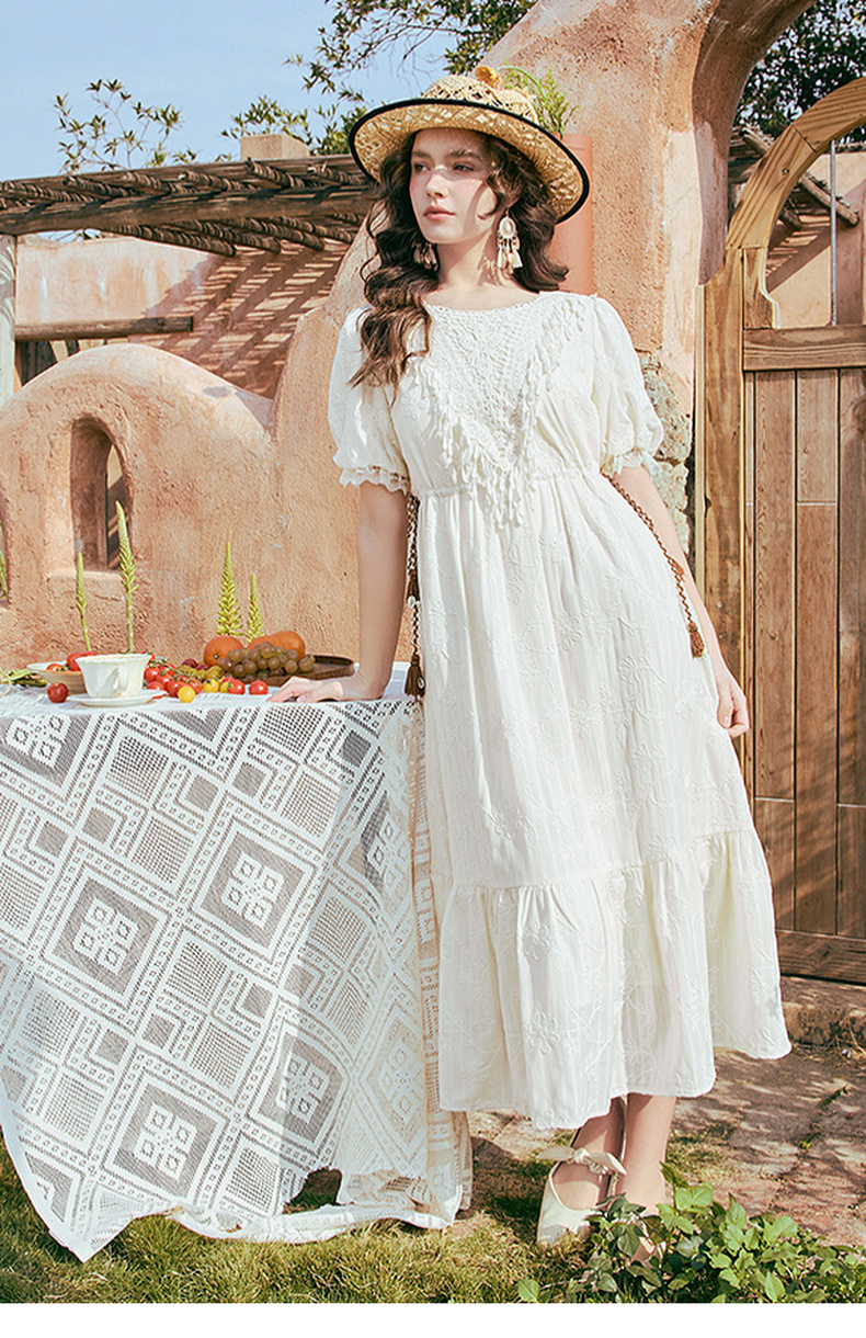 两三事 藤雪漫歌 2025夏季新款复古绣花蕾丝泡泡袖绑带连衣裙