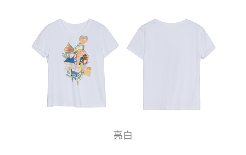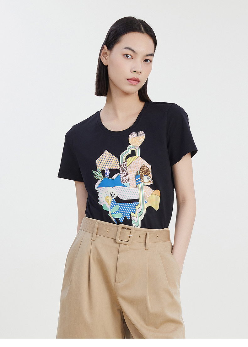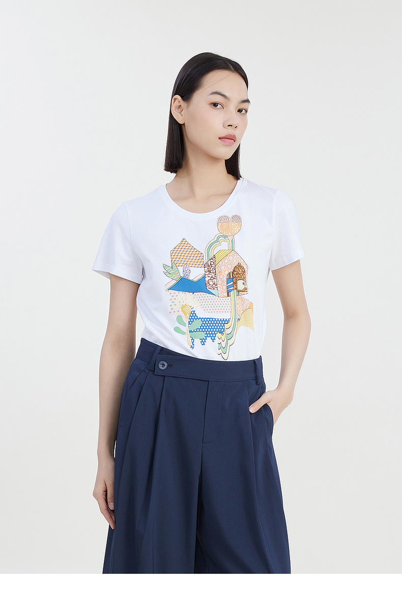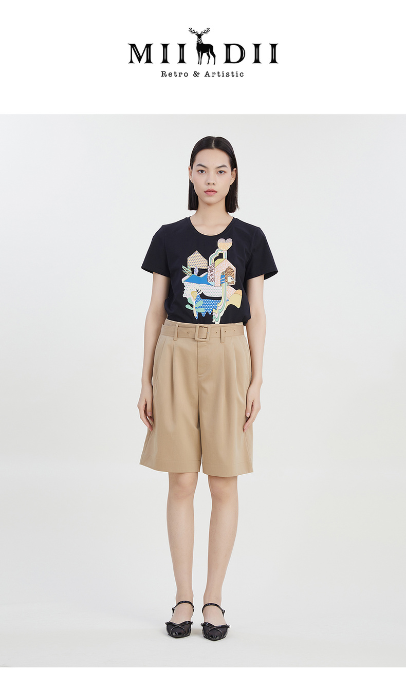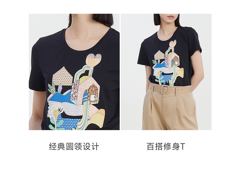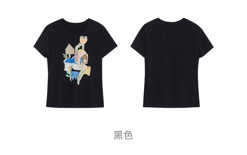 谜底2023夏季新款圆领特色印花T恤短袖女修身绣花上衣232MT0683