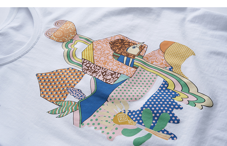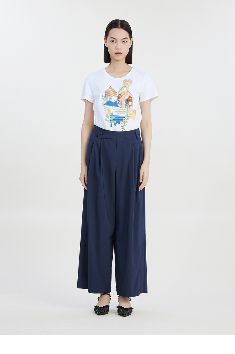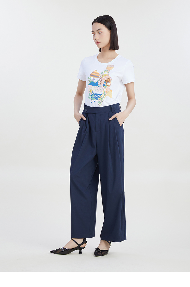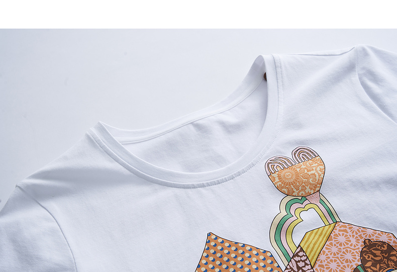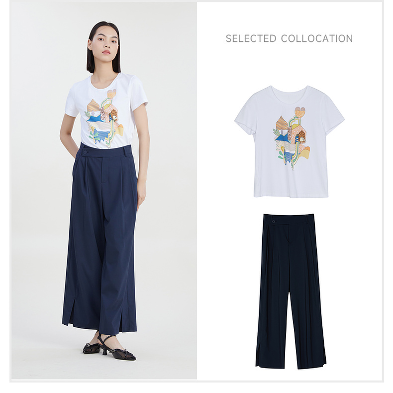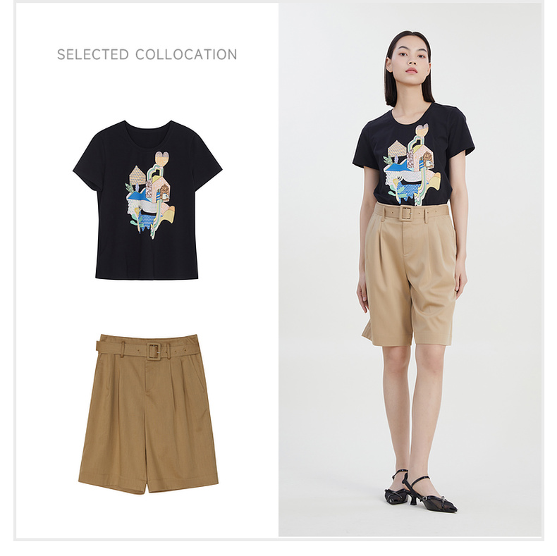 谜底2023夏季新款圆领特色印花T恤短袖女修身绣花上衣232MT0683