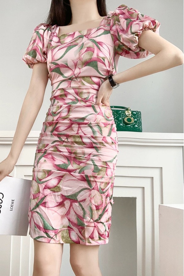 L.Fleuri 气质收腰法式印花修身连衣裙 18364