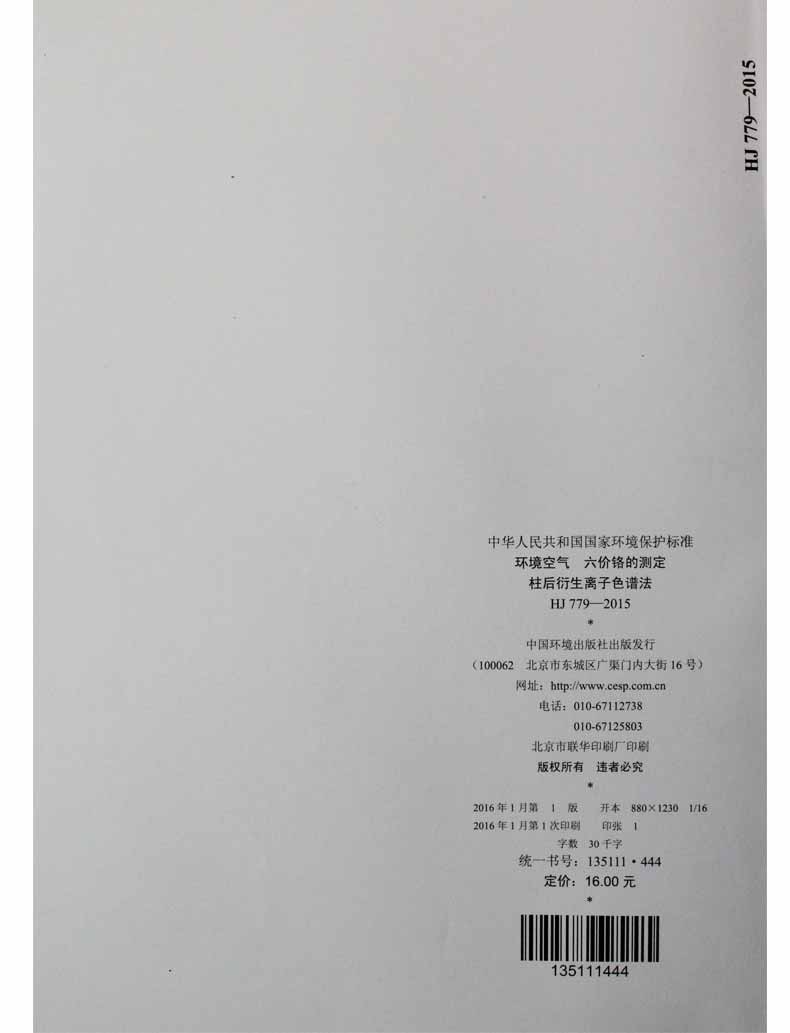 HJ 779-2015 环境空气 六价铬的测定 柱后衍生离子色谱法 国家标准GB 环境保护环境科学135111444