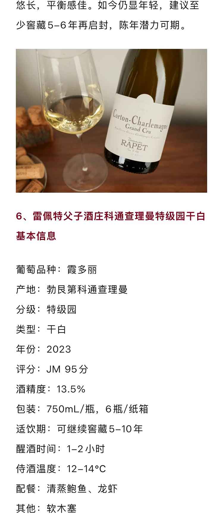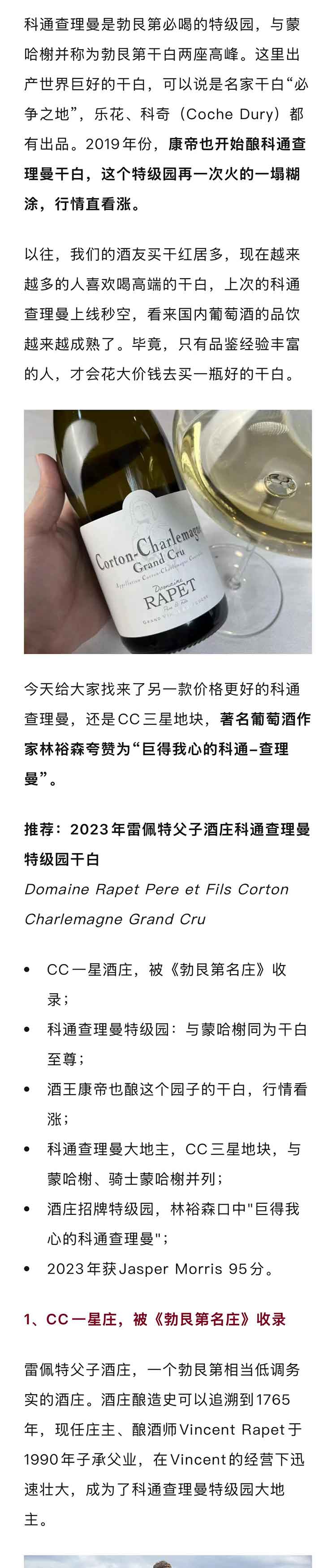 【JM95分】法国勃艮第2023年雷佩特父子酒庄科通查理曼特级园霞多丽干白