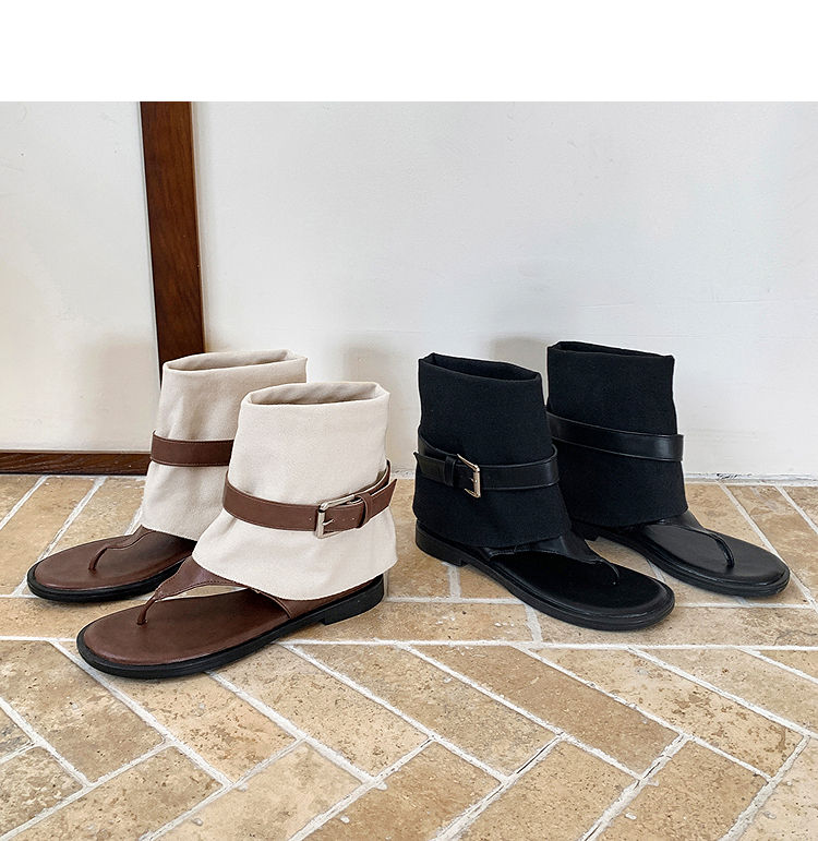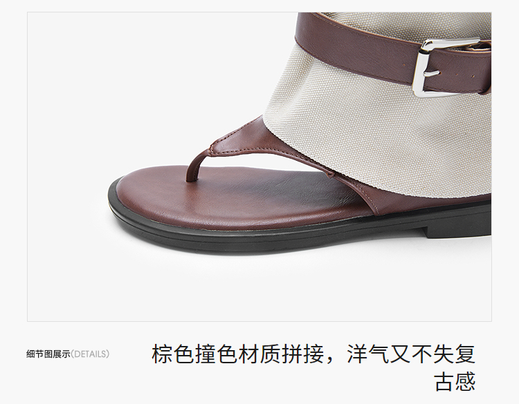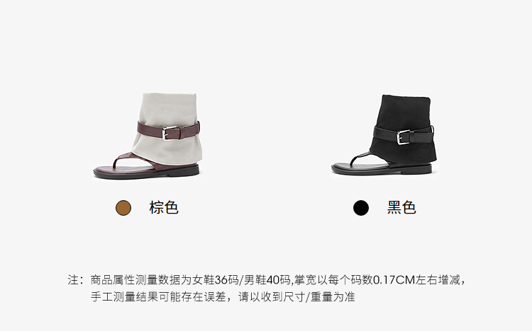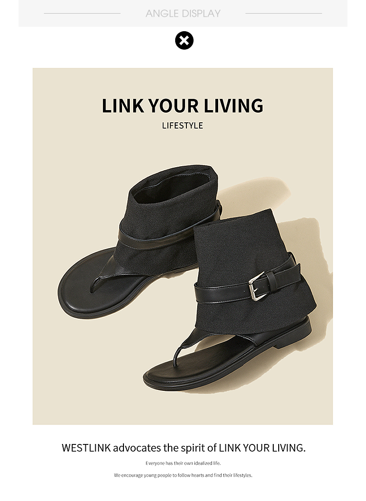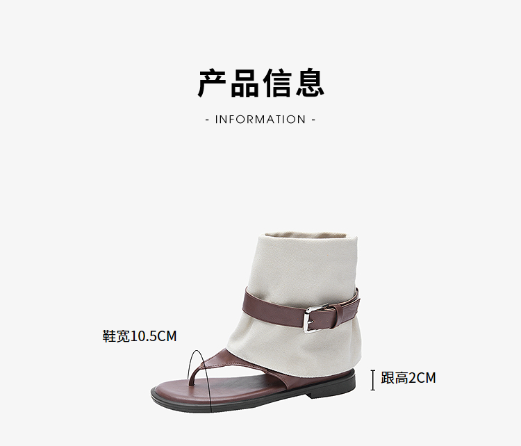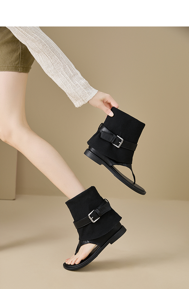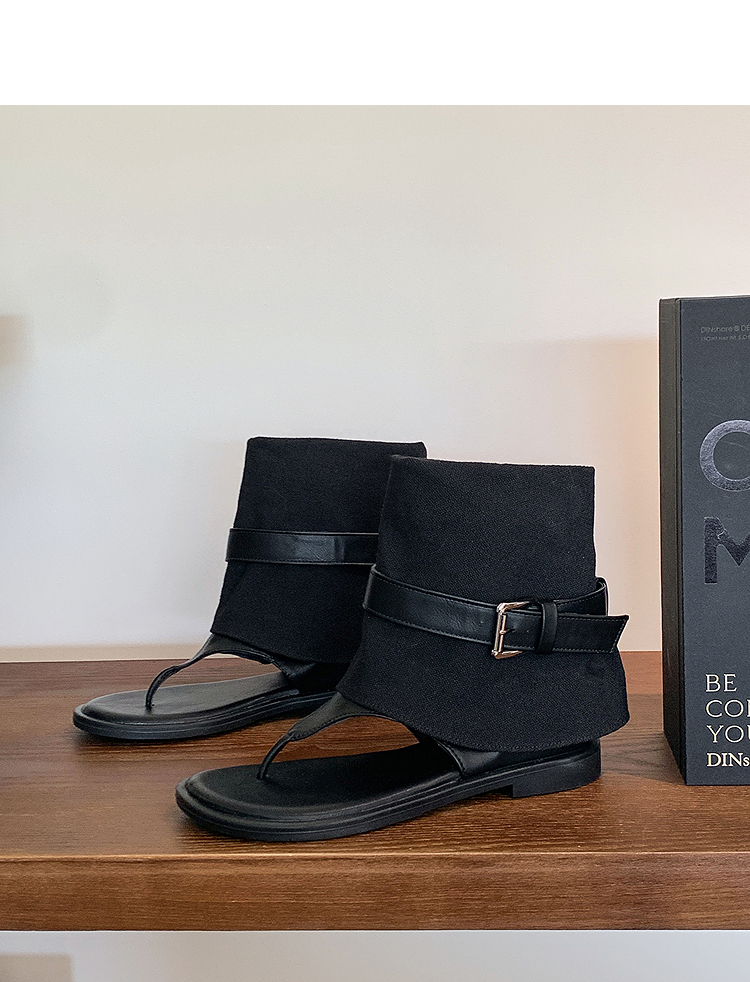 西遇平底凉靴女新款夏季复古辣妹皮带扣黑色中筒靴子夹趾凉鞋V0056890