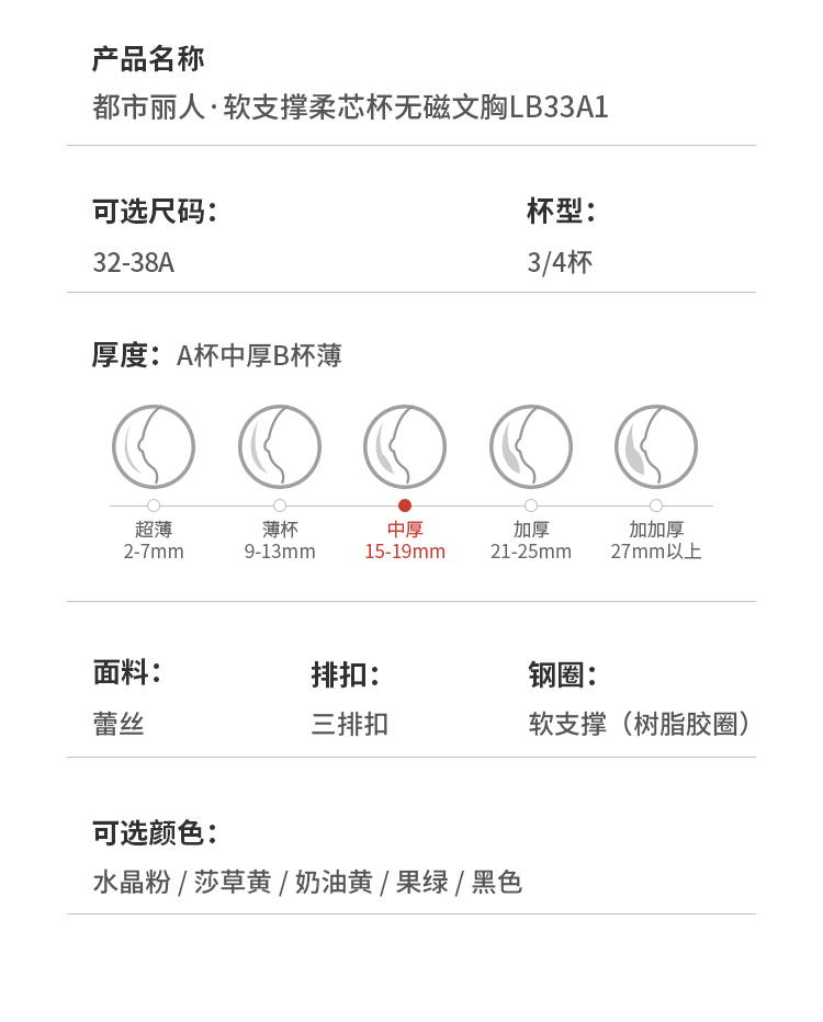 都市丽人自然舒适常规内衣A中厚3/4杯蕾丝文胸三排树脂胶圈LB3AA1