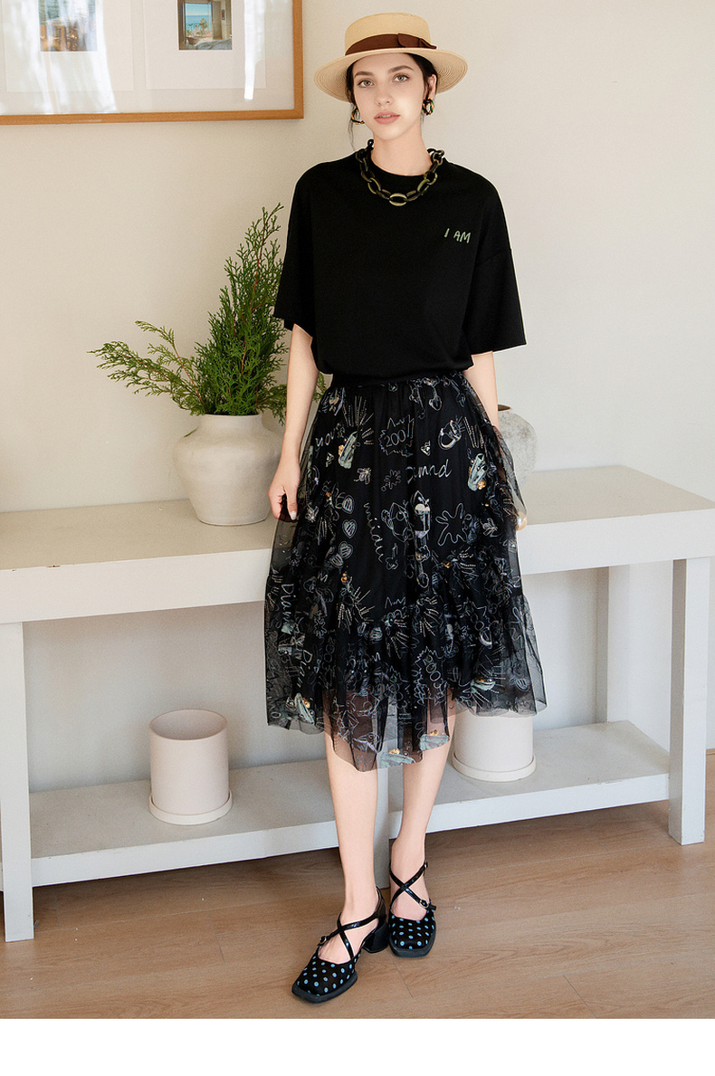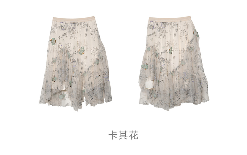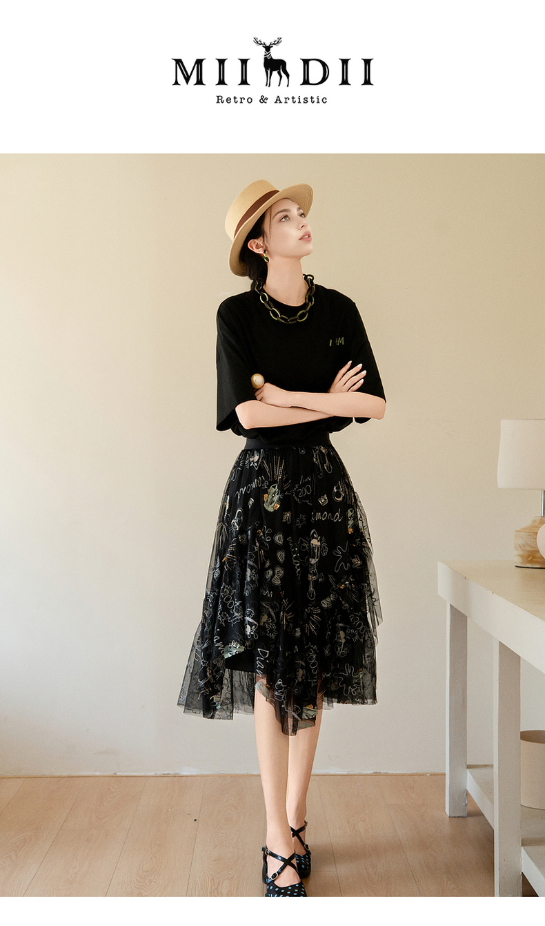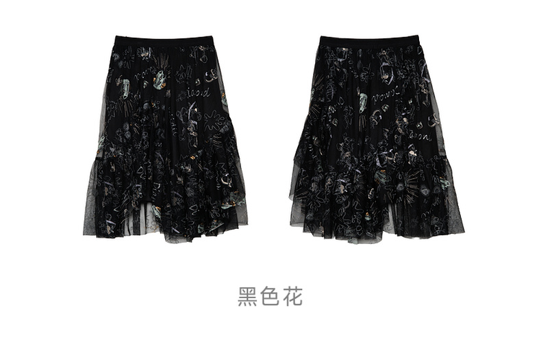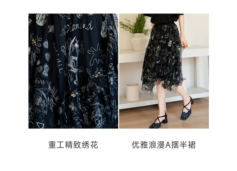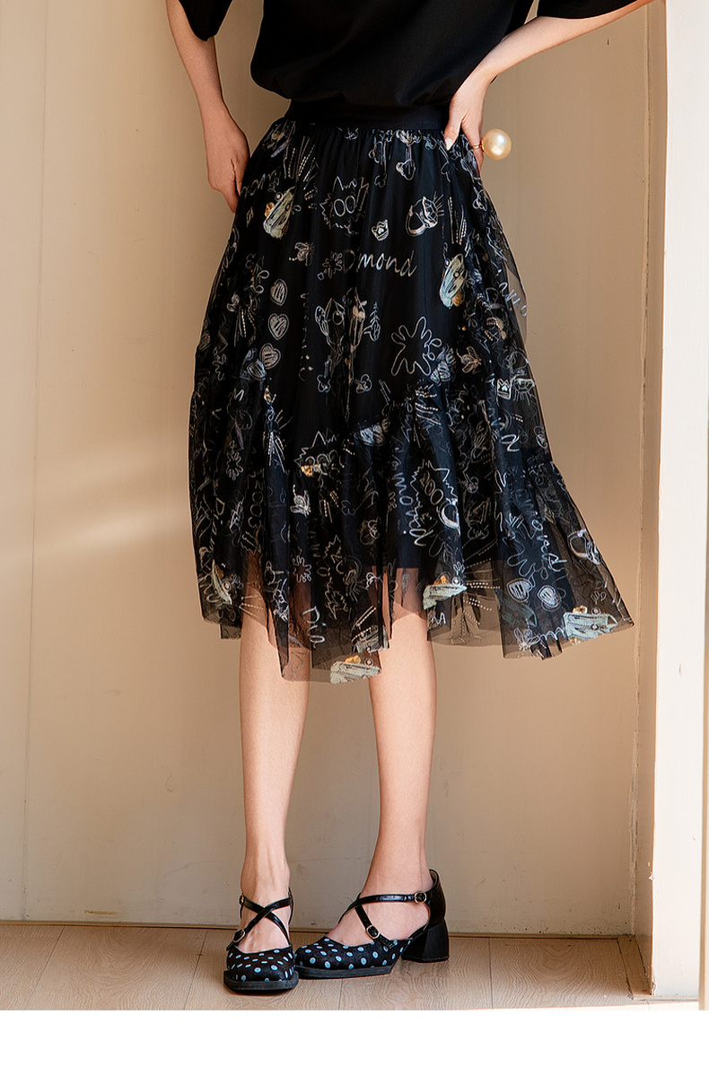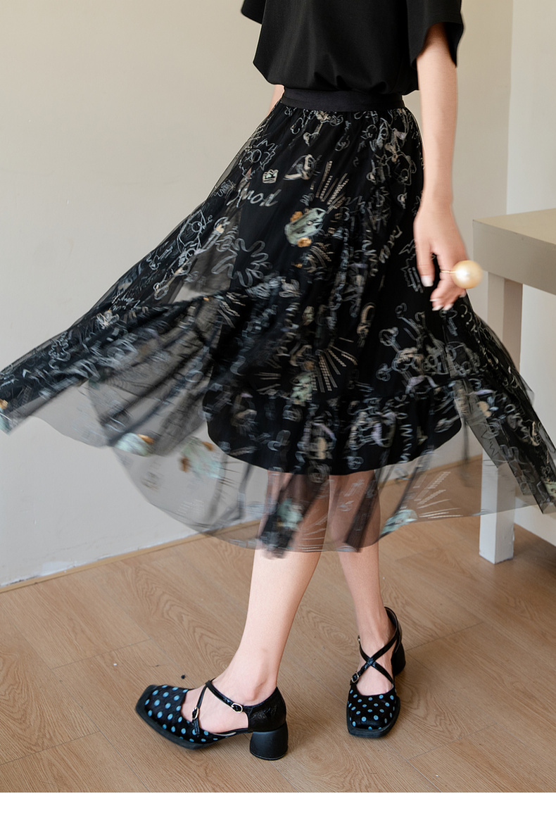 谜底提花半身裙2025夏季新品复古风松紧腰A型中长网纱裙25BMB5003