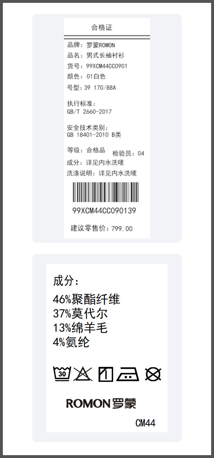 面料:46%聚酯纤维37%莫代尔13%绵羊毛4%氨纶