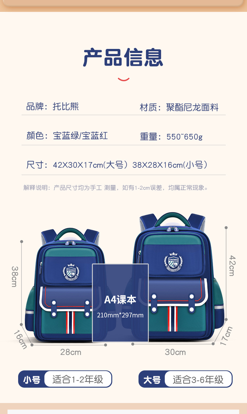 新款托比熊小学生书包1至6年级男女儿童双肩包耐磨减负大容量书包开学季文具套装