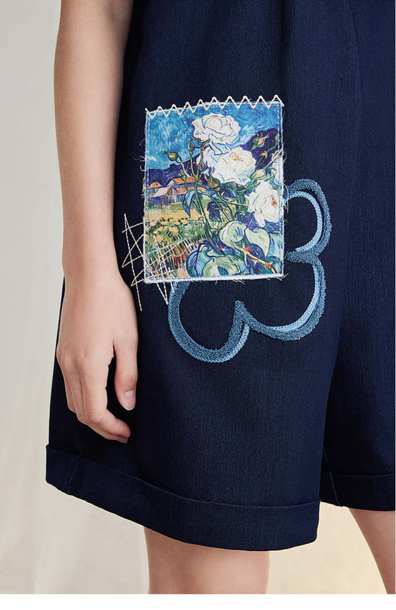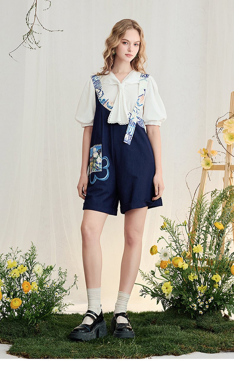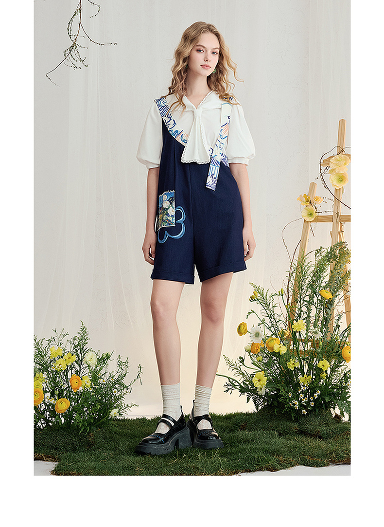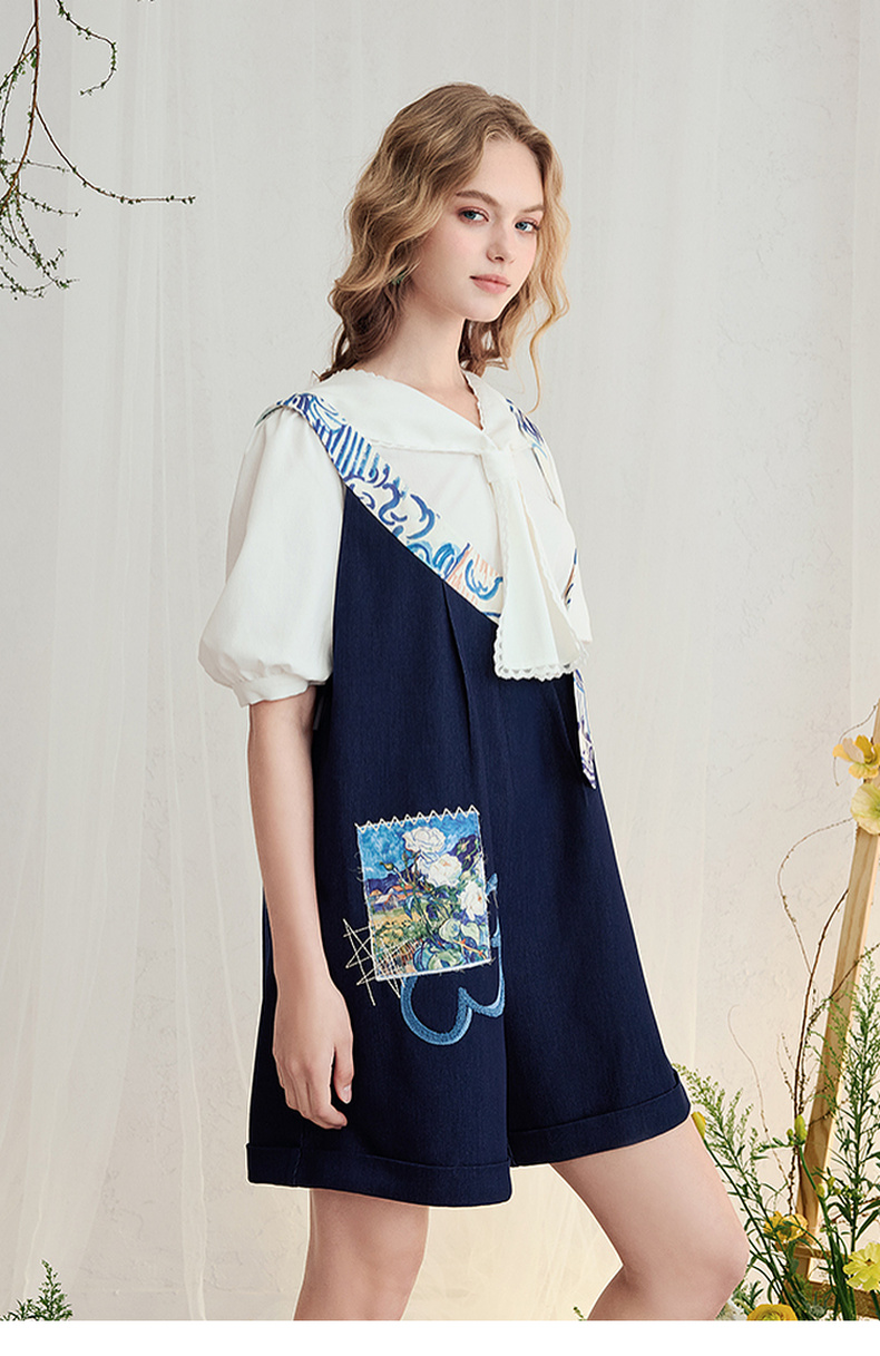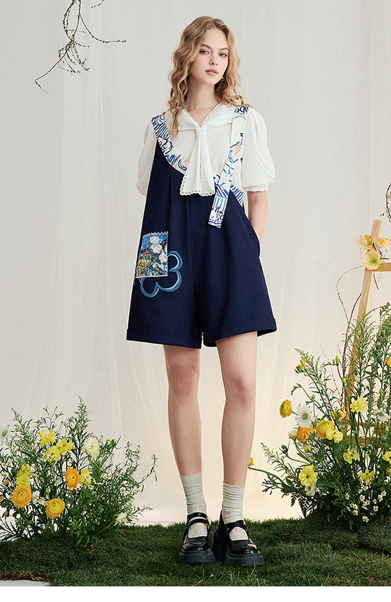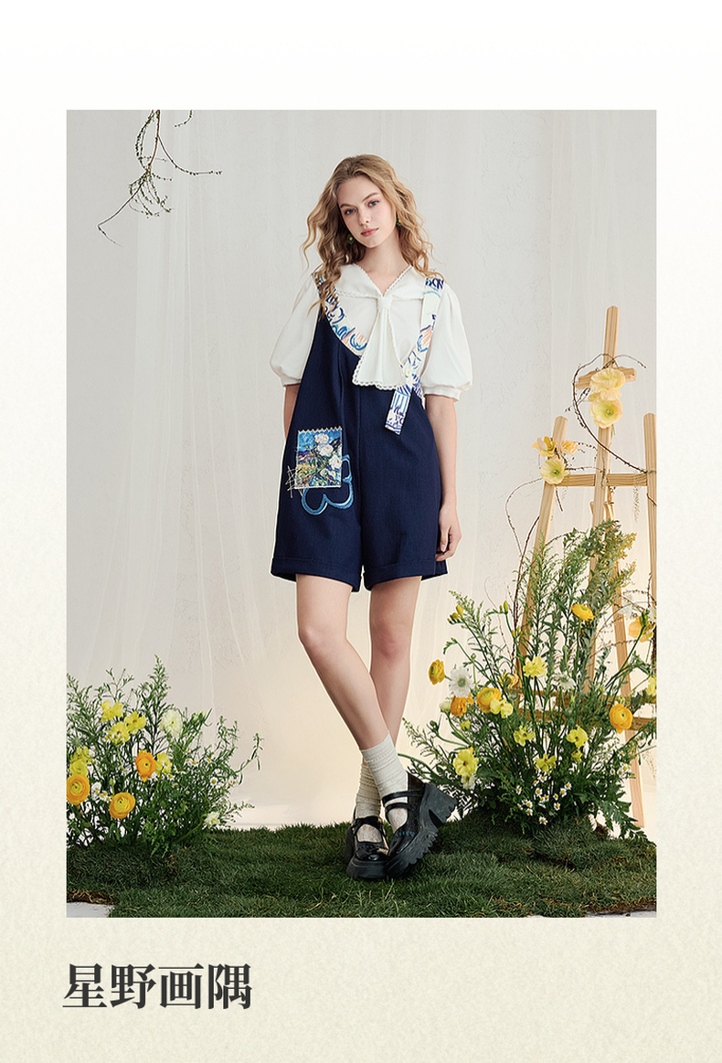 两三事梵高文艺星野画隅2025夏新款印花贴布绣不对称背带裤女宽松