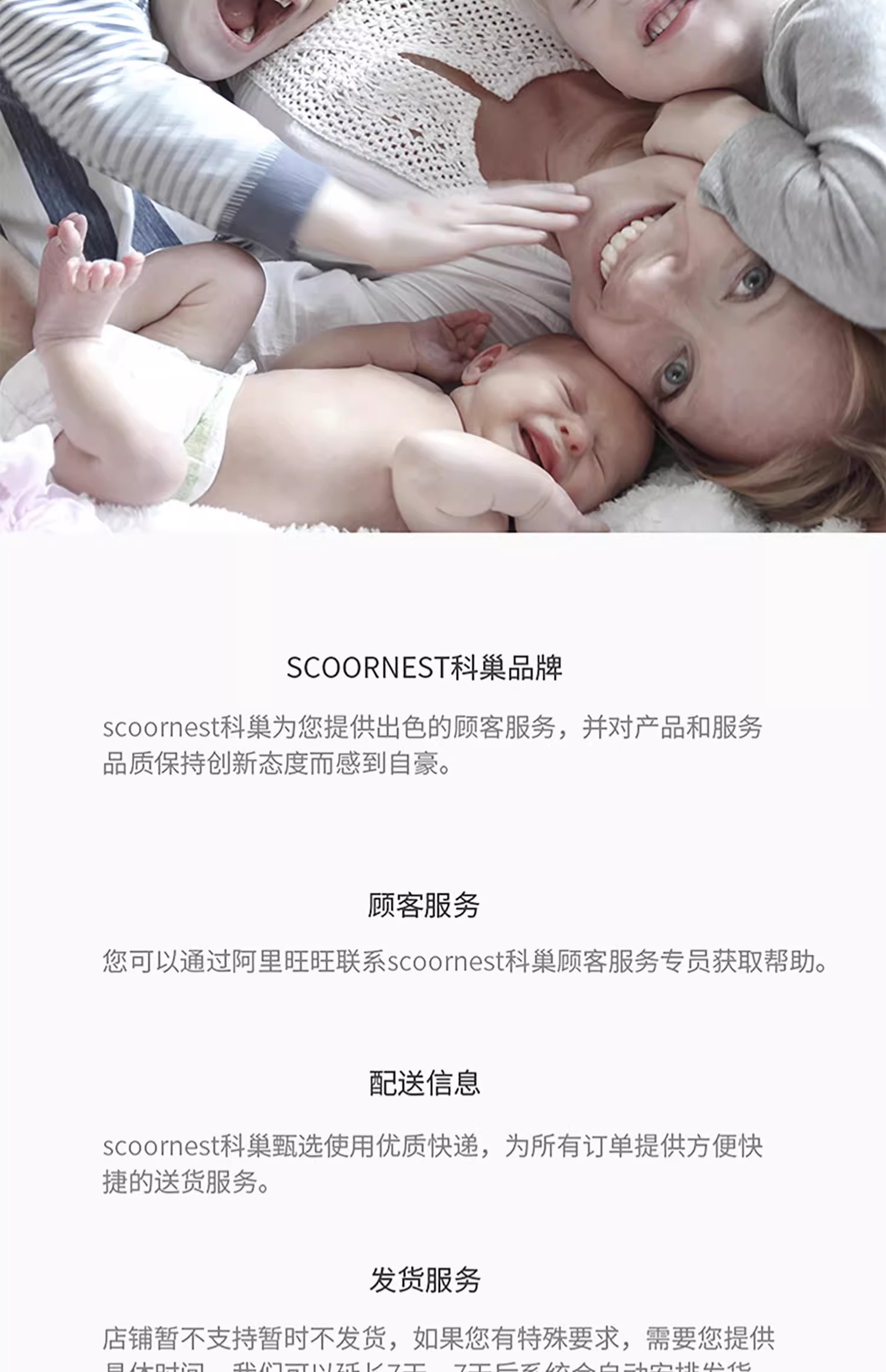 - Scoornest始终秉承给每一位宝宝送去科学的、关心的、创新的成长体验,通过提供商品和服务,使顾客形成守护、发展、巩固这种弥足珍贵的亲情的爱。