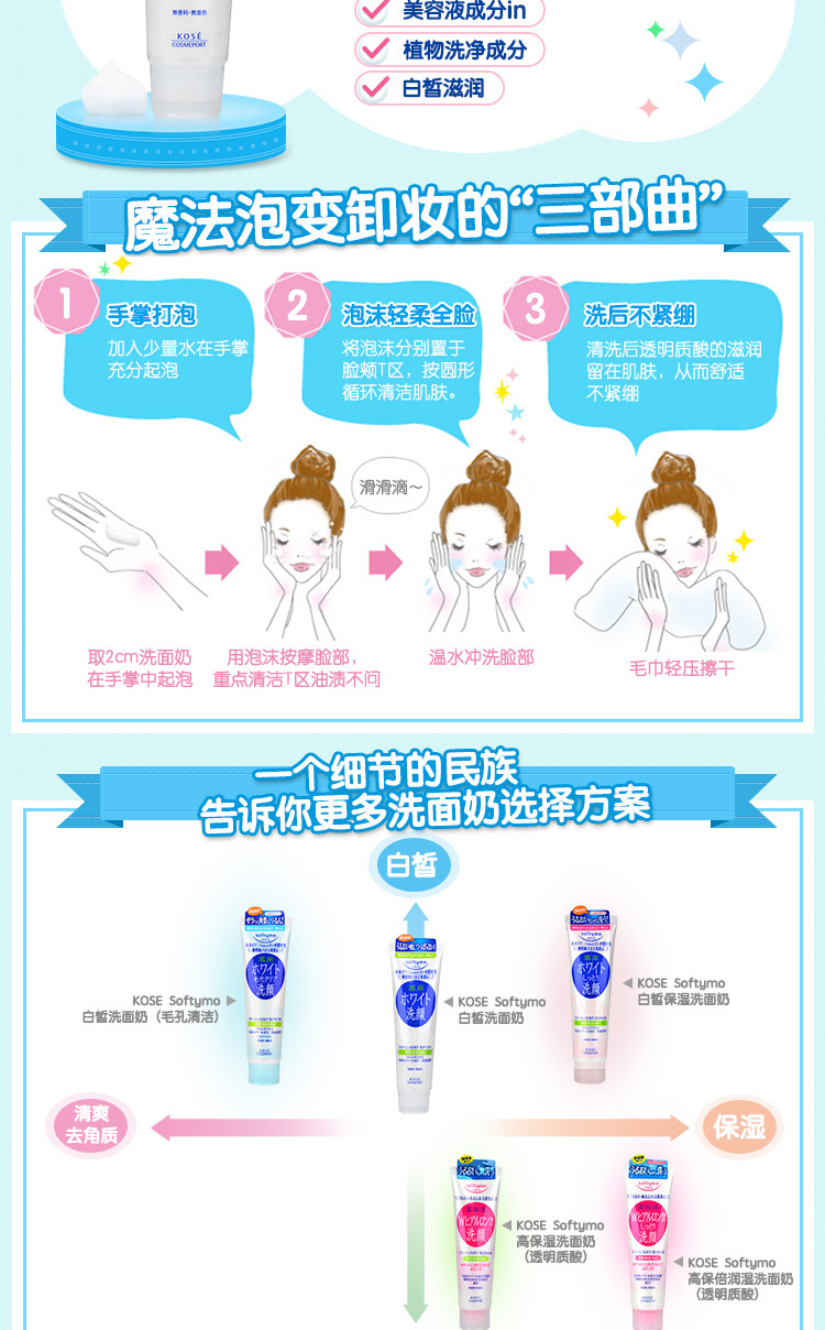 安全配方,含有植物精华和美容液成分,无香料、无色素、弱酸性,任何肤质都可以用!每次只需要一点点就能搓出很多泡沫,泡沫绵密又丰富,可以把肌肤的脏污皮脂都清洁得干干净净,洗完肌肤不干不紧绷,清爽又滋润!