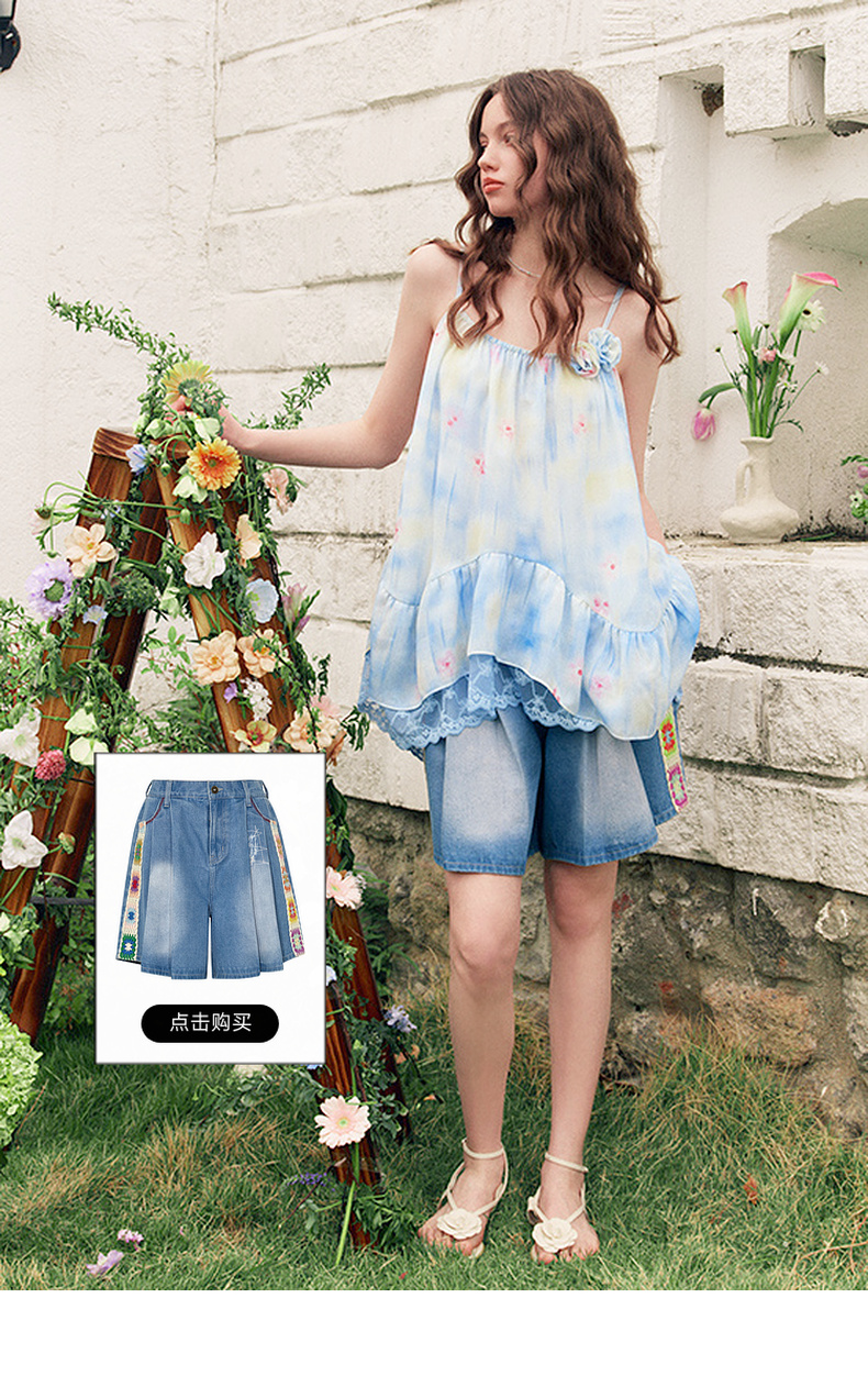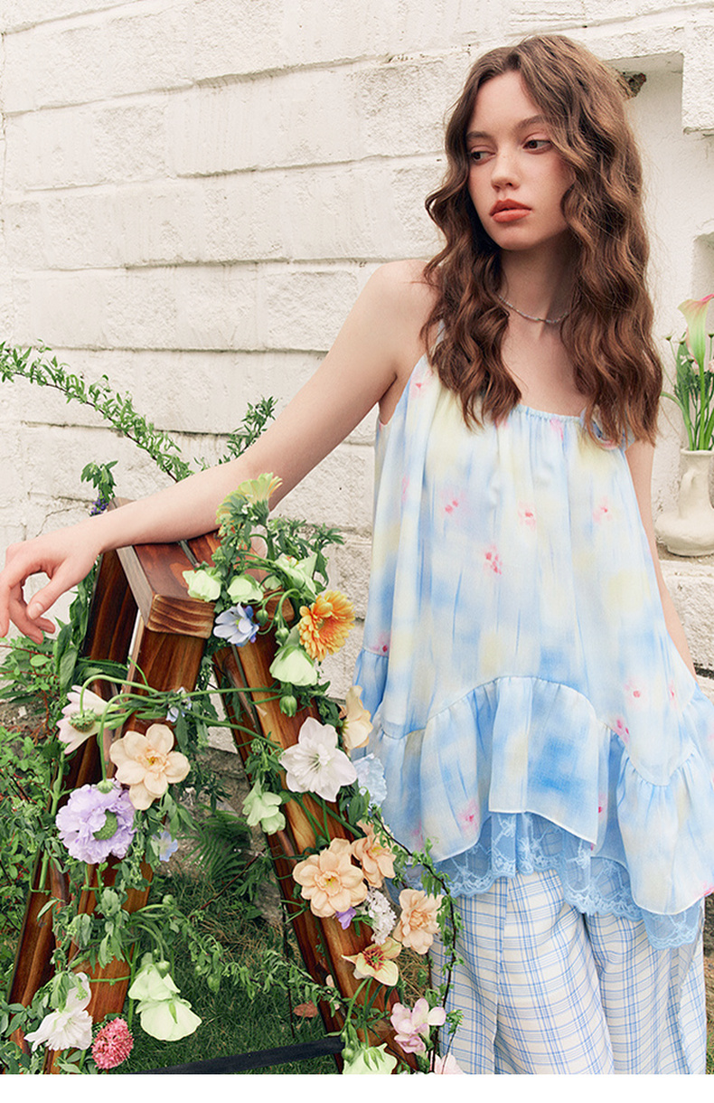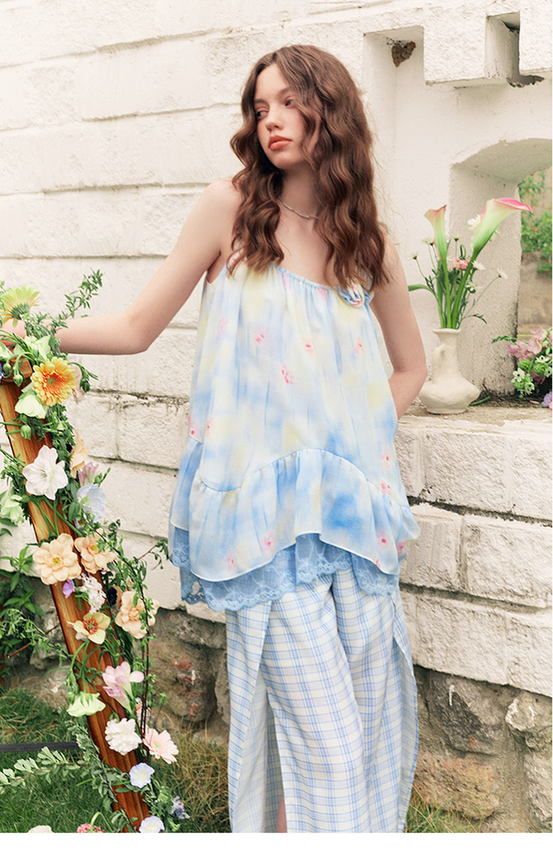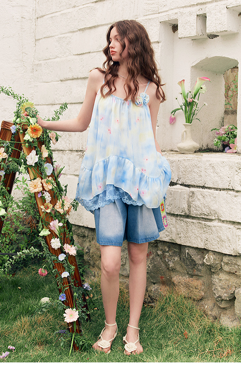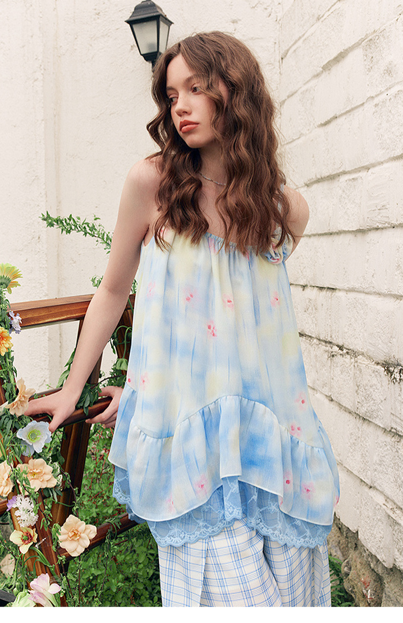 两三事游牧潮水2025夏季新款立体花朵蕾丝荷叶边下摆印花吊带衫女
