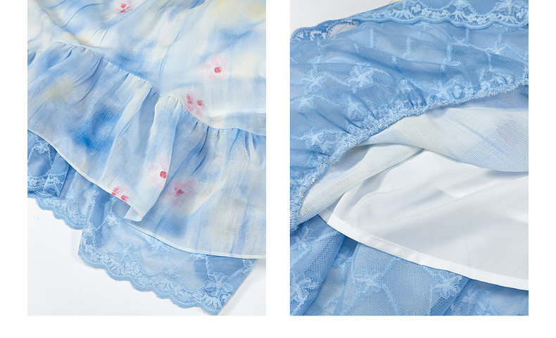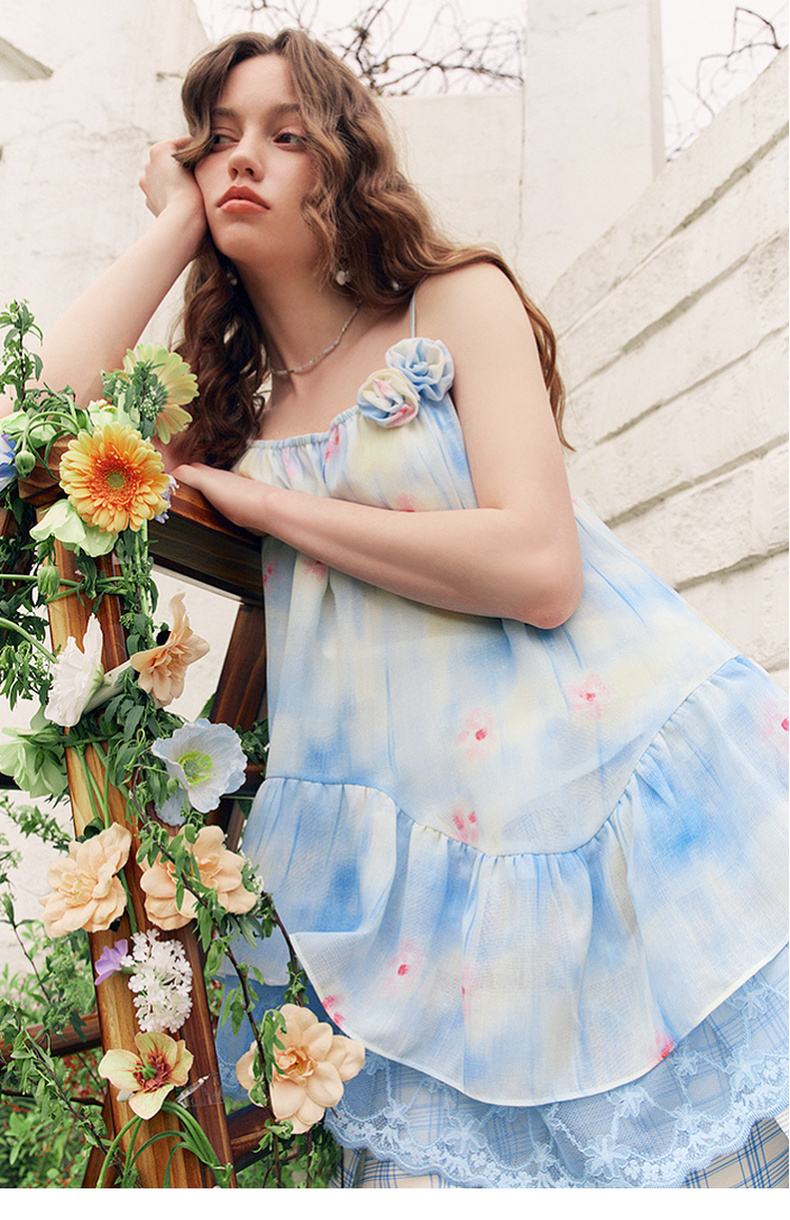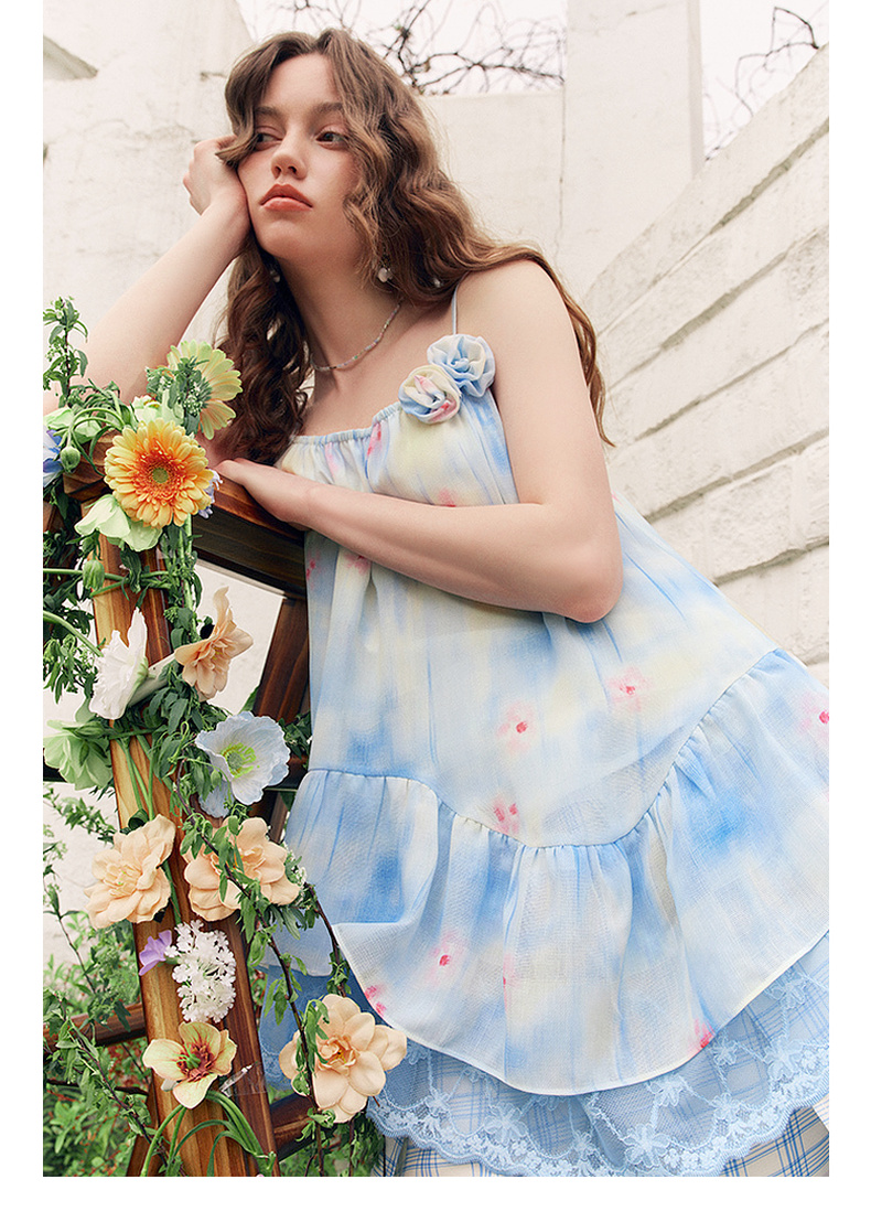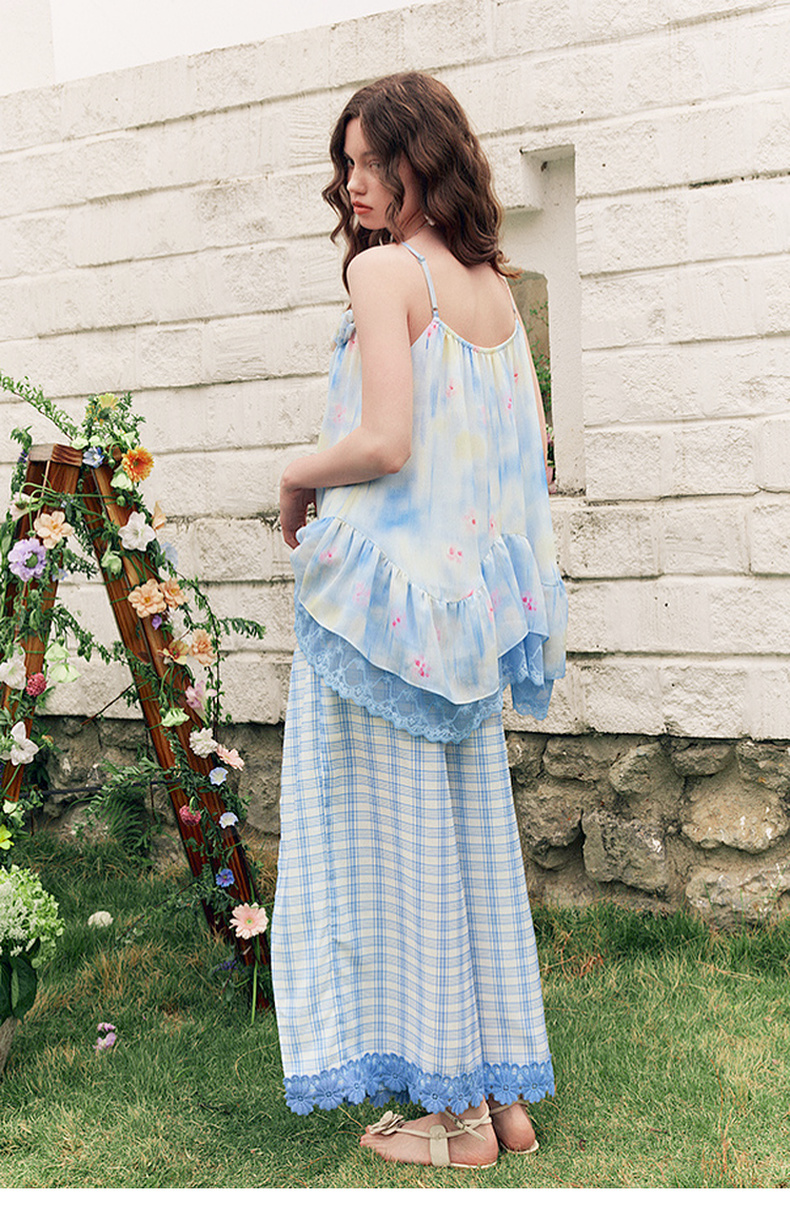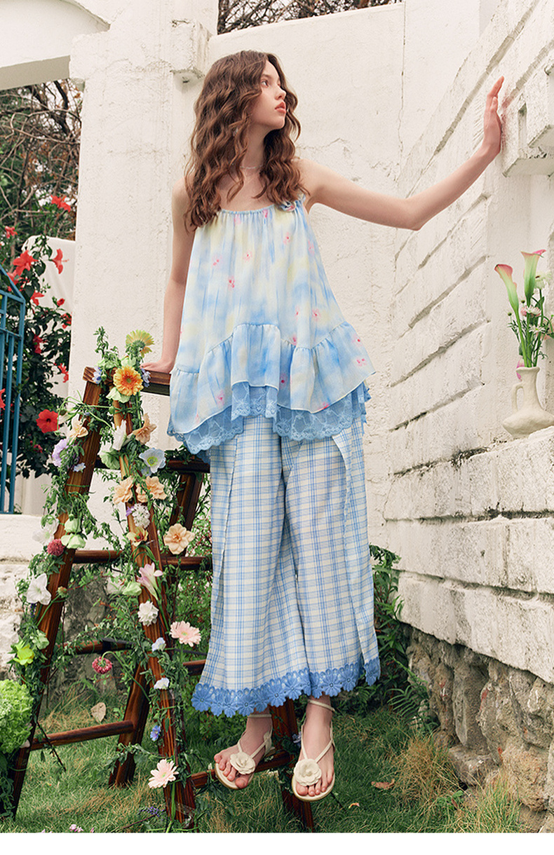 两三事游牧潮水2025夏季新款立体花朵蕾丝荷叶边下摆印花吊带衫女