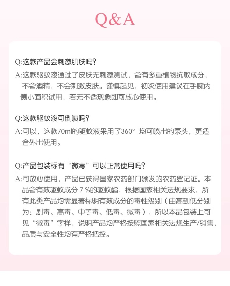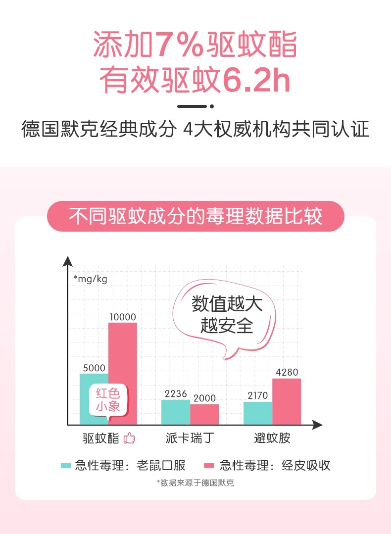 这款驱蚊水不含避蚊胺成分,添加7%驱蚊酯,安全放心,不会对身体造成伤害,大人小孩都能用!