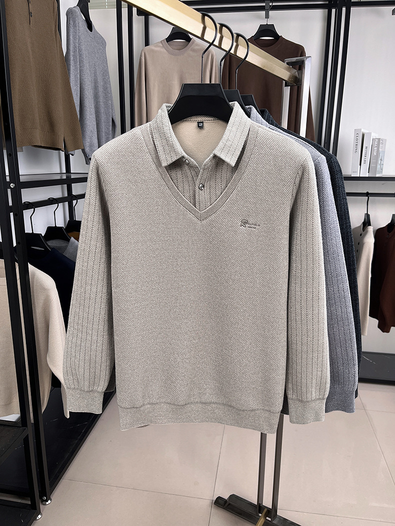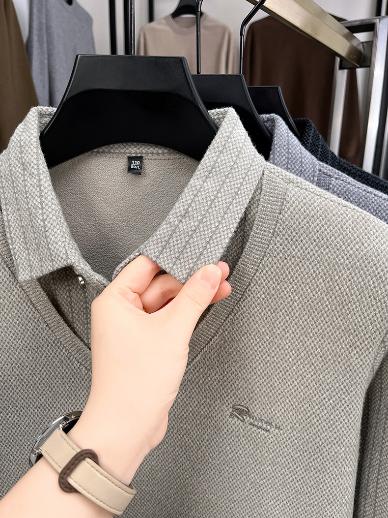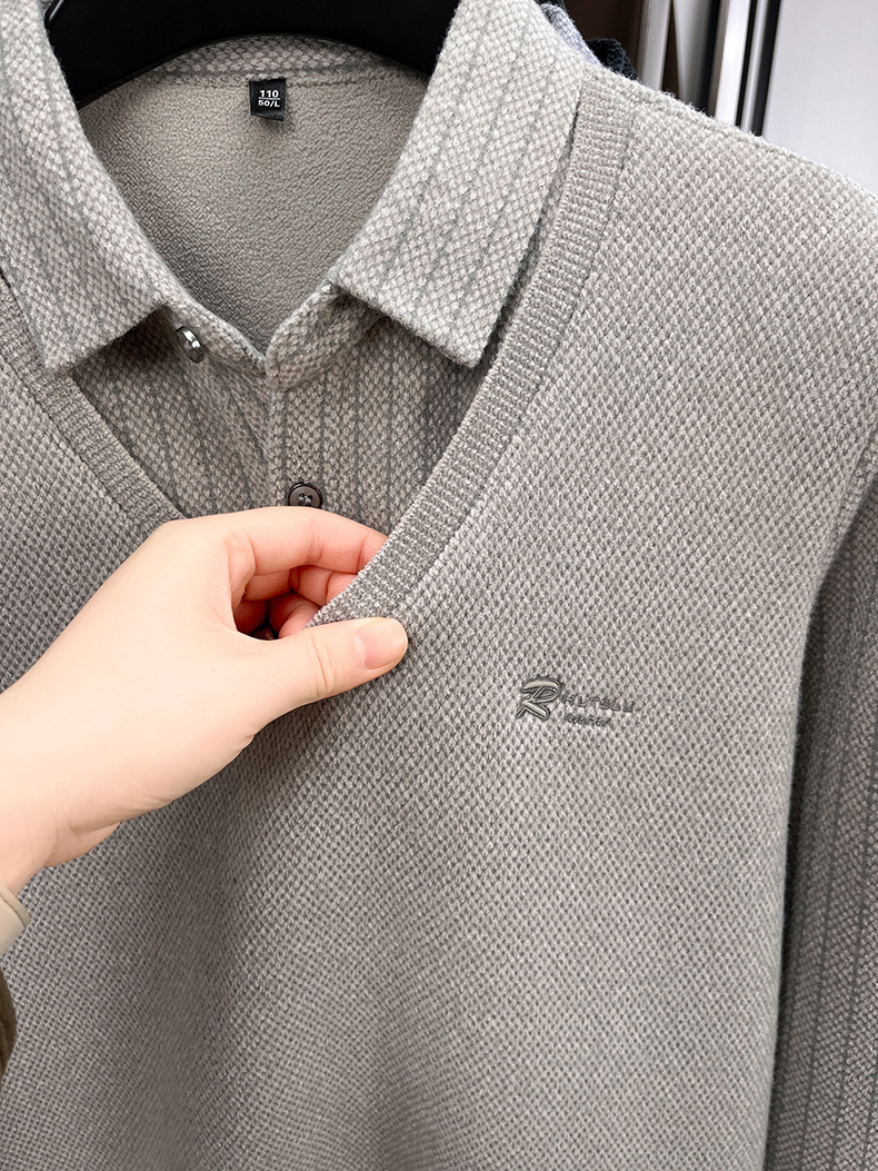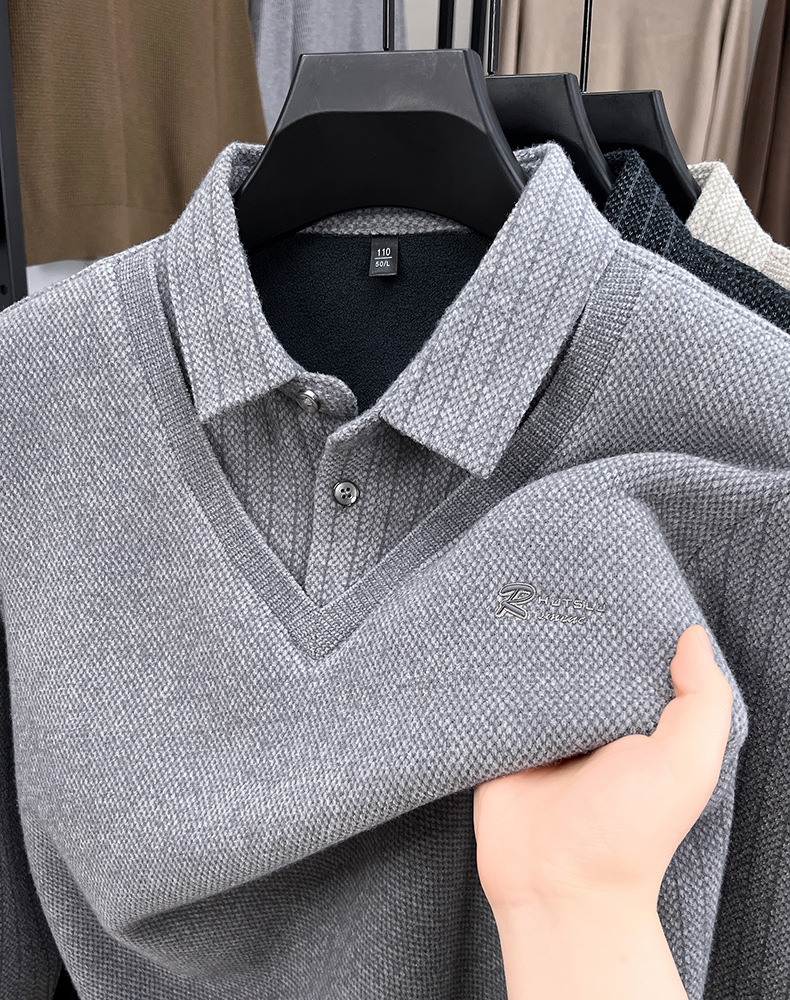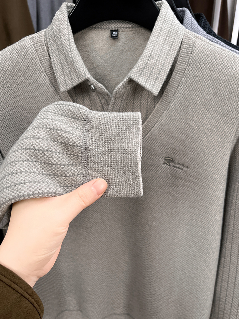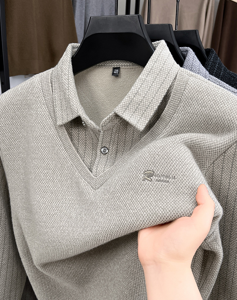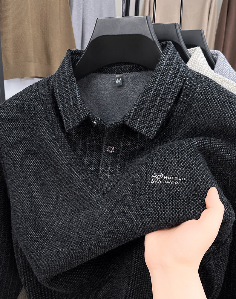 加绒秋季青年男士假两件保暖上衣翻领条纹长袖男装中年体恤衫爸爸装秋冬加厚T恤