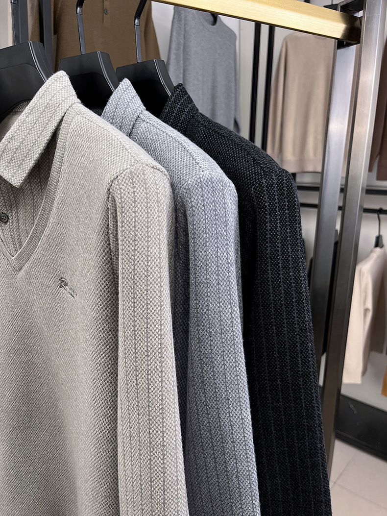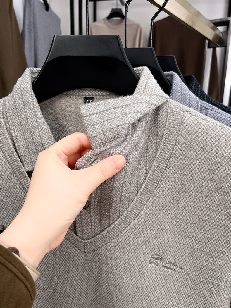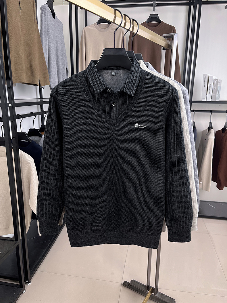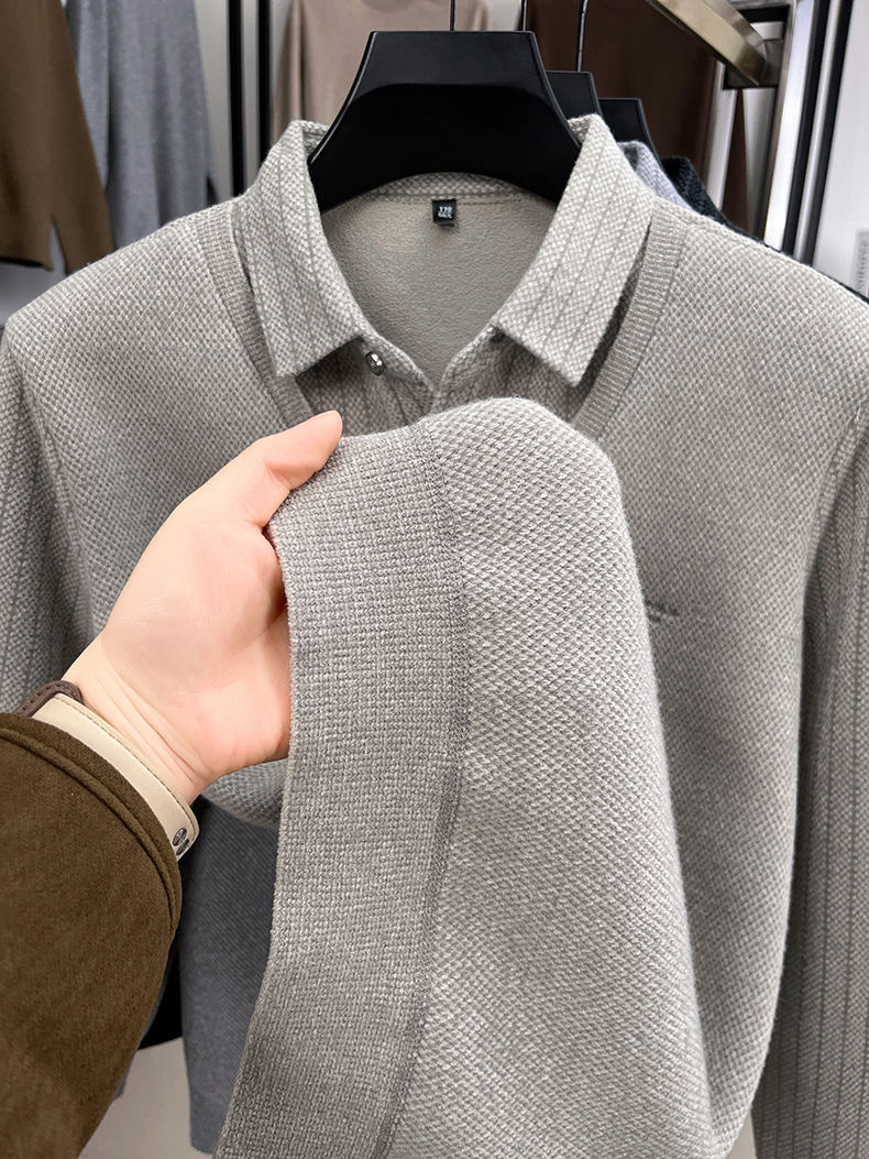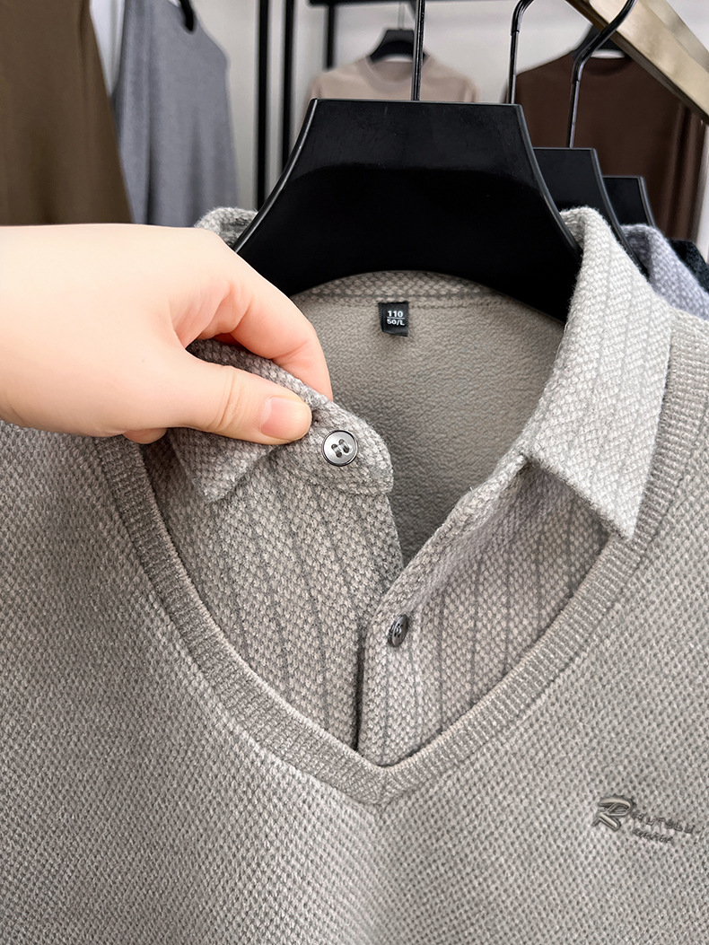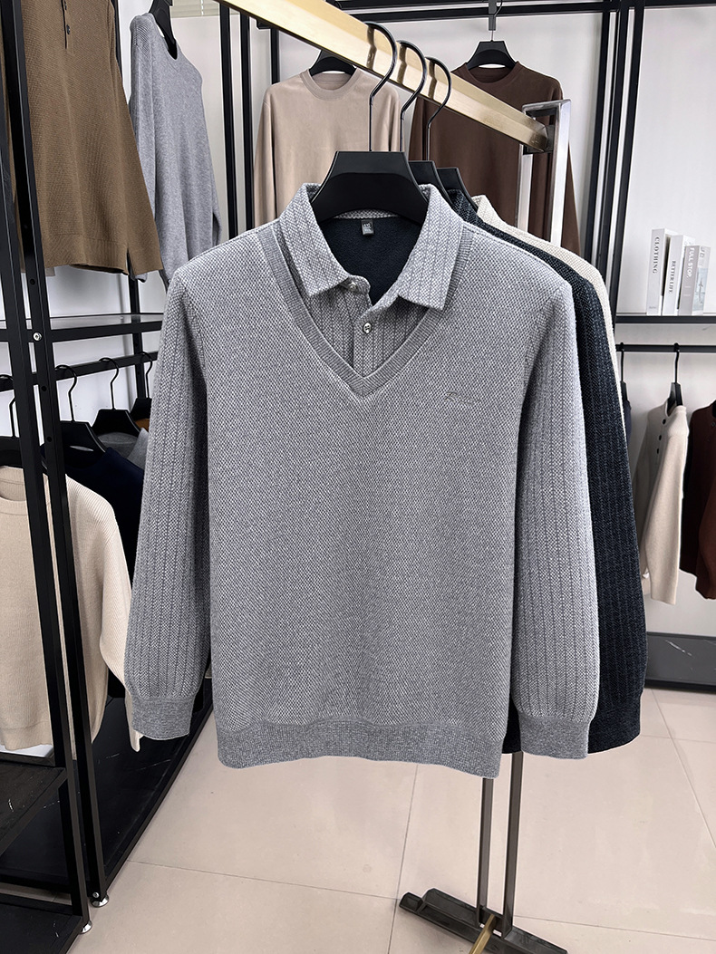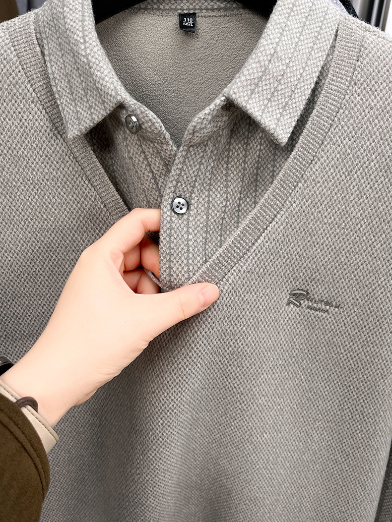 加绒秋季青年男士假两件保暖上衣翻领条纹长袖男装中年体恤衫爸爸装秋冬加厚T恤