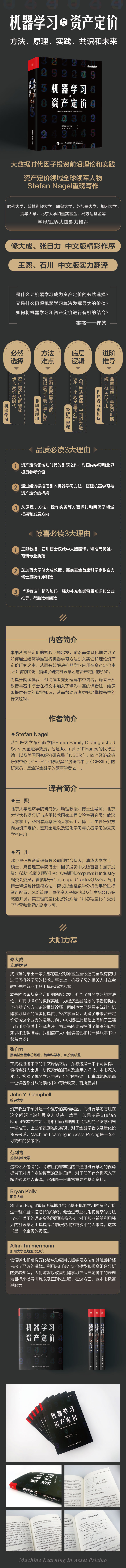 译者简介王熙,北京大学经济学院研究员、助理教授、博士生导师;北京大学大数据分析与应用技术国家工程实验室研究员;武汉大学学士,圣路易斯华盛顿大学硕士、博士;主要研究方向为资产定价、宏观金融以及强化学习与机器学习的交叉学科应用。石川,北京量信投资管理有限公司创始合伙人;清华大学学士、硕士,麻省理工学院博士;因子投资中文版首著《因子投资:方法与实践》领衔作者;知名期刊Computers in Industry编委会委员;曾就职Citigroup、Oracle及P&G。石川博士精通统计建模方法,擅长以金融数学分析为手段进行资产配置、风险管理、量化多因子模型以及衍生品CTA策略的开发。其主理的量化投资公众号“川总写量化”受到了学界和业界的高度认可。