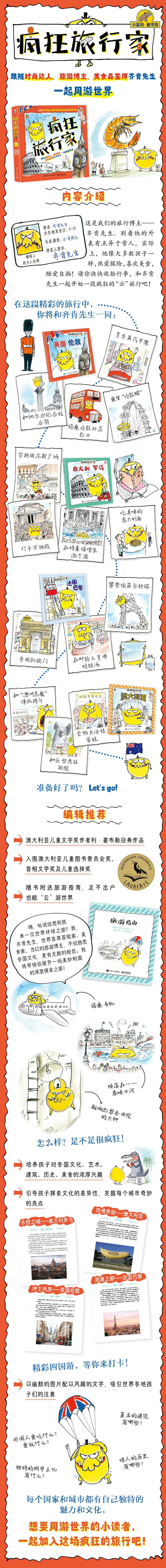 齐肯先生有着在别人看来十分怪异的外表,胖嘟嘟的身体、细杆长的双腿、小小的翅膀,还带着一顶小黑帽,看起来总是不高兴。 实际上,他像大多数孩子一样,充满好奇心,热爱探险,热爱美食,于是,齐肯先生抓起相机,收拾行李,开始一段段疯狂的旅行吧! 澳大利亚儿童文学奖作者利·霍布斯经典作品,入围澳大利亚儿童图书委员会奖及首相文学奖并荣获4项儿童选择奖。以幽默的图片配以风趣的文字,吸引世界各地孩子们的注意。培养孩子对各国文化、艺术、建筑、历史、美食的浓厚兴趣。引导孩子探索文化的差异性,发掘每个城市奇妙的亮点。