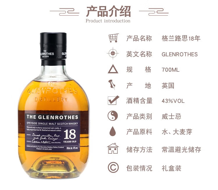 格兰路思18年苏格兰斯佩塞单一麦芽威士忌 700ml