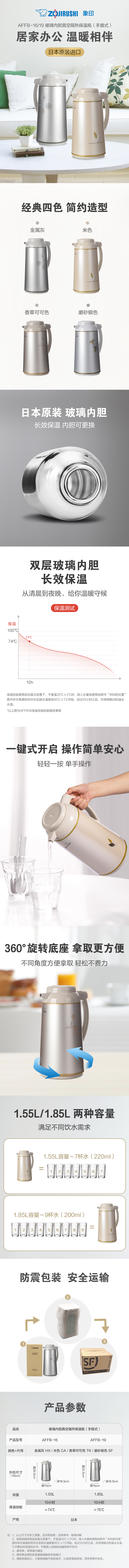 象印 玻璃内胆真空隔热手提式保温瓶AFFB-19