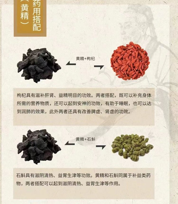 2、泡水喝:取一两片黄精,加入开水冲泡,还可以搭配 :桑葚、枸杞、西洋参、黄芪等一同泡饮
