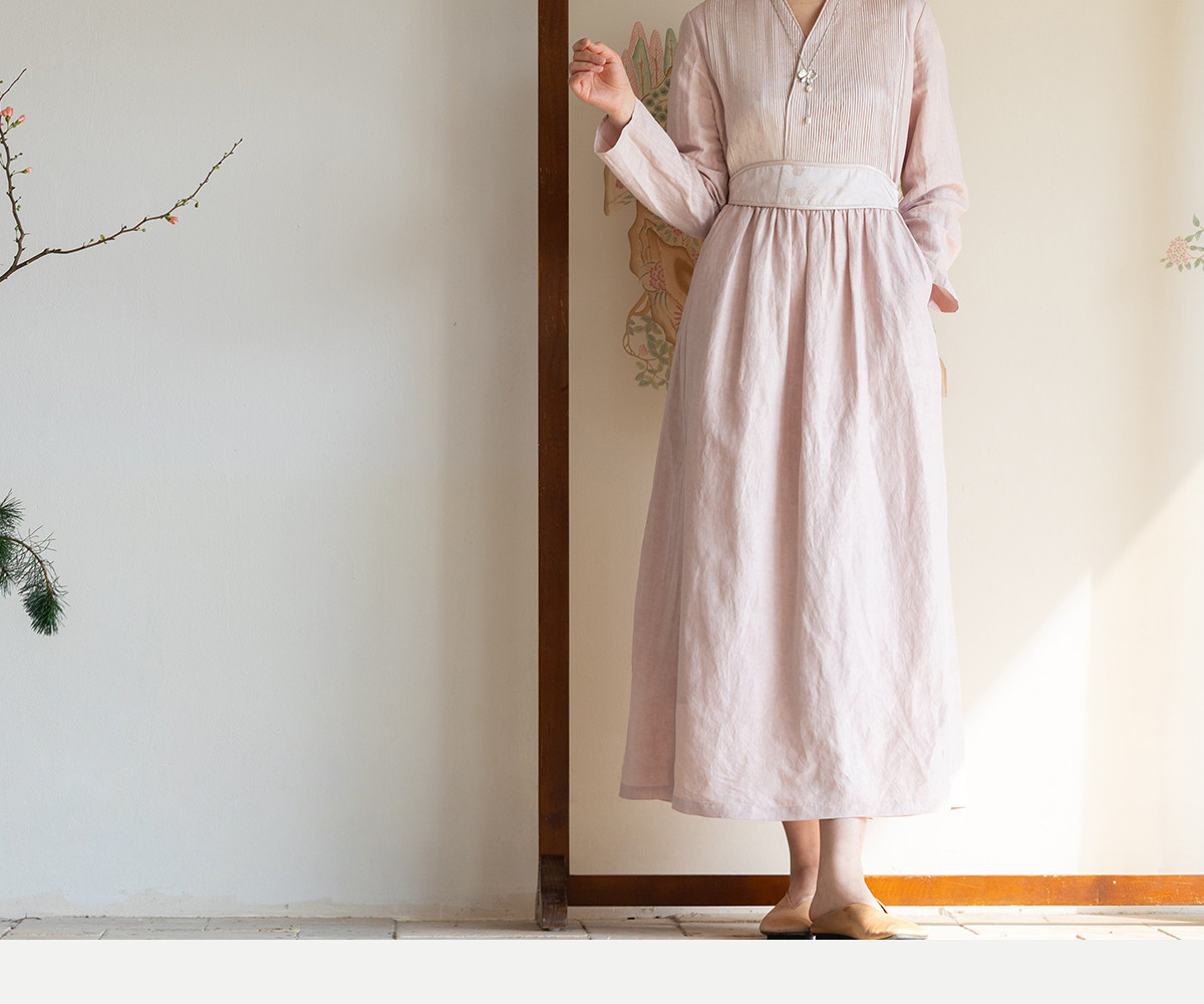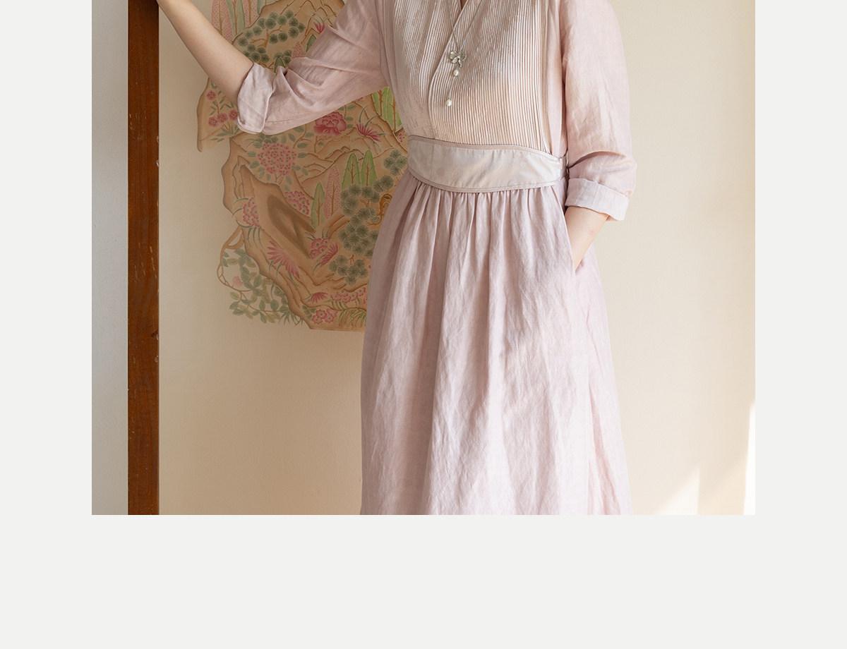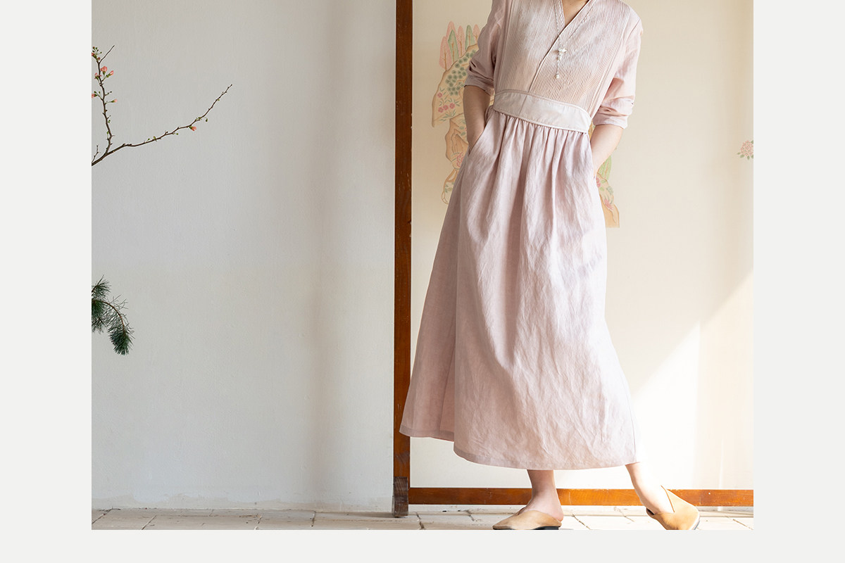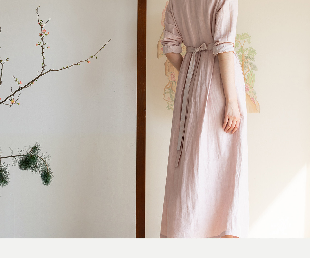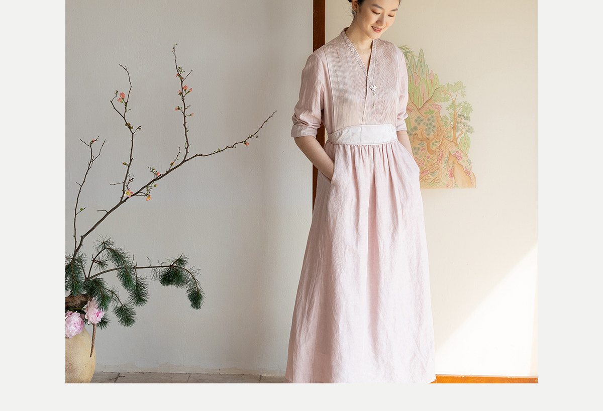 牧衣游原创 32姆米重磅丝麻打条连衣裙新款宽松粉色气质长裙 空谷
