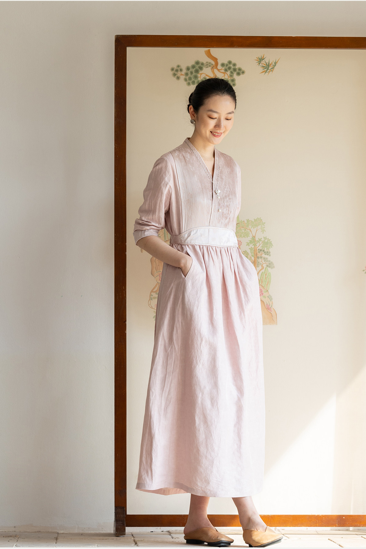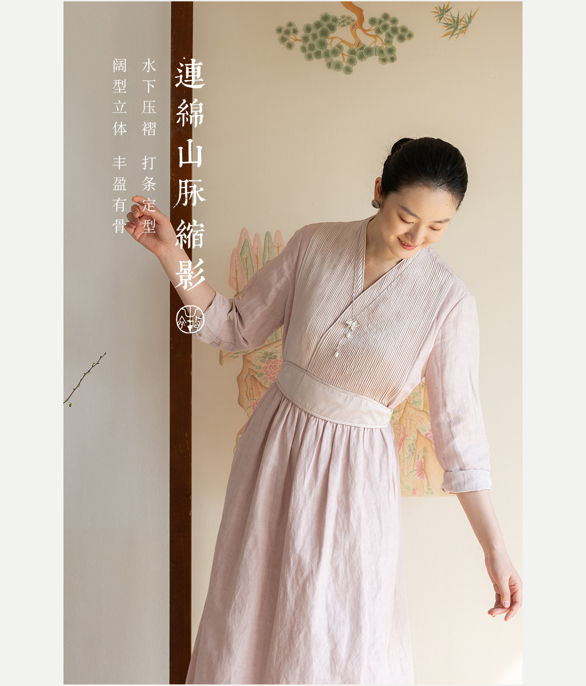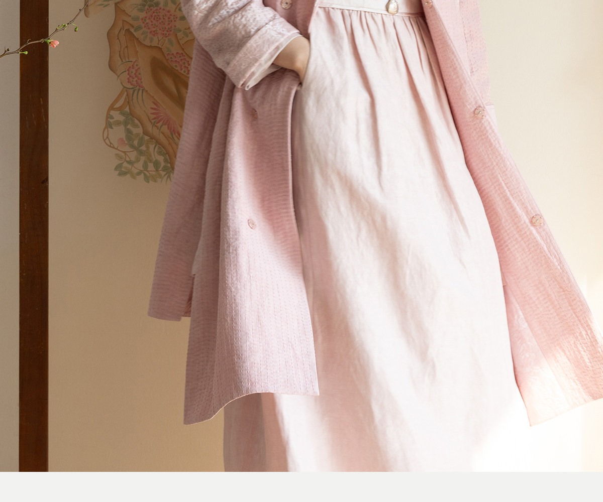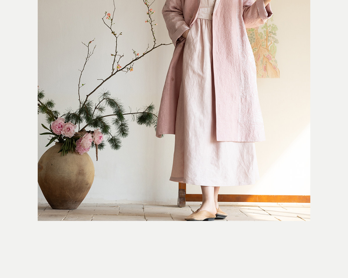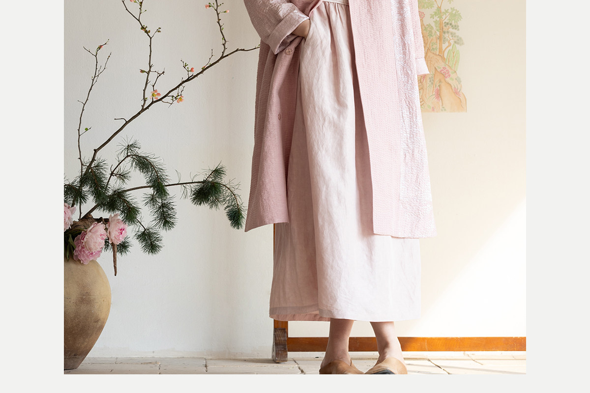 牧衣游原创 32姆米重磅丝麻打条连衣裙新款宽松粉色气质长裙 空谷