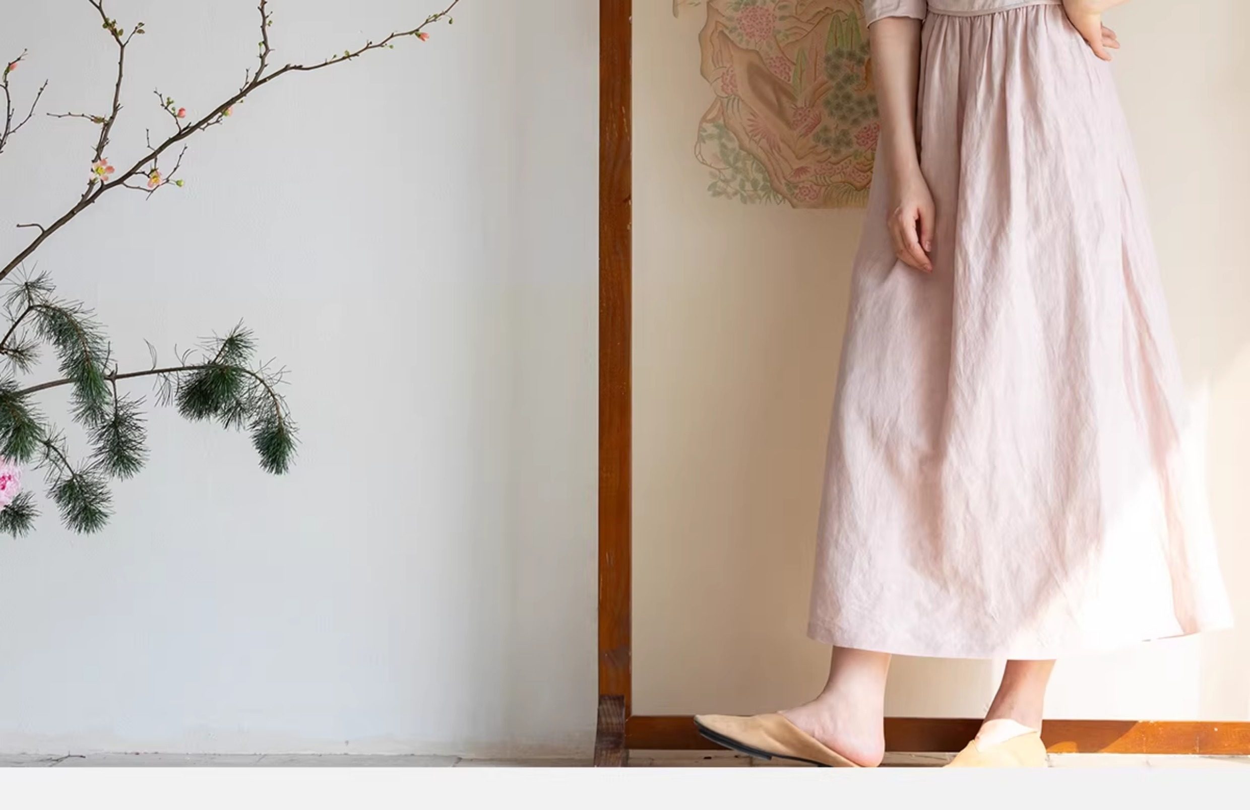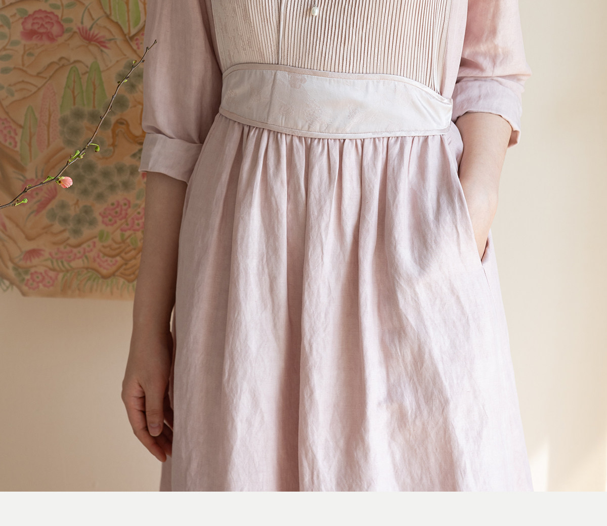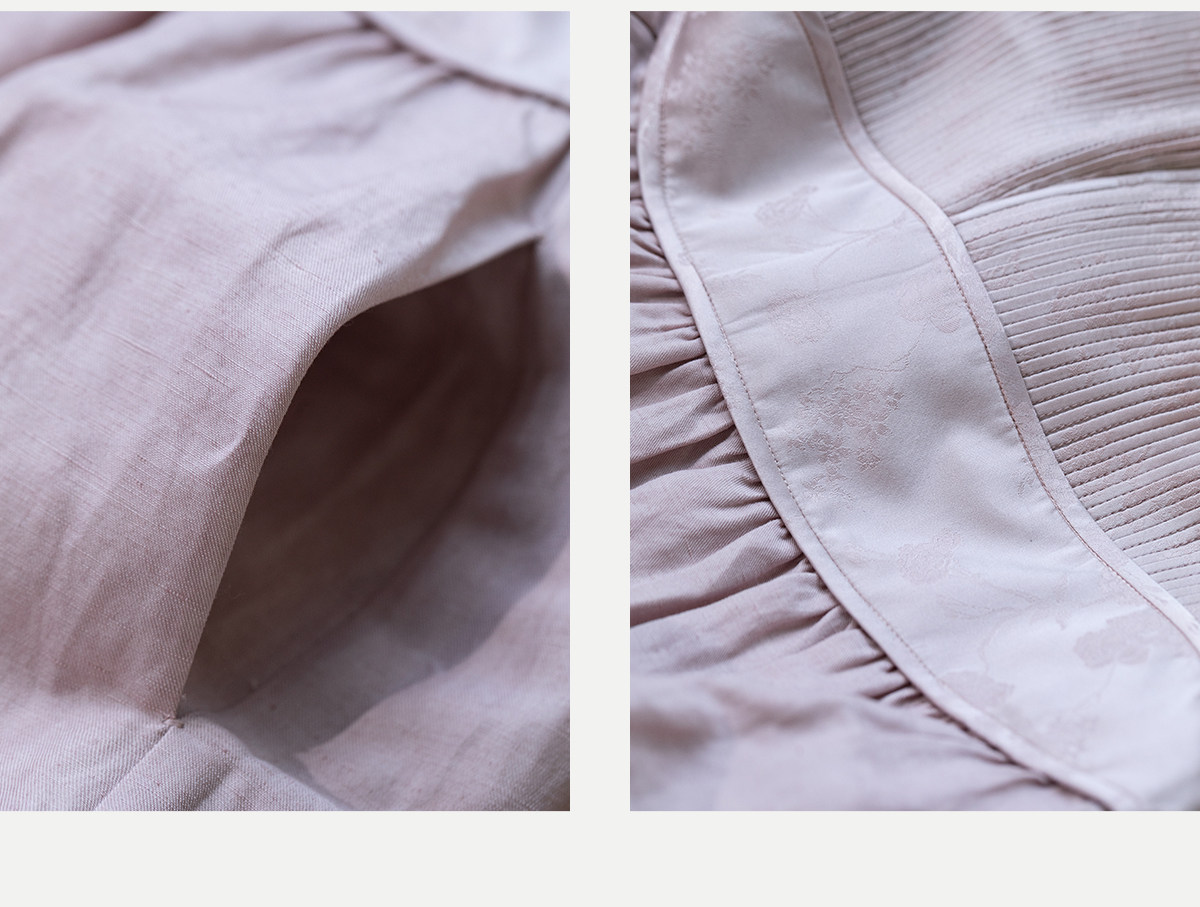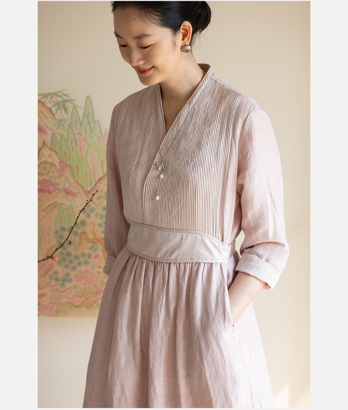 牧衣游原创 32姆米重磅丝麻打条连衣裙新款宽松粉色气质长裙 空谷