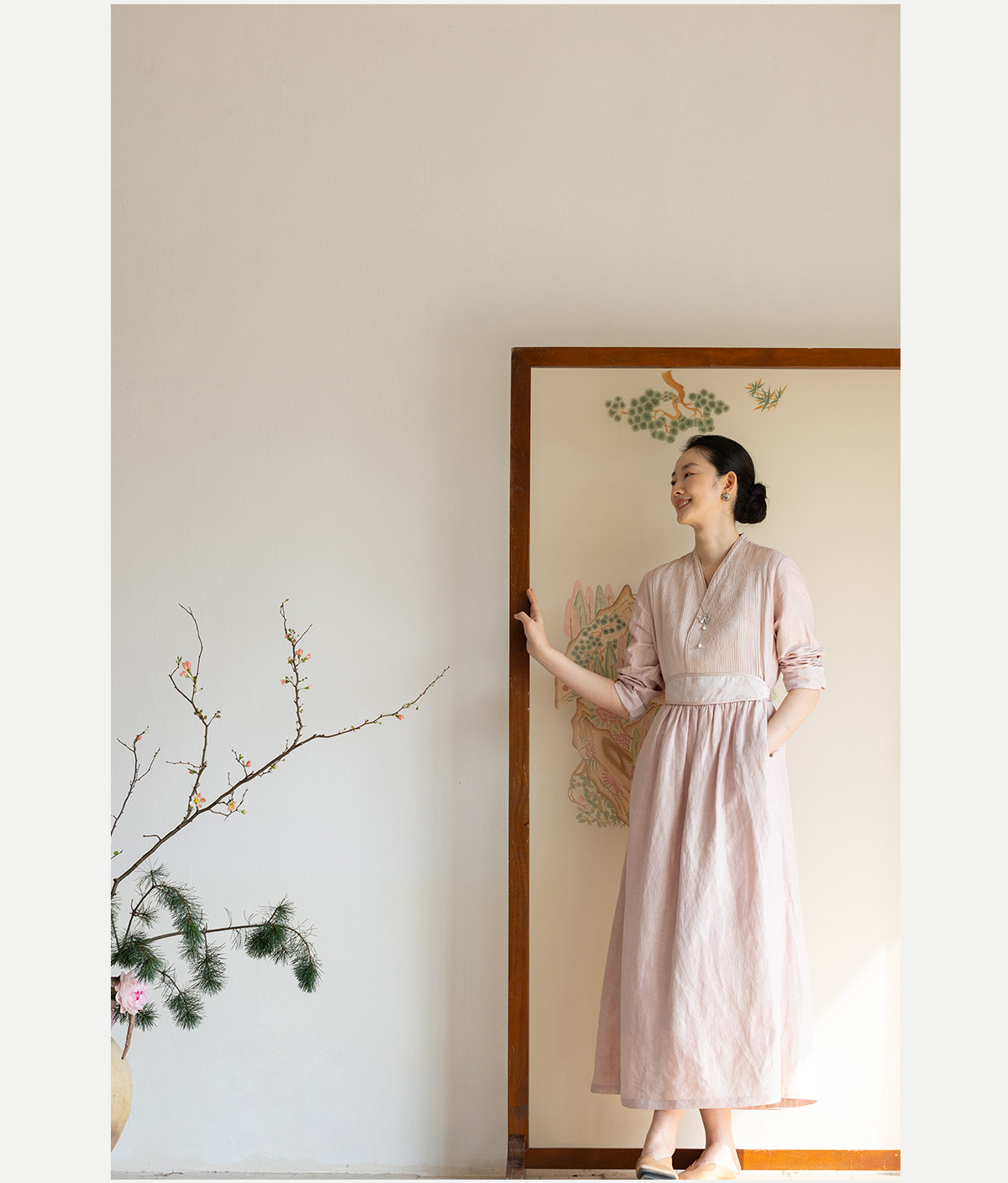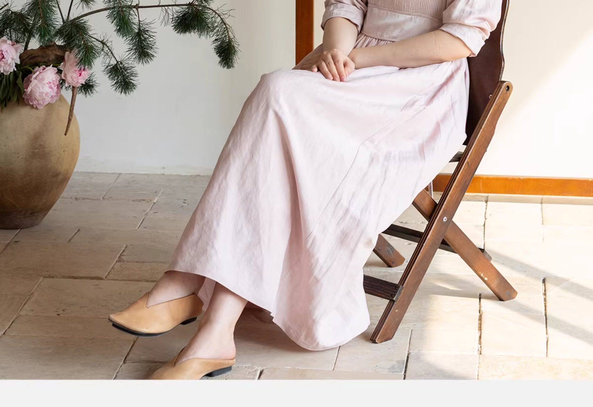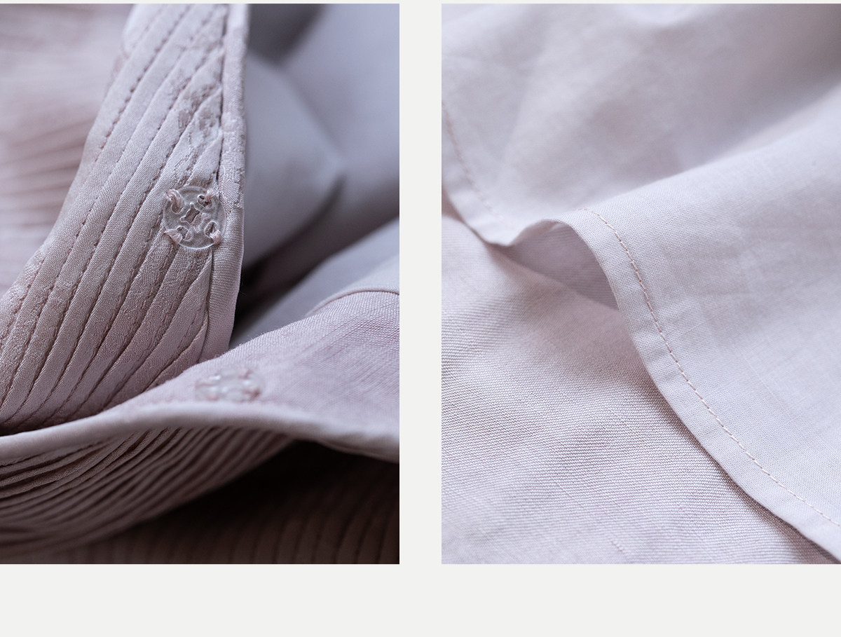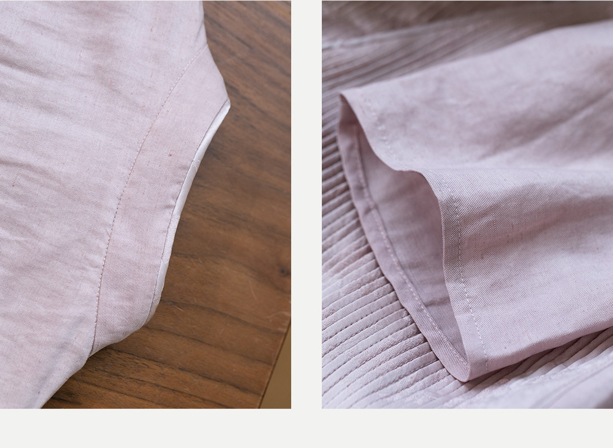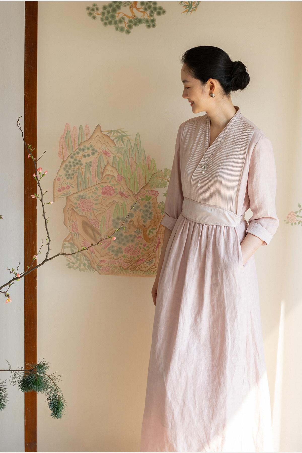 牧衣游原创 32姆米重磅丝麻打条连衣裙新款宽松粉色气质长裙 空谷