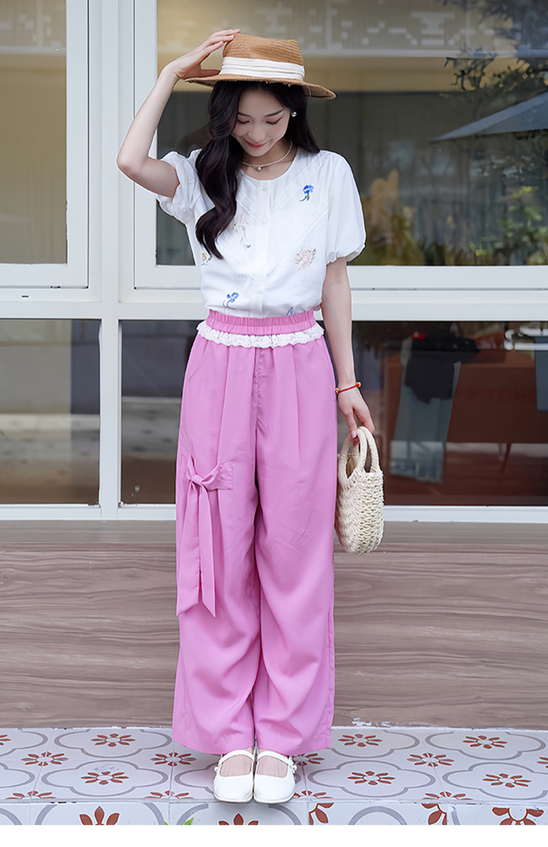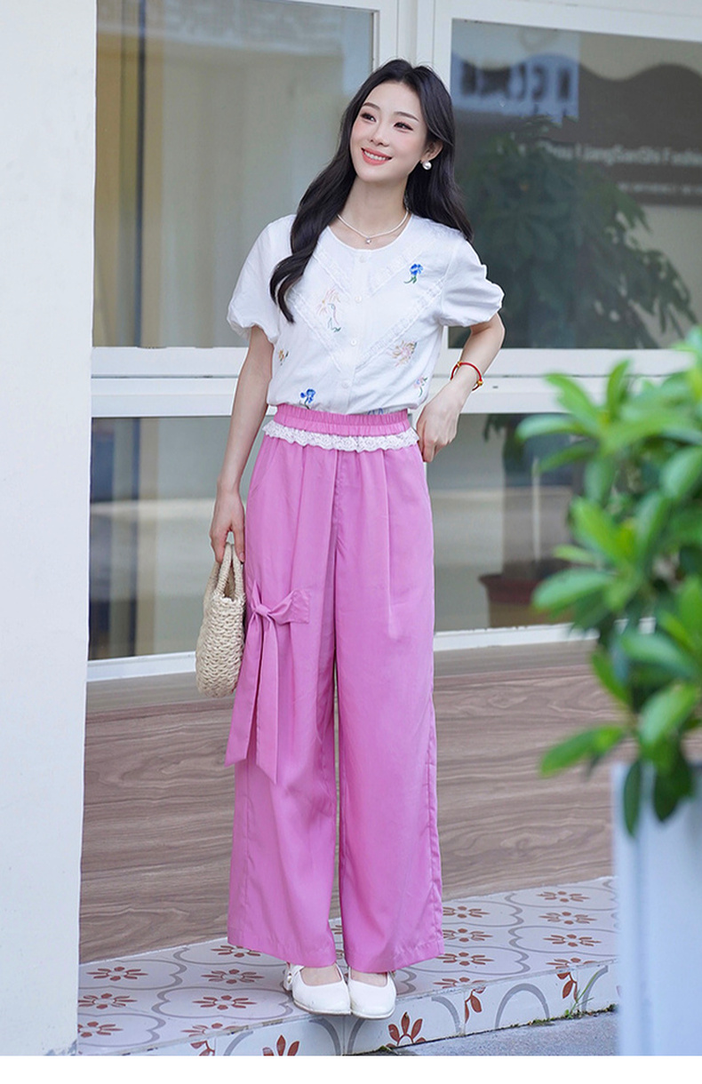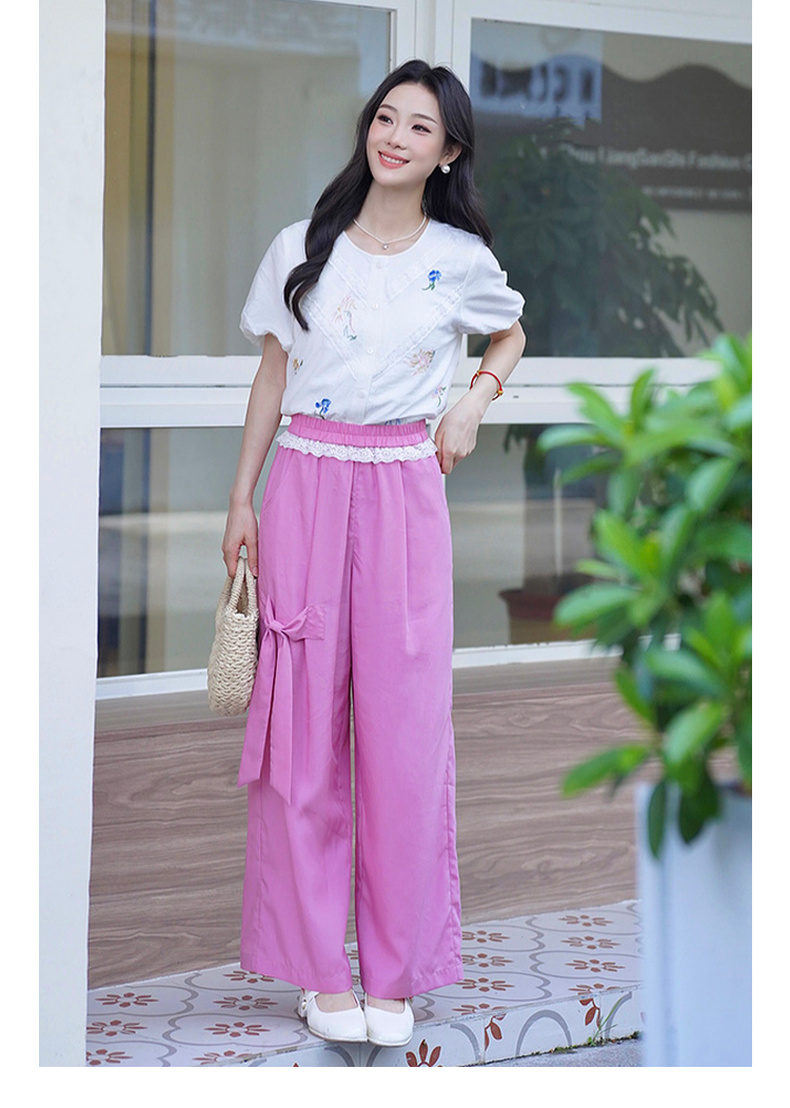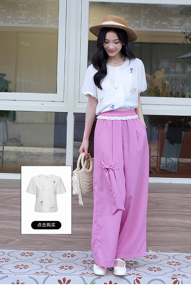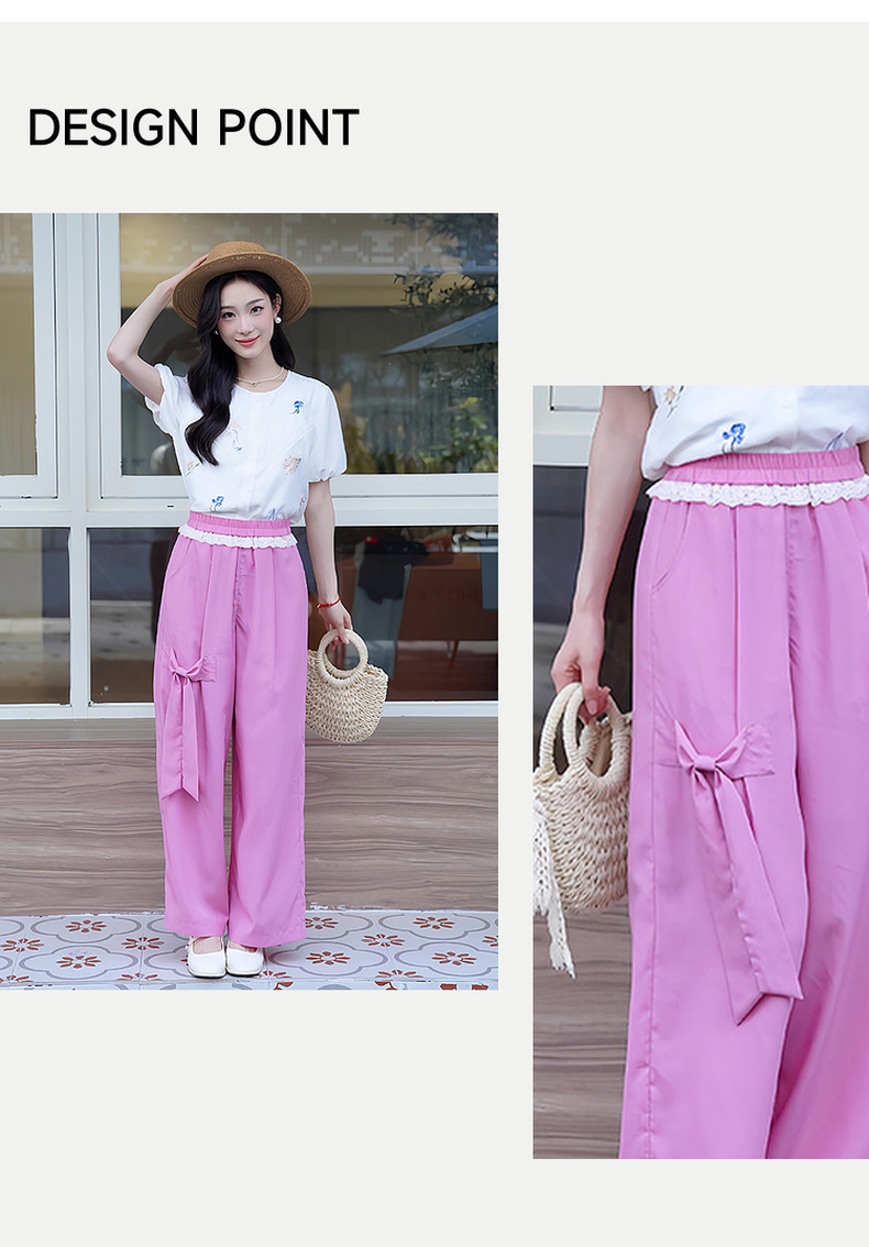 两三事风吟蝶舞2024夏季新款甜美立体蝴蝶结蕾丝拼接阔腿休闲裤女