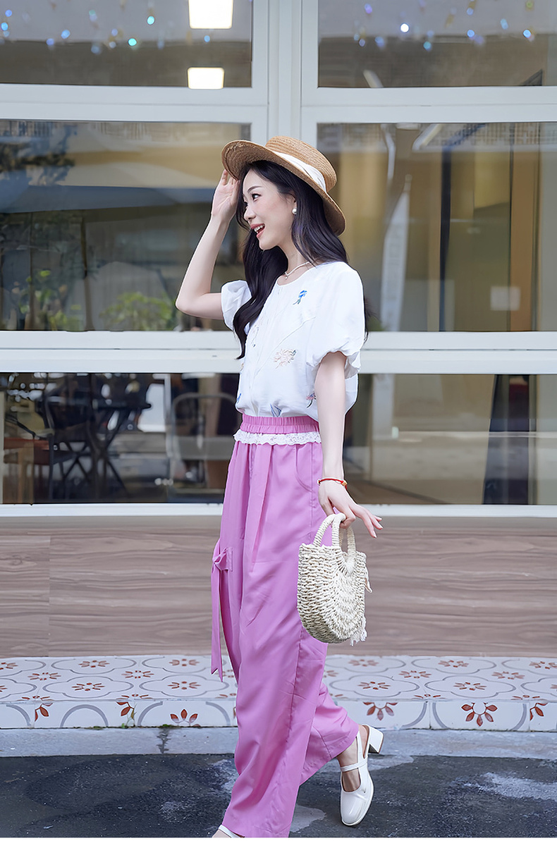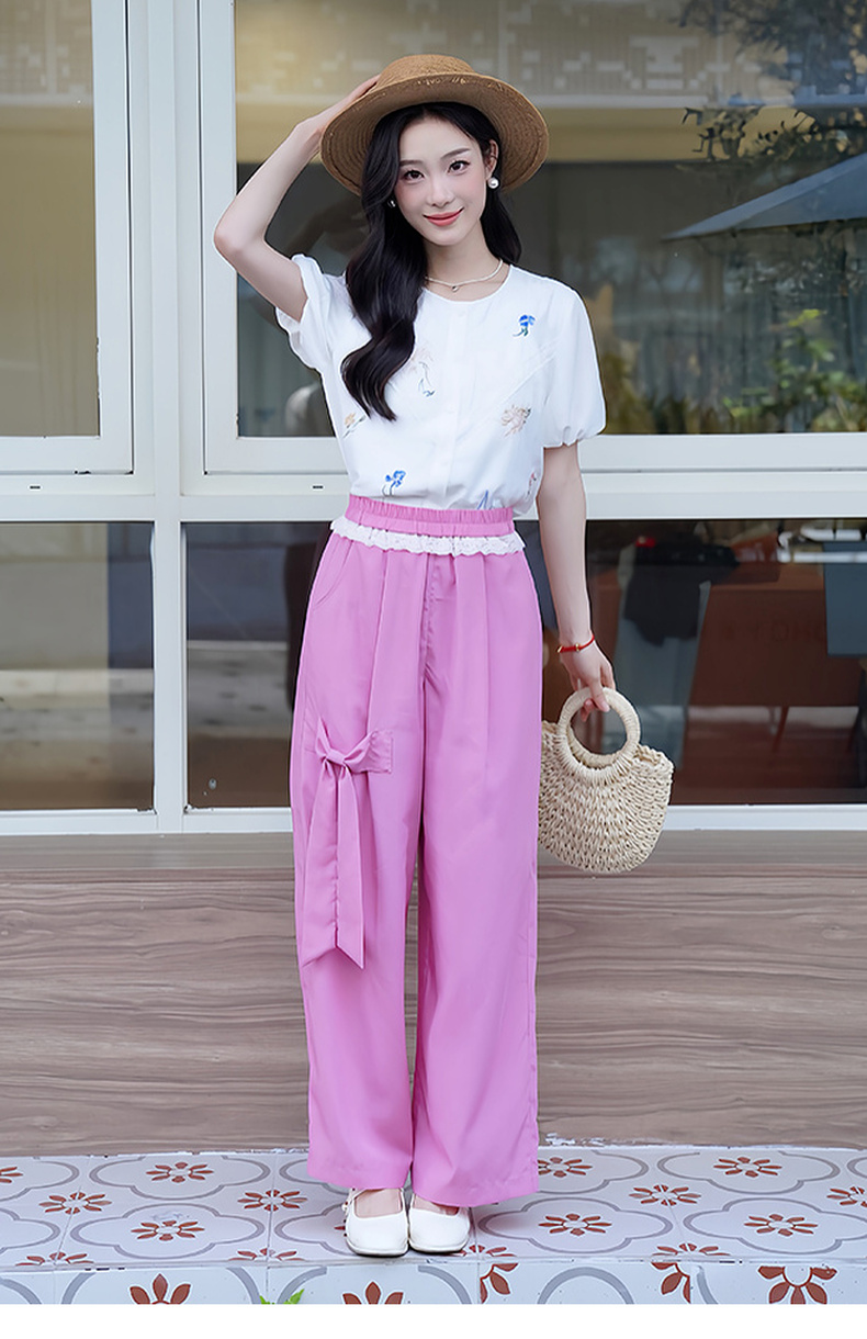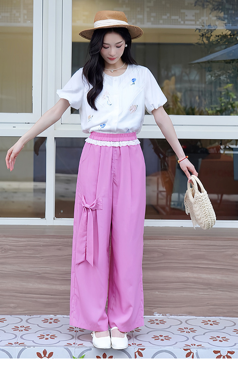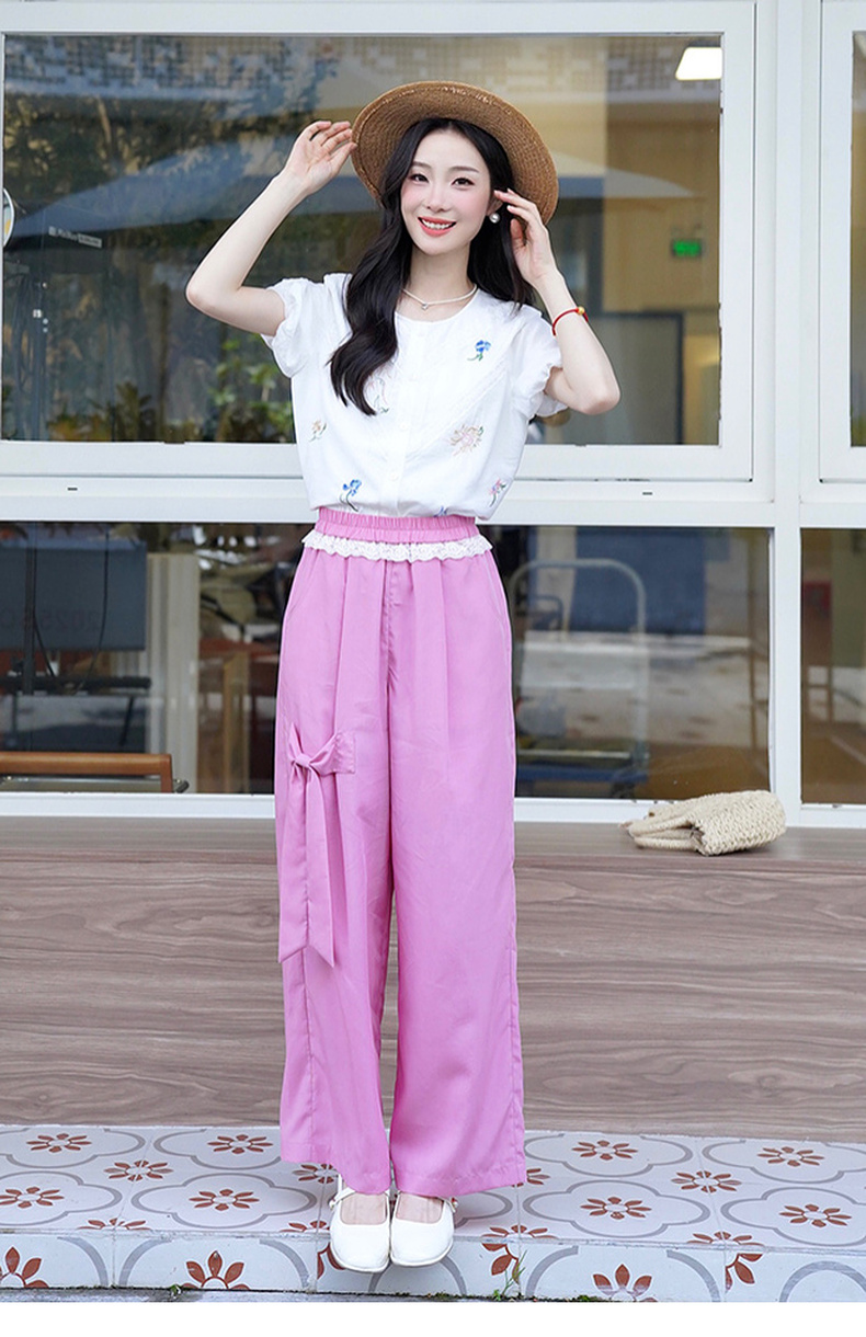 两三事风吟蝶舞2024夏季新款甜美立体蝴蝶结蕾丝拼接阔腿休闲裤女