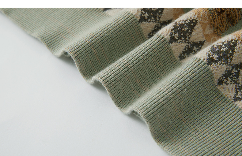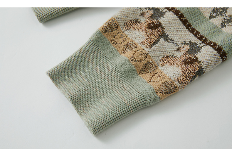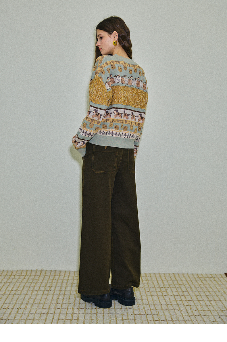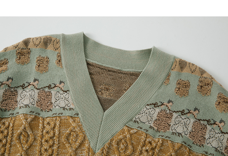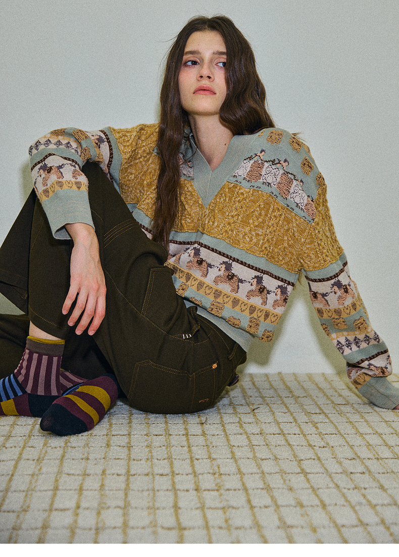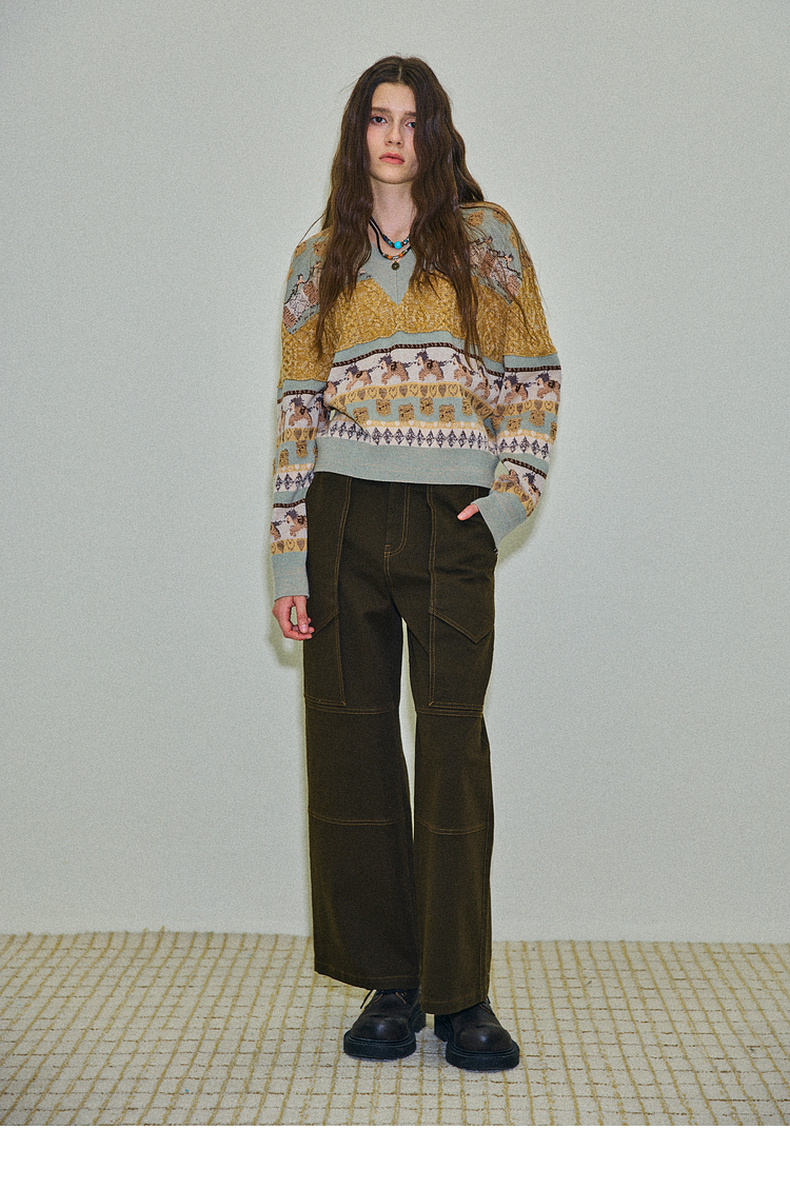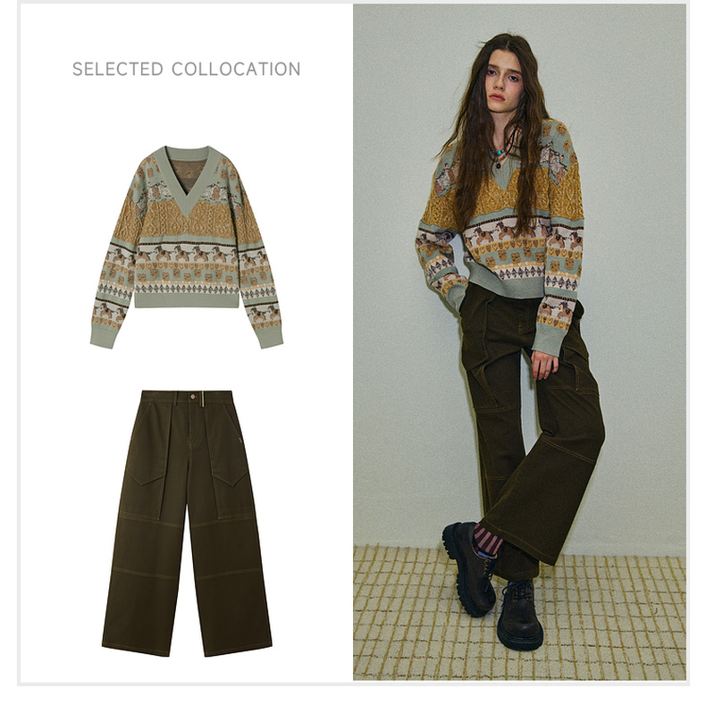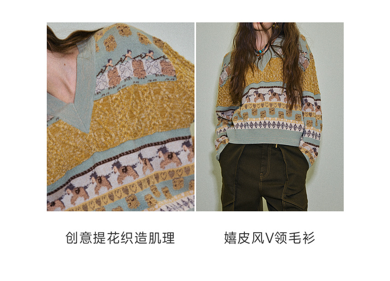 谜底V领套头针织衫长袖2025冬季新品复古原创图案毛衣女254MZ1873