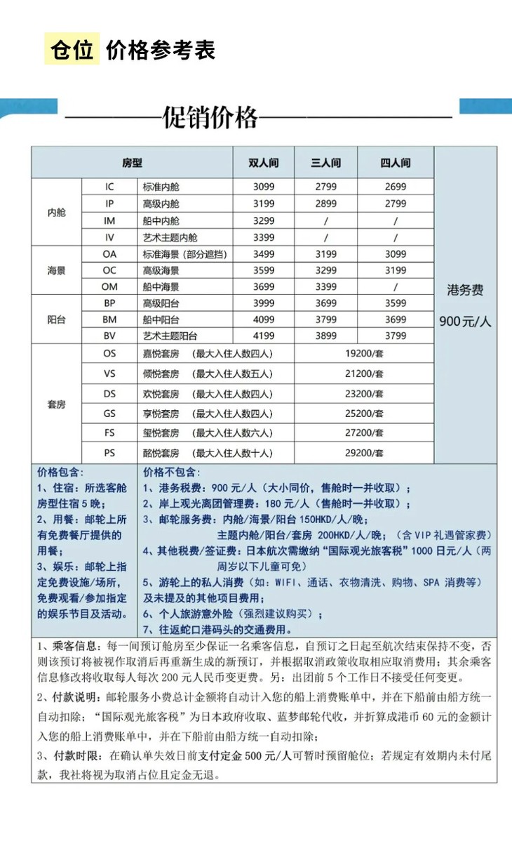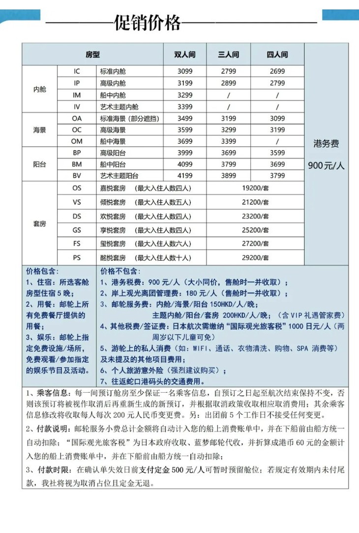 温馨提示:以上价格,不含港务费:900人民币,不含邮轮服务费每晚每人:150/200港币(根据仓位不同价格不同),不含国际观光旅客税:1000日元,不含岸上观光离团费:180人民币;价格仅为参考,具体可以进群咨询或添加掌柜了解更多。