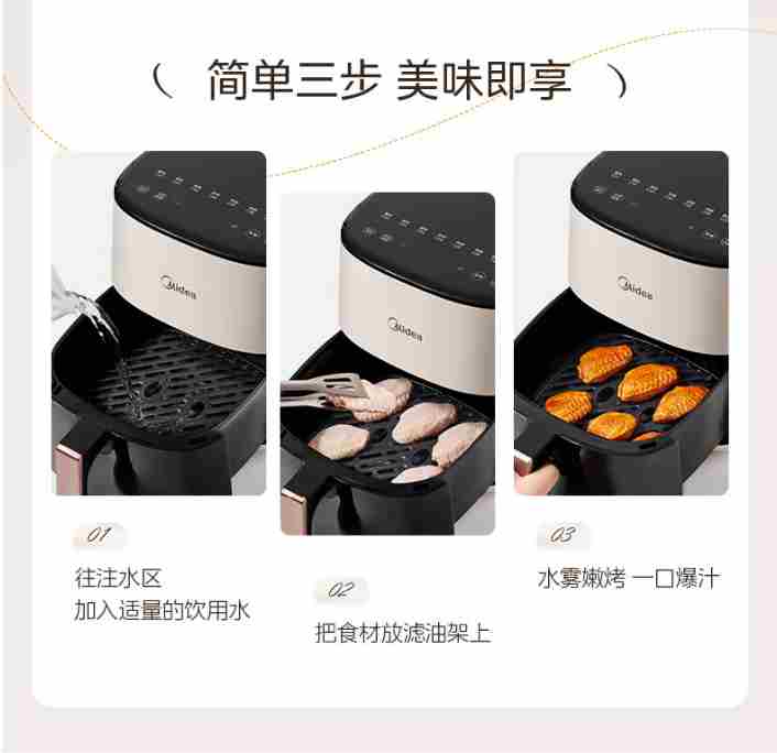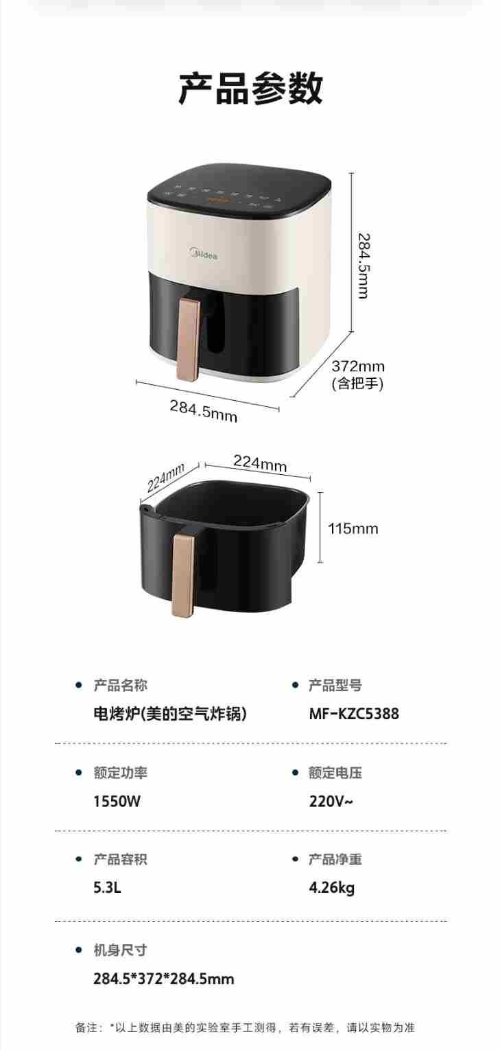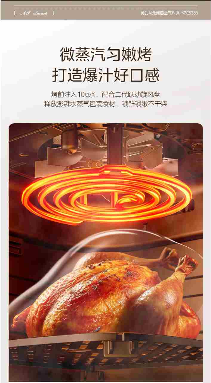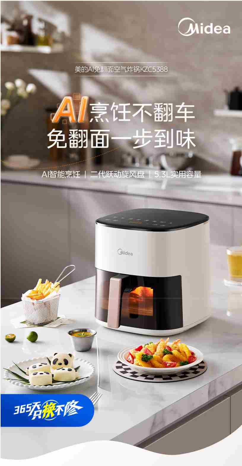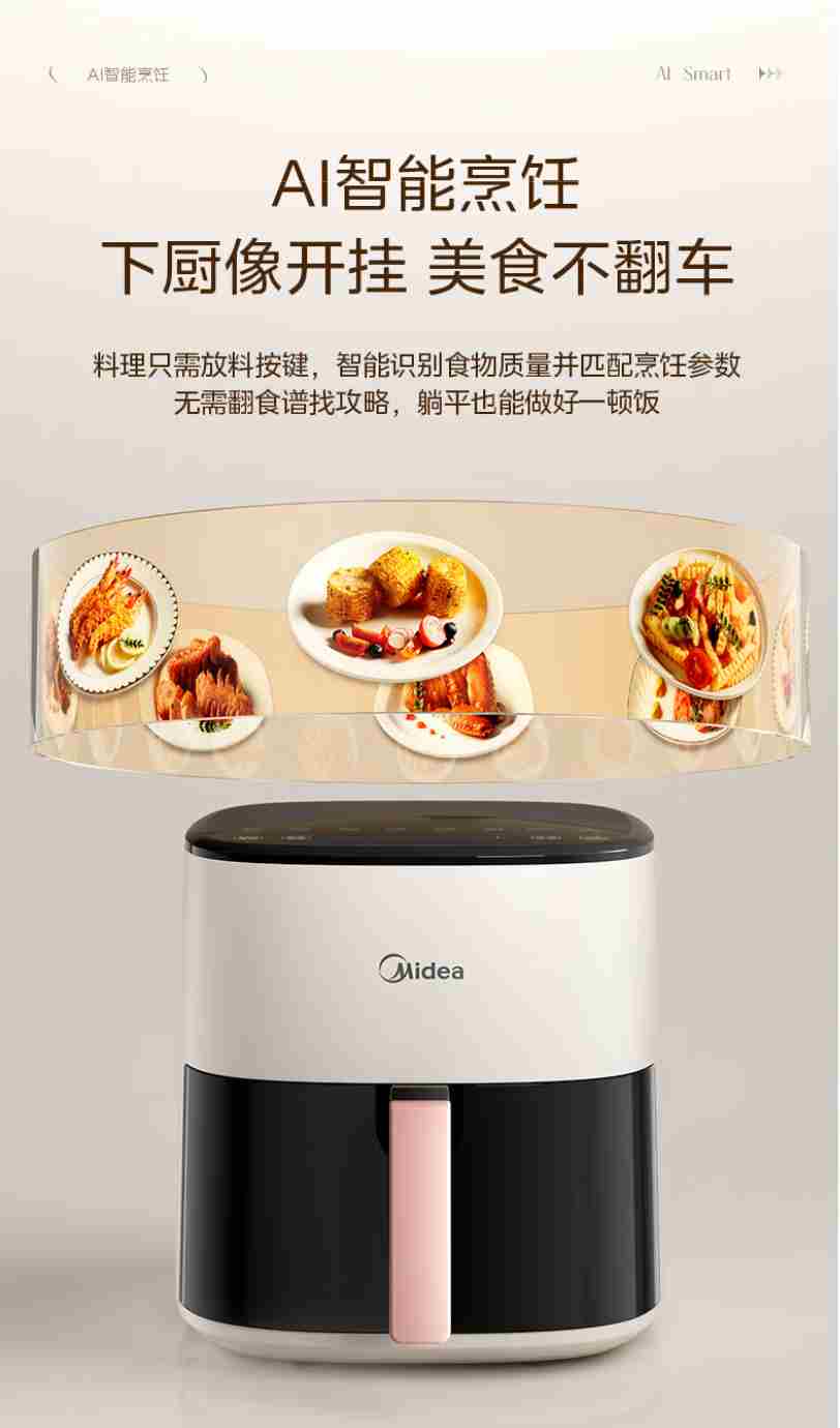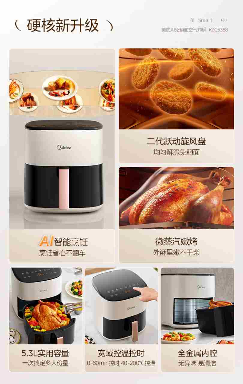 美的(Midea)家用空气炸锅免翻面大容量 可视窗口 蒸汽嫩炸 金属内腔 多功能 智能定时无油低脂煎炸 【AI智能烹饪】 5.3L