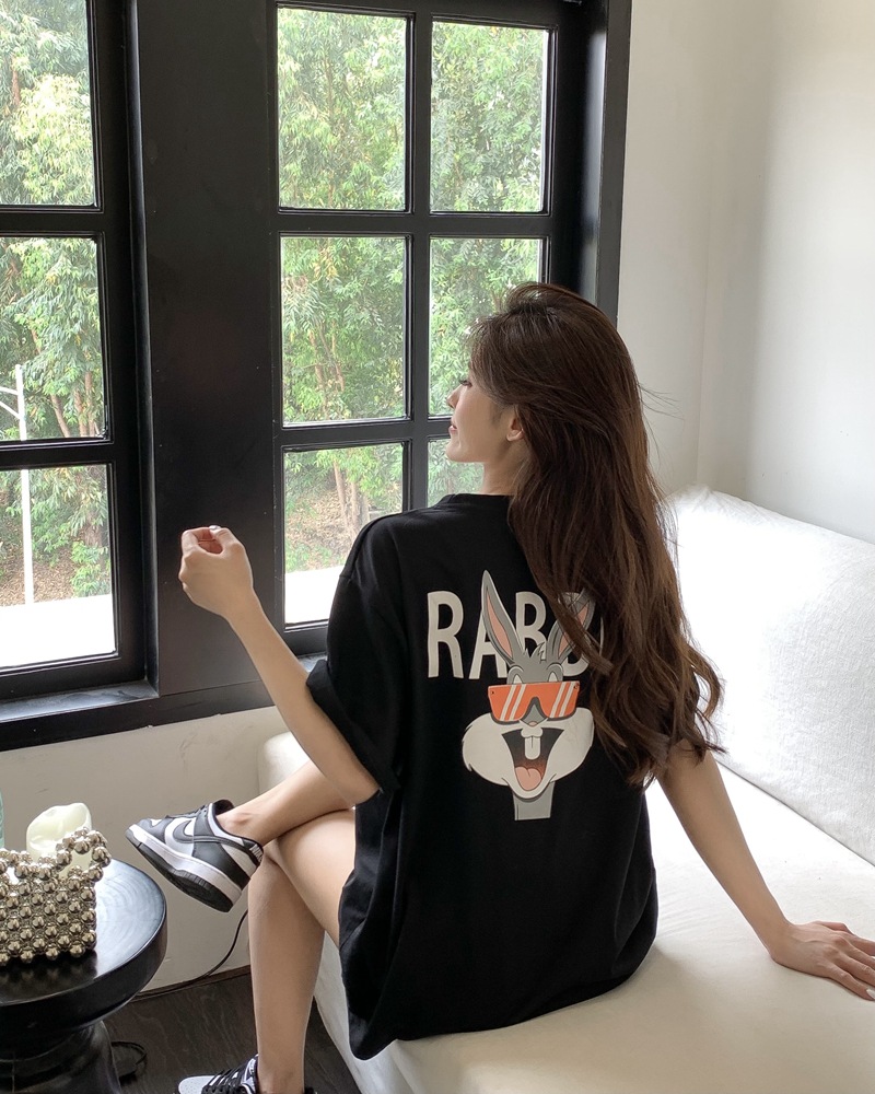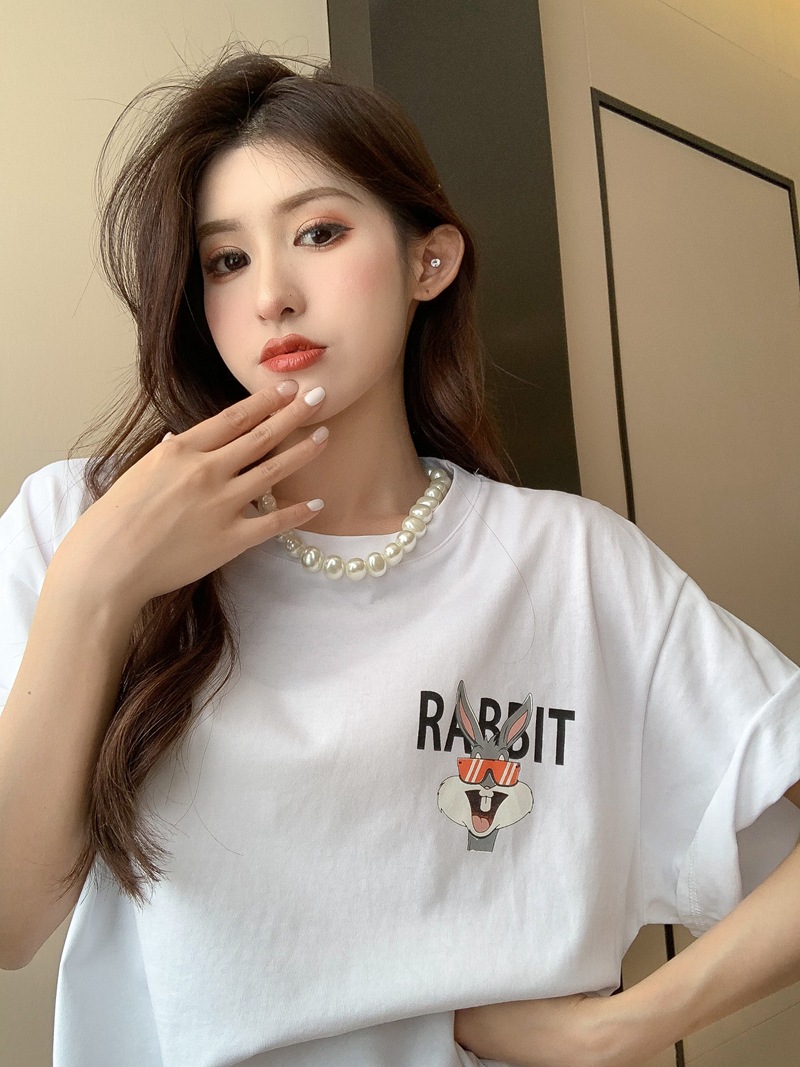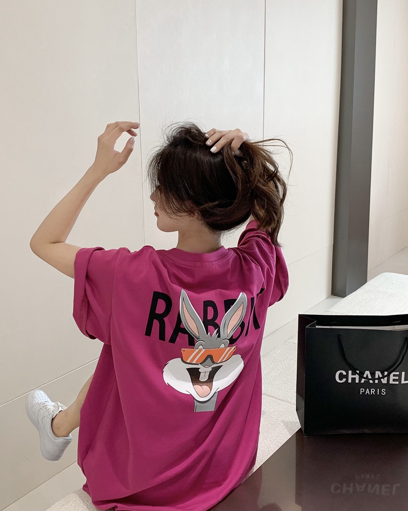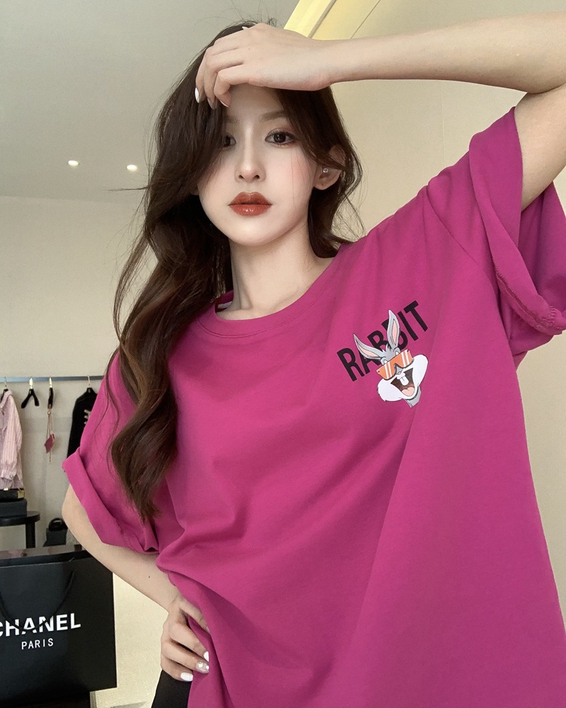 火龙果色纯棉t恤【甜妹风纯欲】女夏季中长款宽松大版 兔子上衣玫红下身失踪半袖 超火短款学生上衣