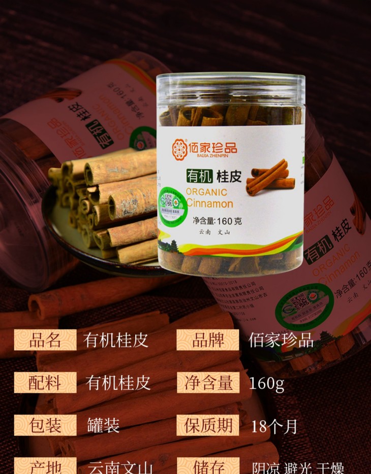 有机桂皮 160g 佰家珍品云南有机桂皮棒肉桂干货红酒精选去皮160g卤肉调料香料支持自提
