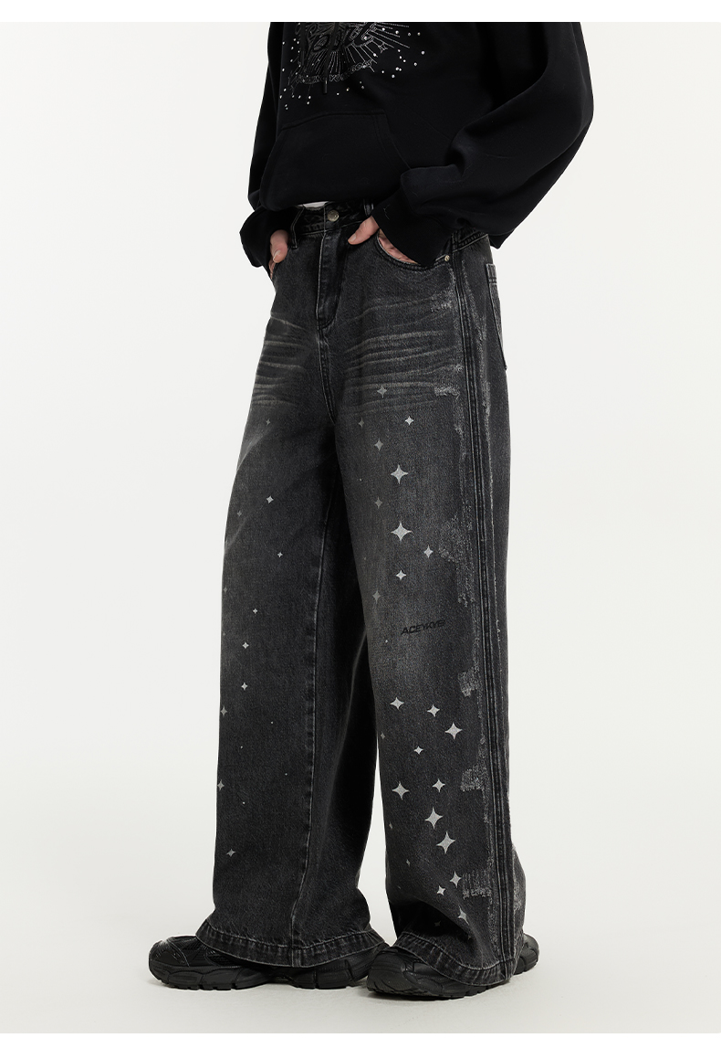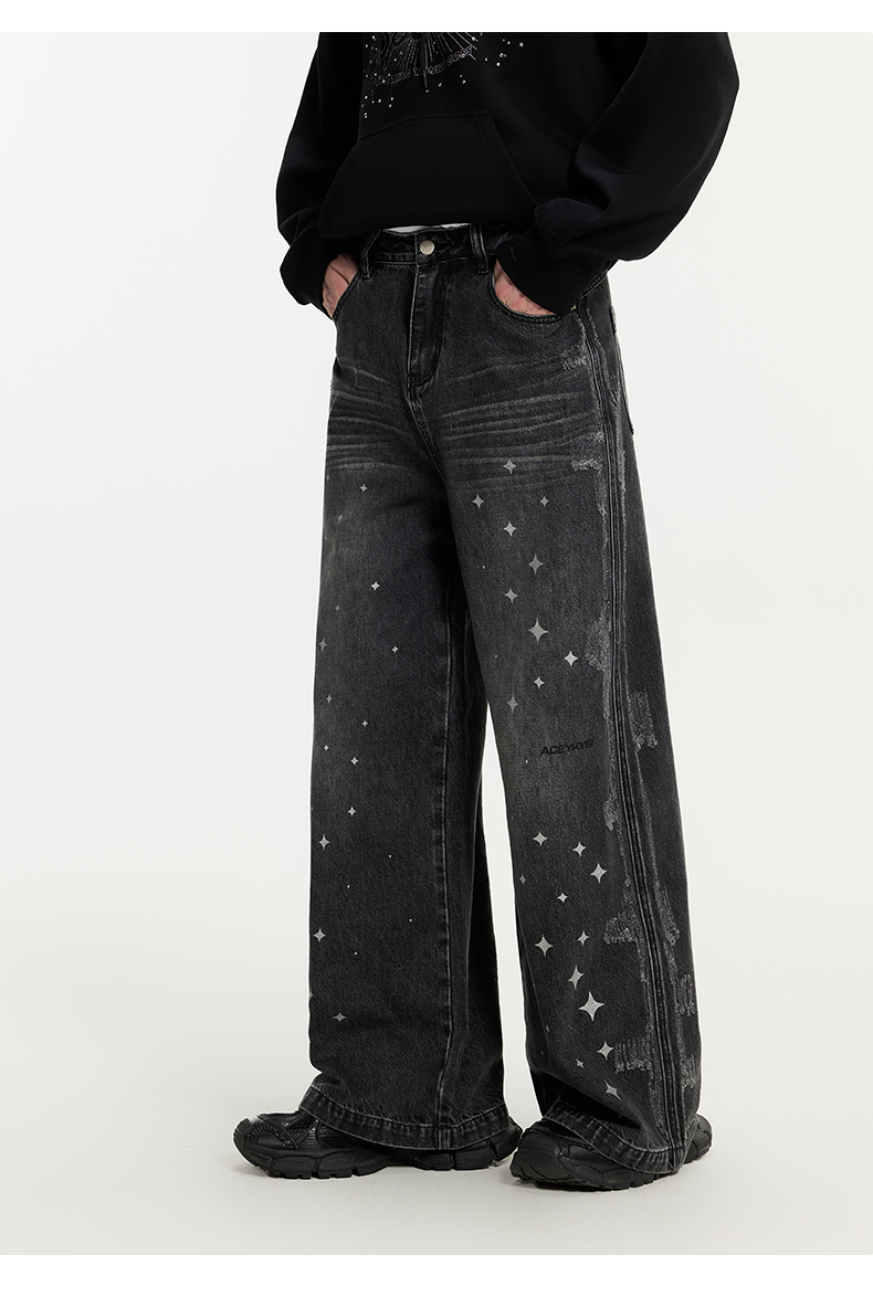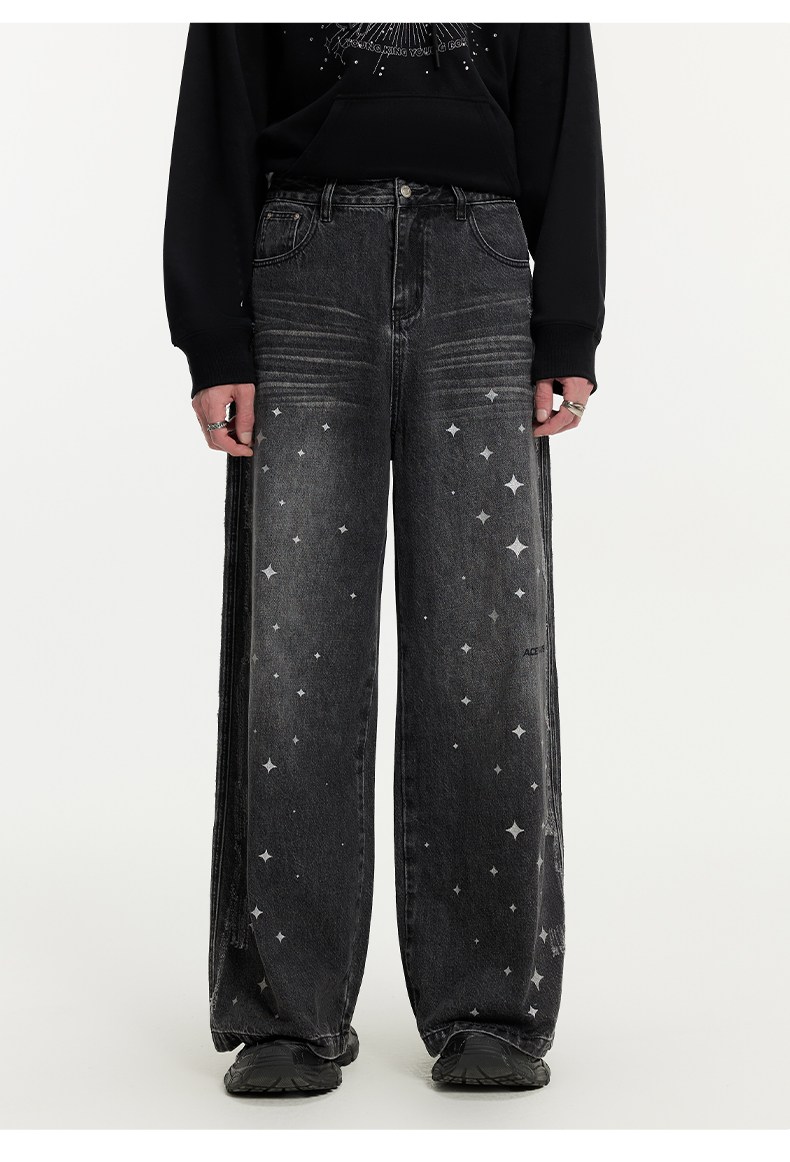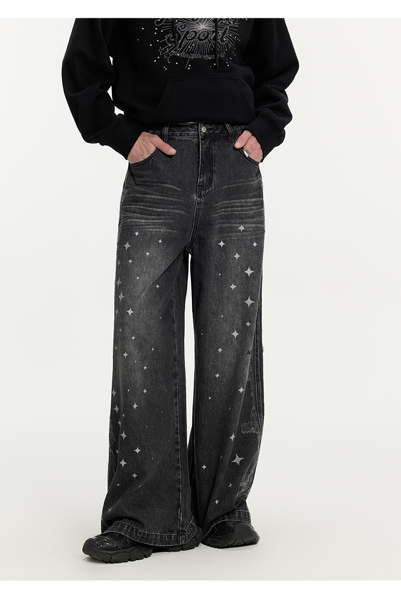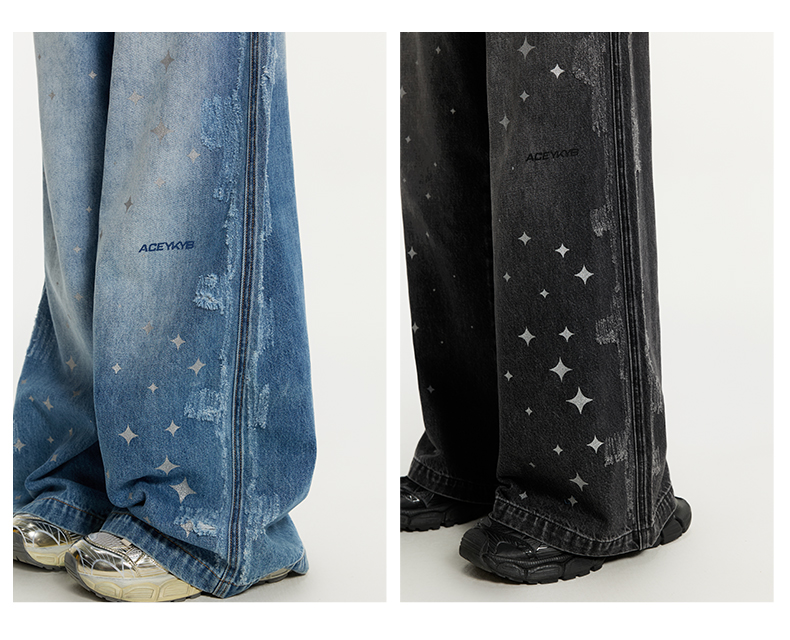 YKYB黄子韬 潮流美式复古宽松直筒牛仔裤 设计亮钻细闪休闲长裤秋