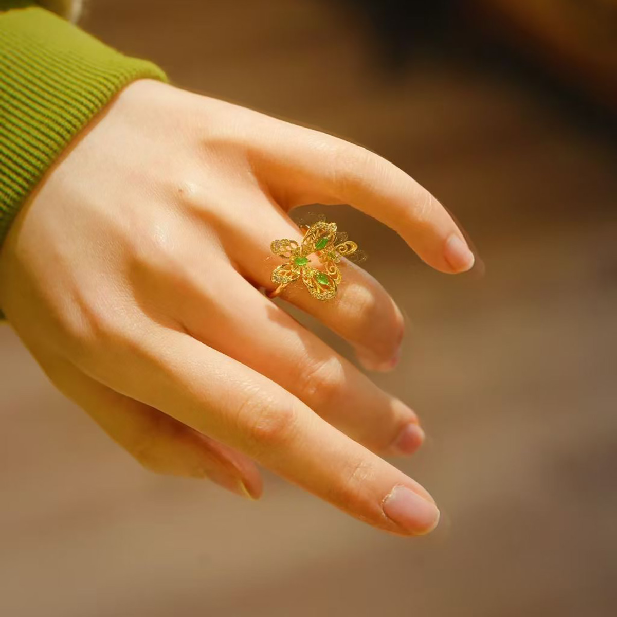 龢盒原创 银镶冰绿翡翠蝴蝶耳钉戒指
