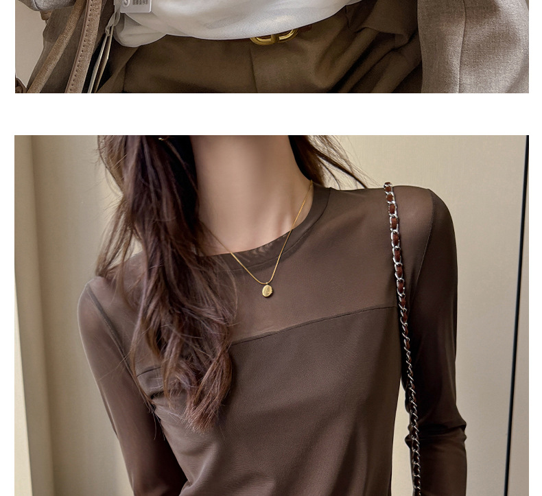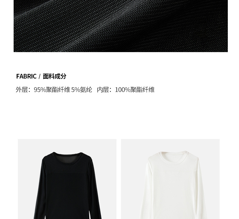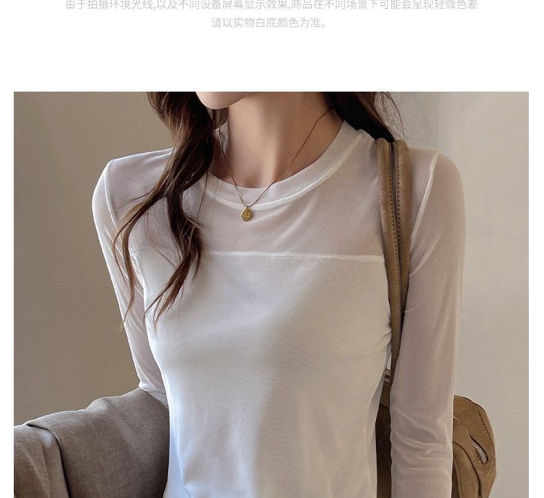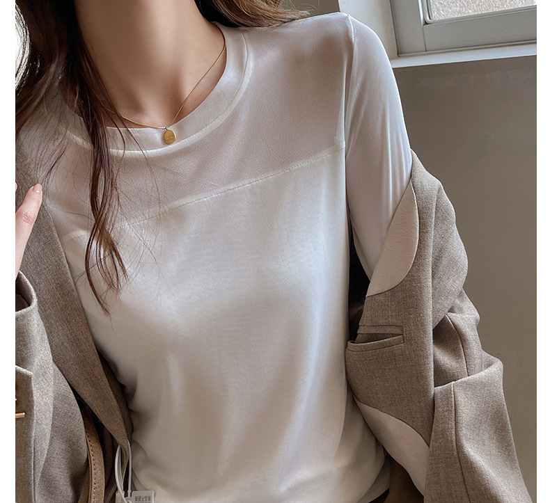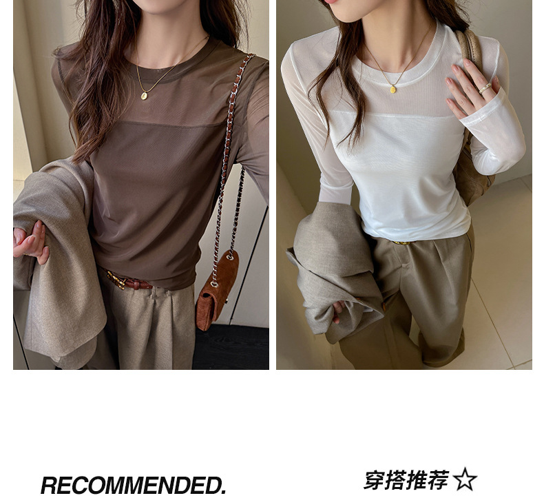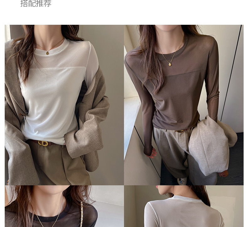 早秋新款2025新款秋冬圆领网纱拼接打底衫女内搭高级感长袖修身设计感上衣