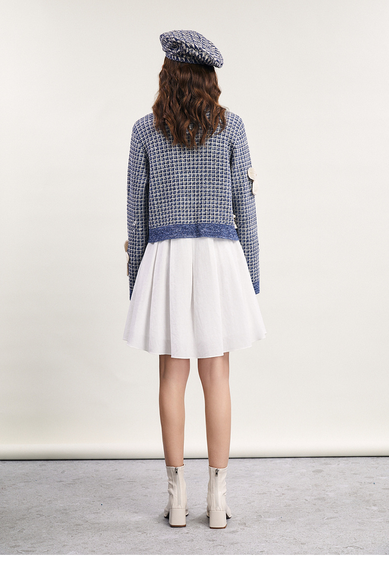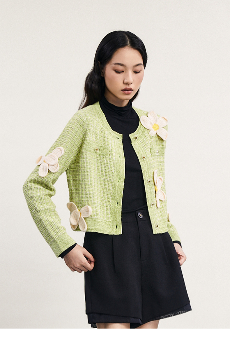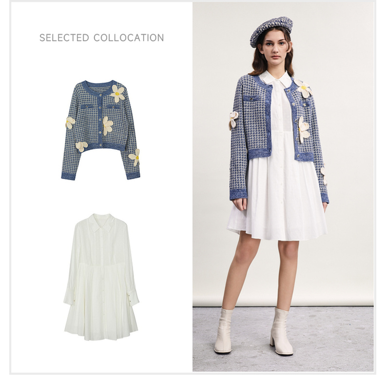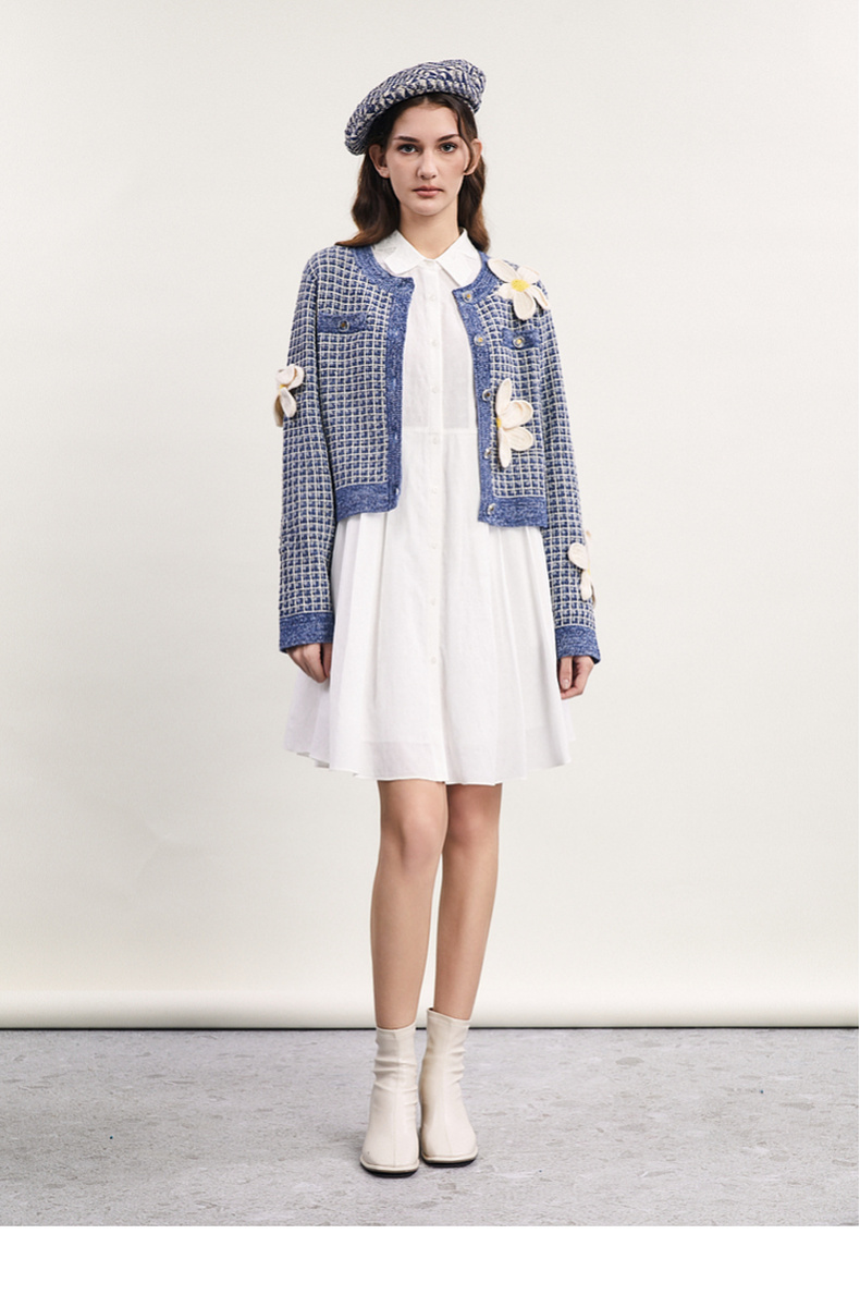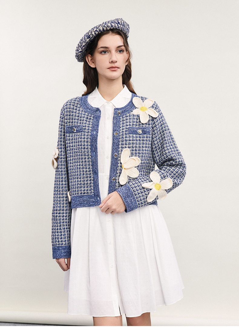 谜底短款针织开衫女2024春新款小香风花朵绣花格纹毛衫241MZ0311