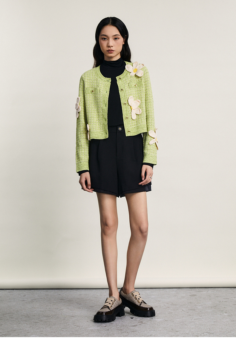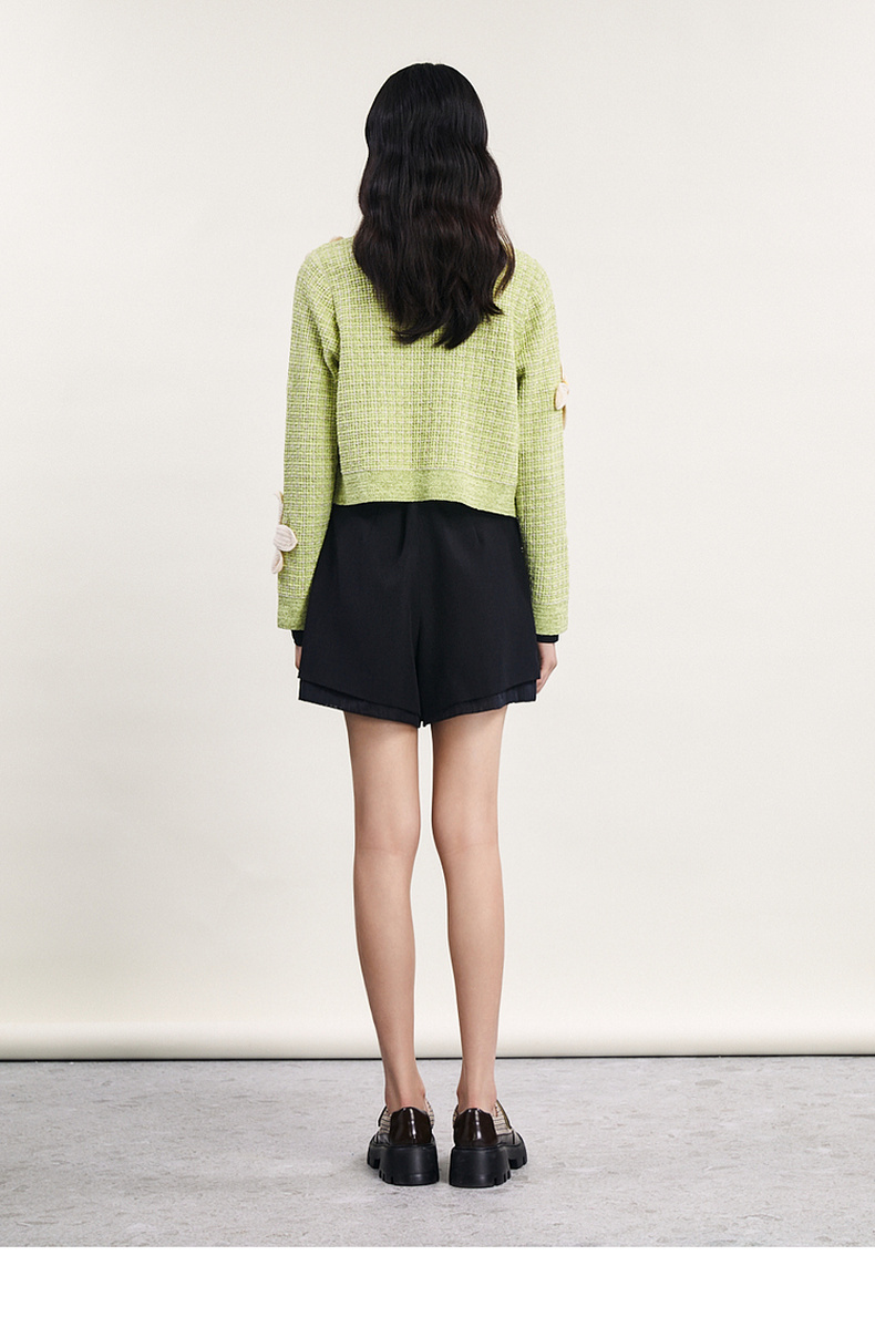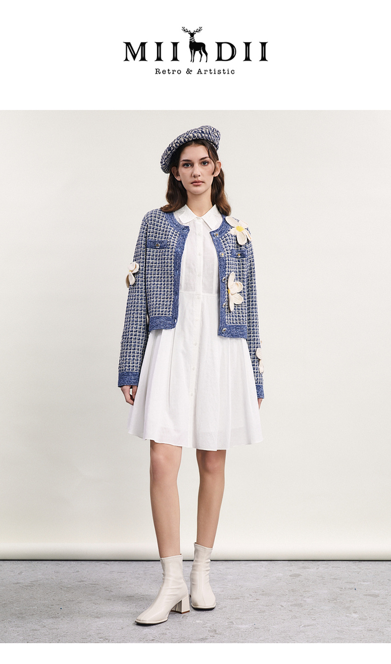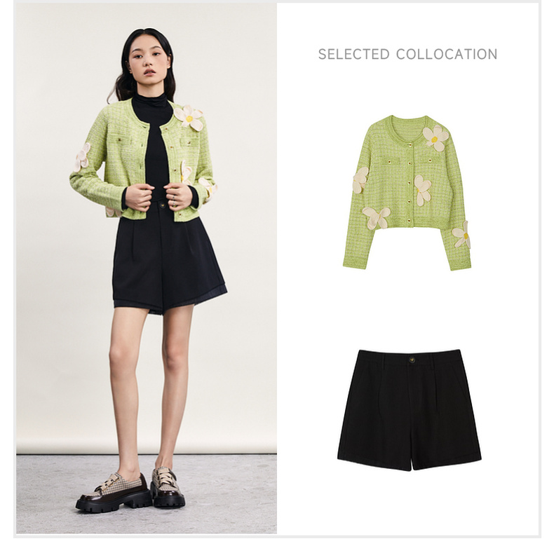 谜底短款针织开衫女2024春新款小香风花朵绣花格纹毛衫241MZ0311