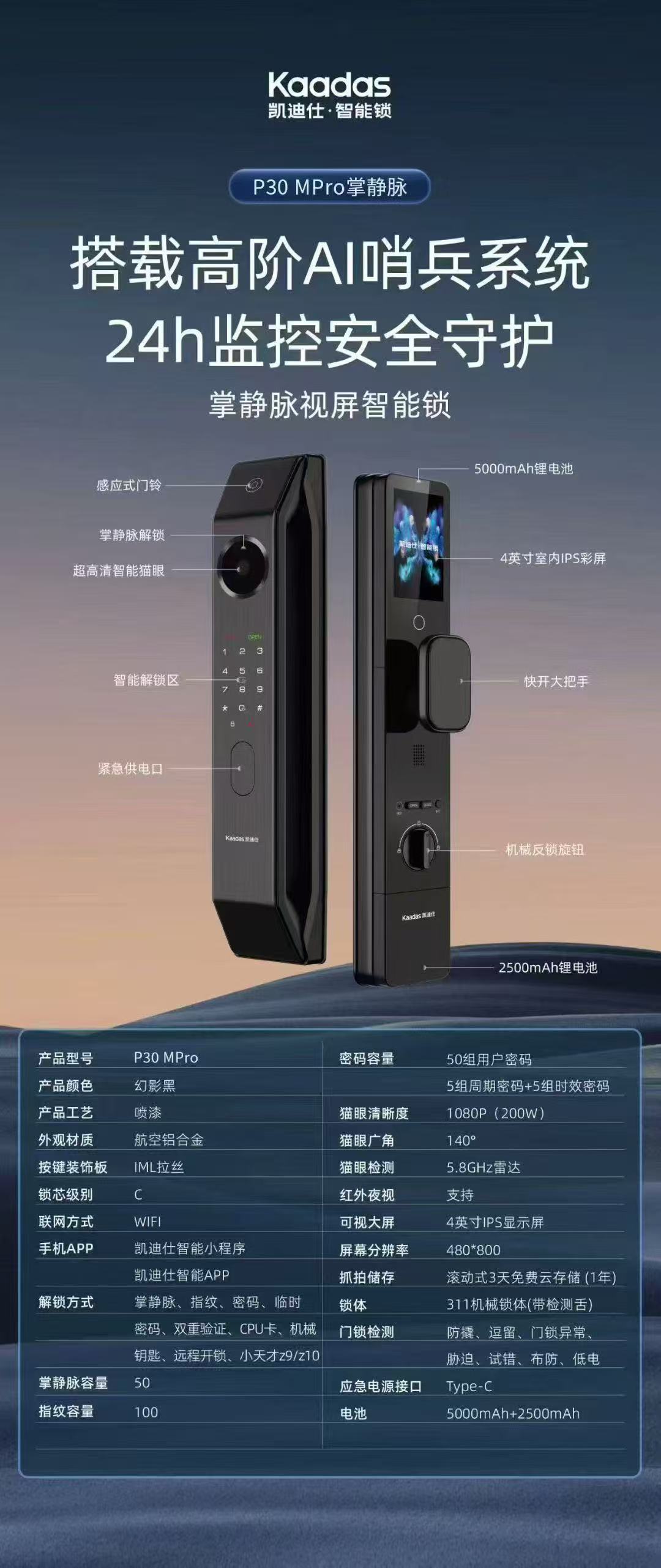 凯迪仕P30MPro 【春季焕新】智能门锁 掌静脉 可视猫眼 语音对讲 电子指纹锁 KDS