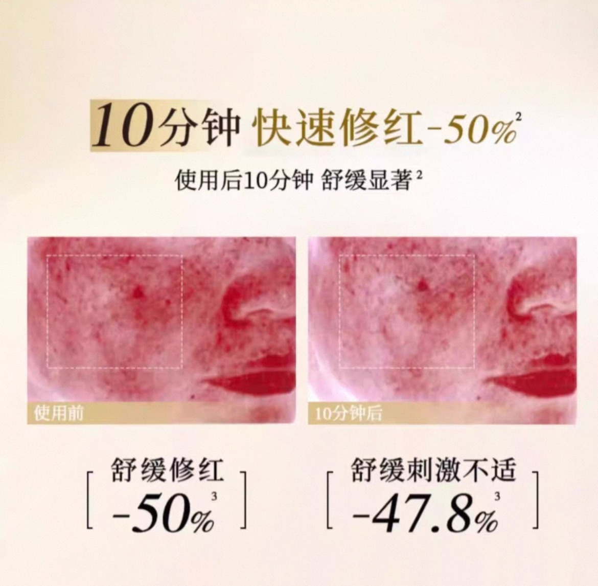 它能够10分钟快速修红50%,改善面部不适状况,并且坚持使用28天能够做到很好的抗皱修护
