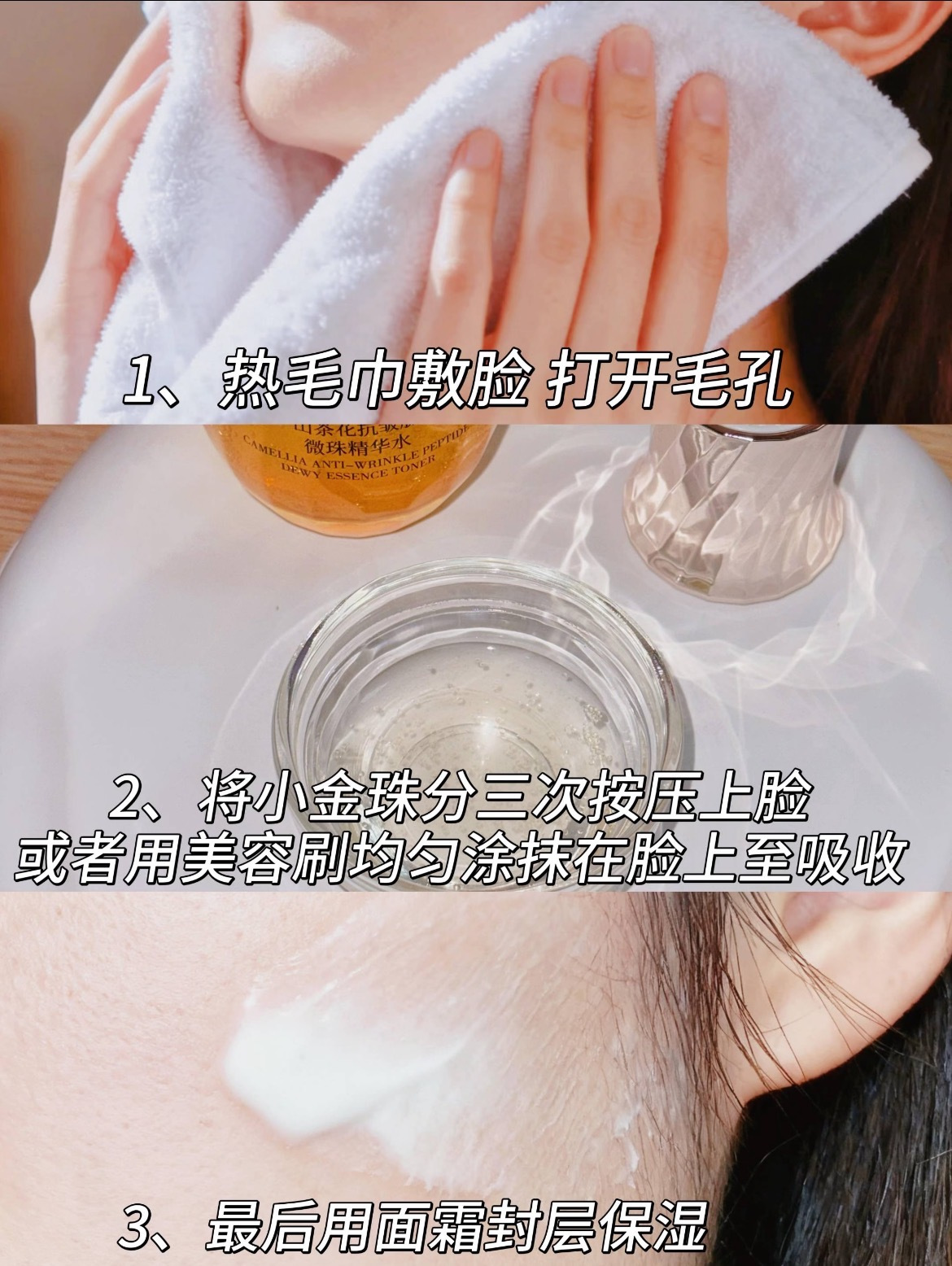 ①小金珠先拍三次,第1次作为基础补水,第2次是更深层滋养,第3次皮肤已经很饱和了,就ok。