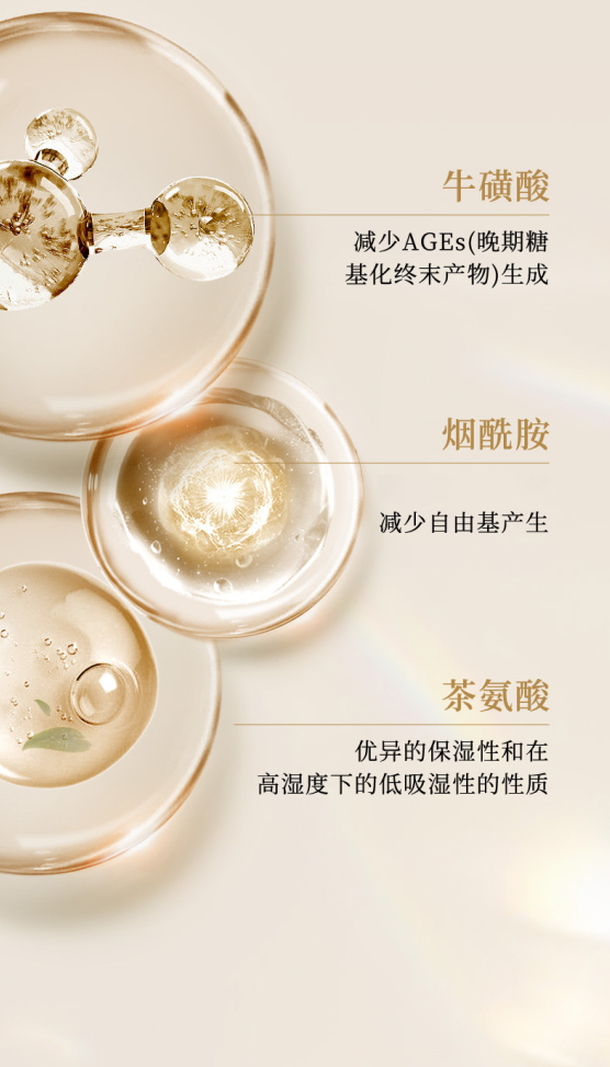 协同3大当红成分——牛磺酸、烟酰胺、茶氨酸,抗糖不暗沉,提亮肤色,保湿补水