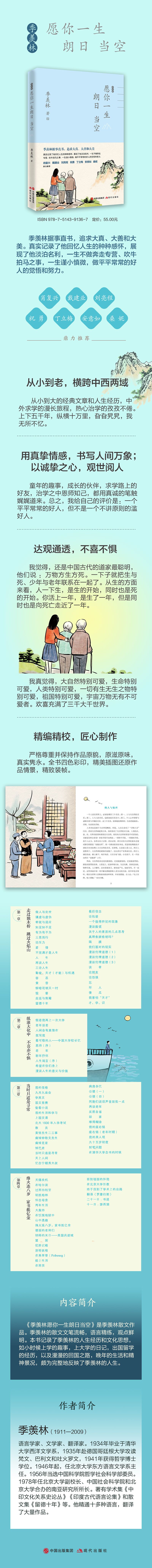 《季羡林愿你一生朗日当空》是季羡林的散文作品。季羡林的散文文笔流畅,语言精练,观点鲜明。本书记录了季羡林的人生经历和文化思想,如小时候上学的趣事,上大学的日记,出国留学的经历,以及漫漫的回国之路,晚年的生活和精神景况,颇为完整地反映了季羡林的人生。
