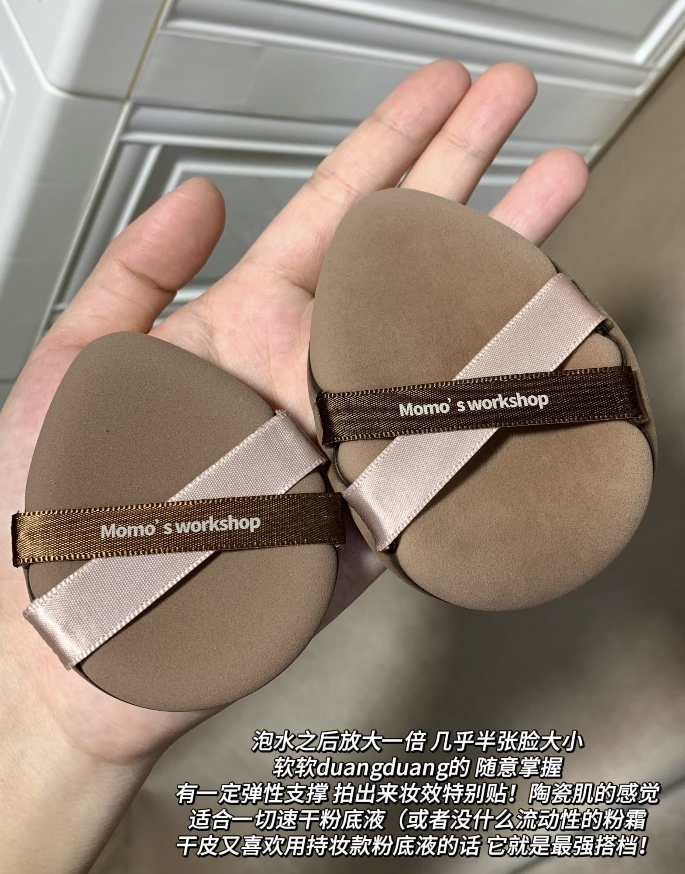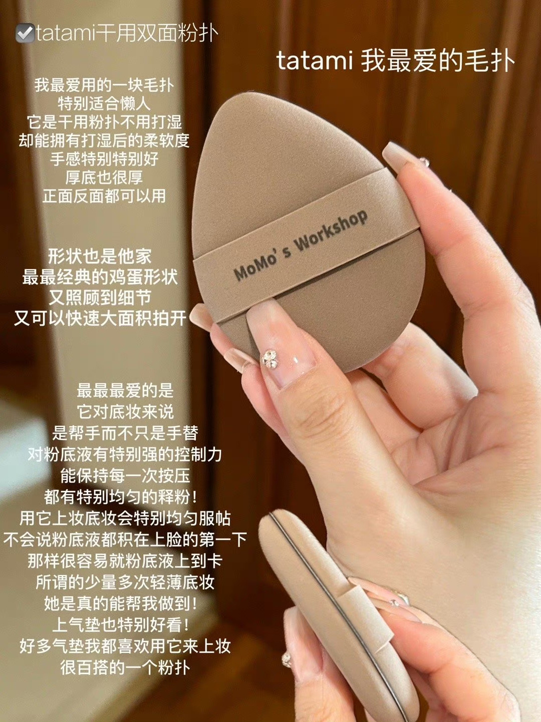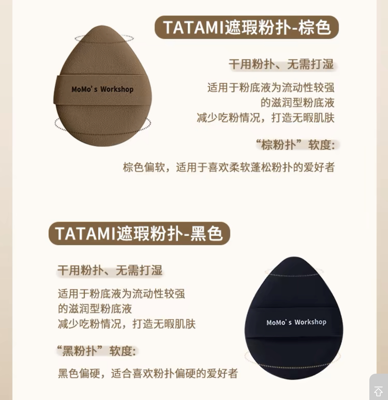 Tatami粉扑适合上流动性较强的粉底/遮瑕,干用粉扑,遇水不变大,打造无暇底妆,比一般的粉扑都要大点!!