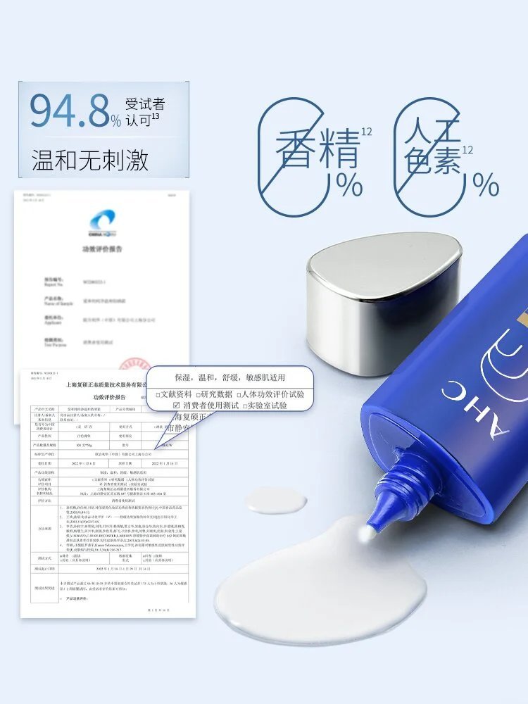 AHC小蓝瓶防晒霜,成分中含有山茶花,马齿苋,等多种植物萃取物,明星成分透明质酸,深入肌肤