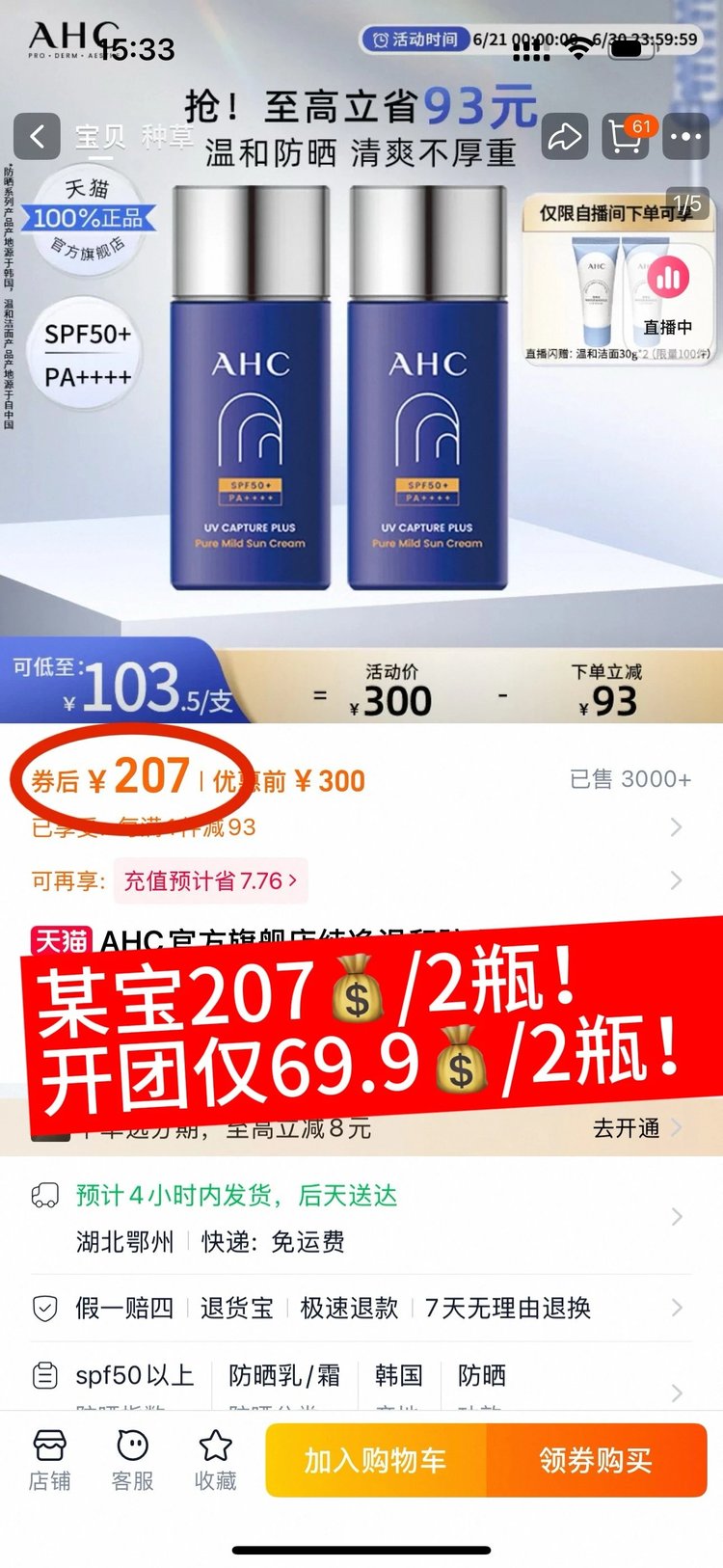现49.9两瓶!!!一百不到就能买到两瓶防晒,还在等啥!!!